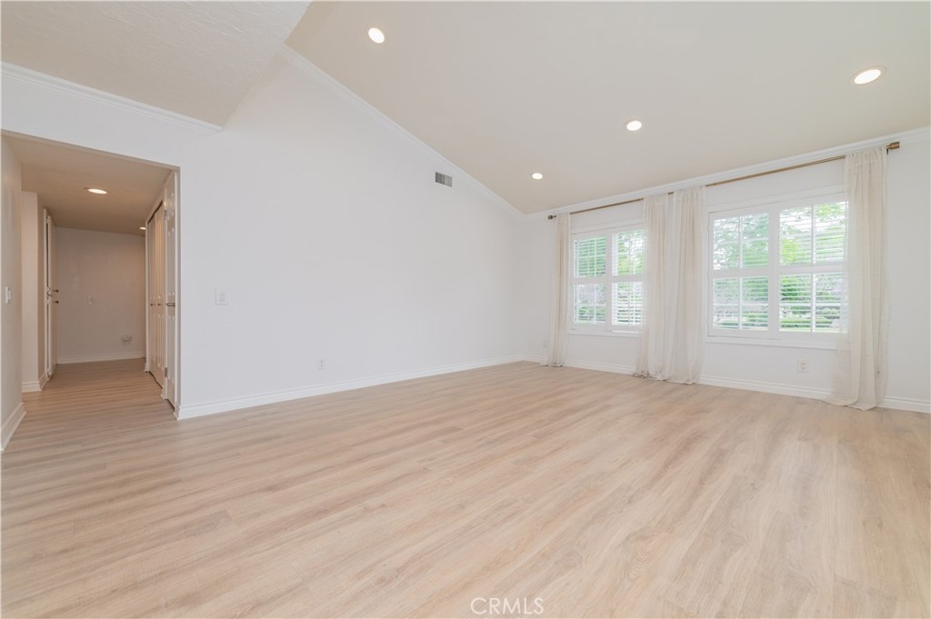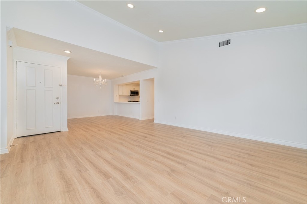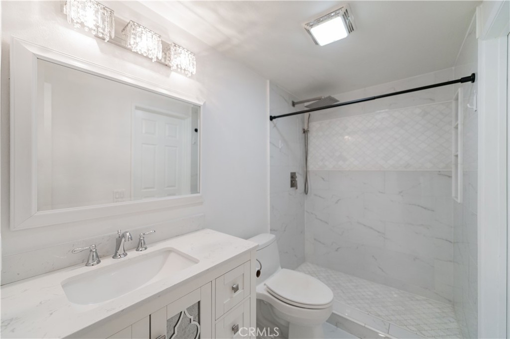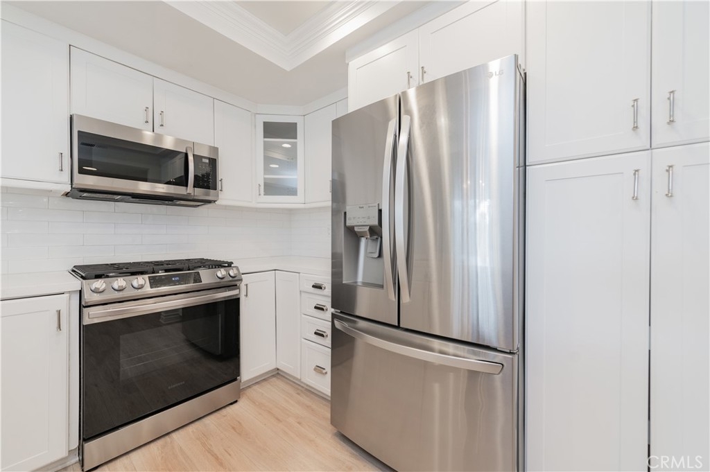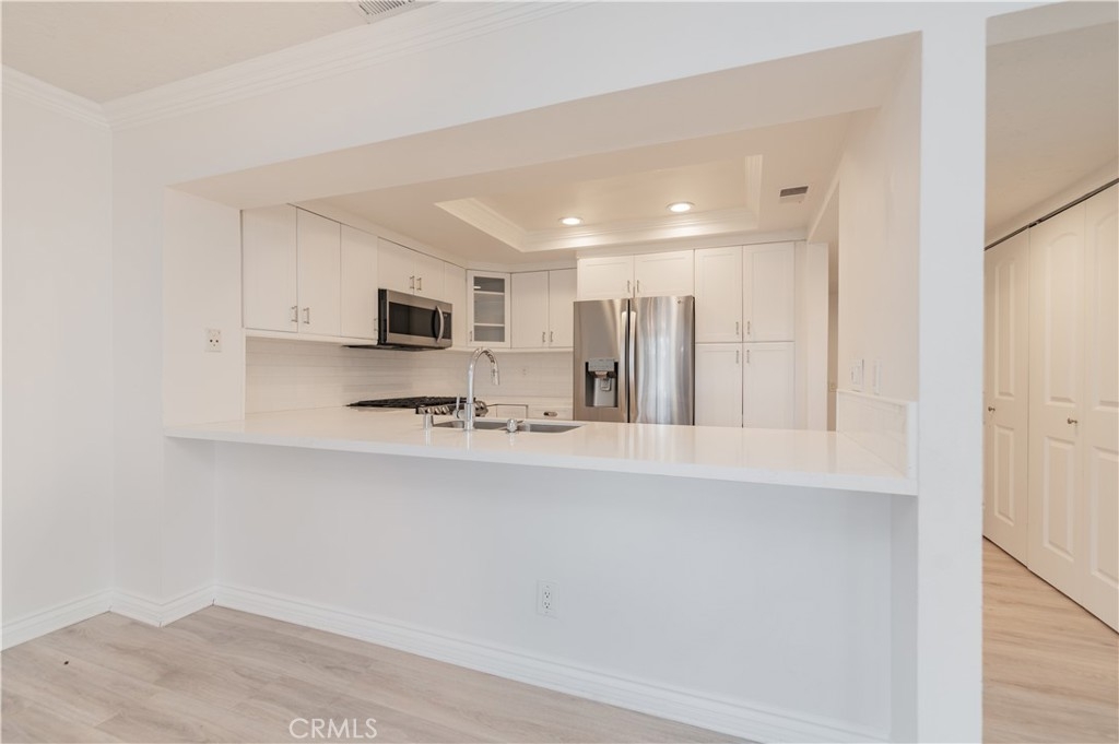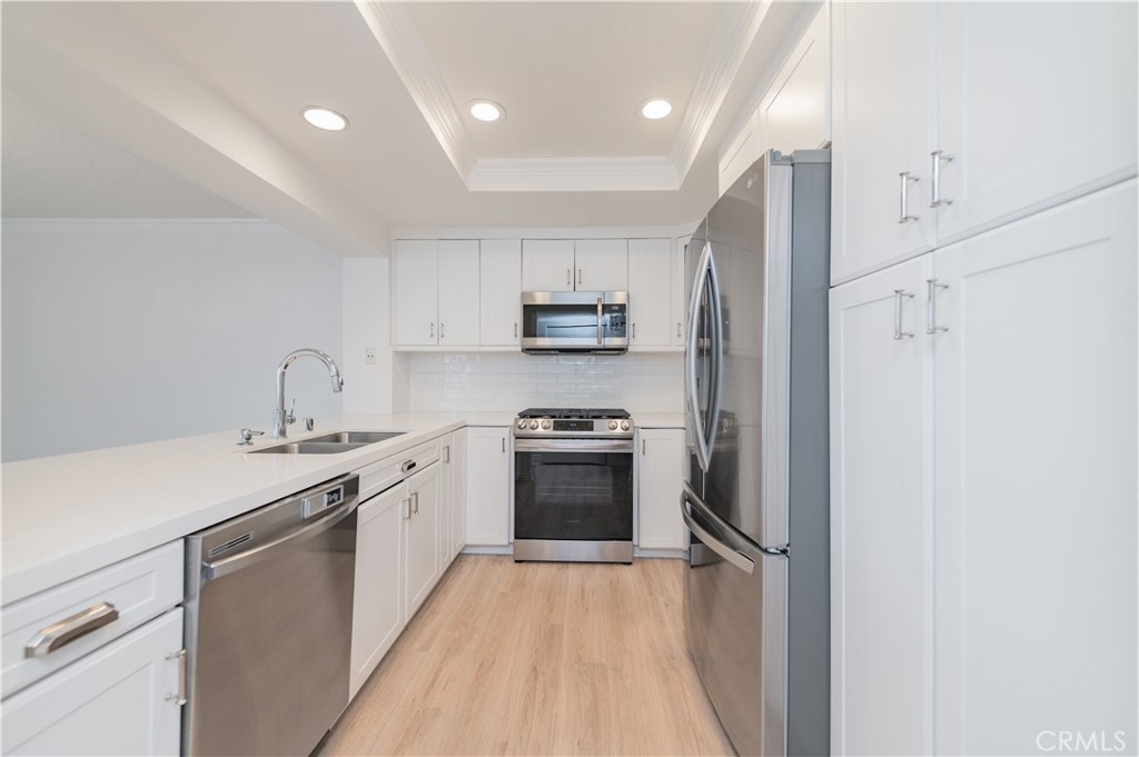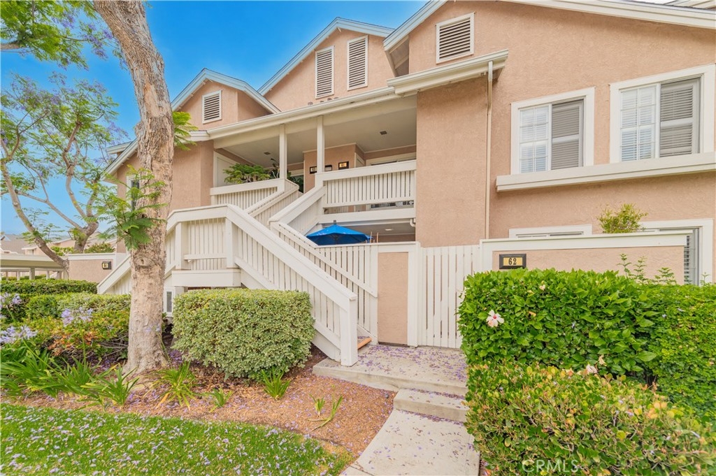 Beautifully upgraded 2-bedroom condo located in the desirable Alders community in the heart of Woodbridge. This charming upper-level corner unit sits alongside a greenbelt, offering added privacy and a peaceful setting. With soaring ceilings and an abundance of natural light streaming through numerous windows, the home feels bright and airy throughout. Tasteful finishes include crown molding, custom baseboards, and smooth textured ceilings that add an elegant touch. The stunning kitchen features crisp white cabinetry, dark granite countertops with a convenient breakfast bar, stainless steel appliances, and a coffered ceiling—perfect for anyone who enjoys cooking. A brand-new air conditioning unit, installed just last year, ensures year-round comfort. Both spacious bedrooms feature their own vanity areas, ideal for shared living. The primary suite includes a walk-in closet, while the bathroom boasts matching black granite counters and classic subway tile surrounding the full tub and shower. Enjoy your own private covered patio with extra storage space, along with a dedicated carport and plenty of guest parking nearby. The Alders community offers amenities such as a sparkling pool, BBQ and picnic areas, and lush greenbelts. Conveniently located near UCI, parks, lakes, shopping, dining, and top-rated Woodbridge schools, this home blends comfort, style, and location in one beautifully maintained package.