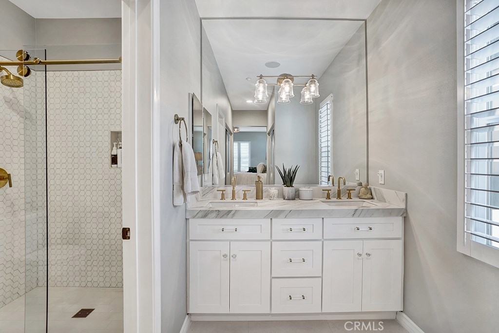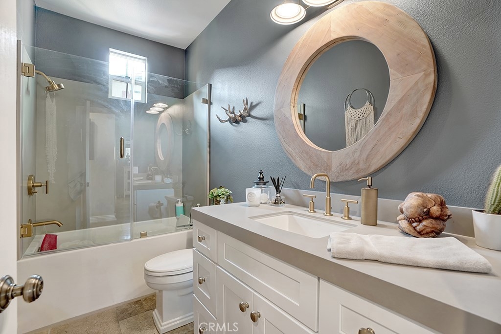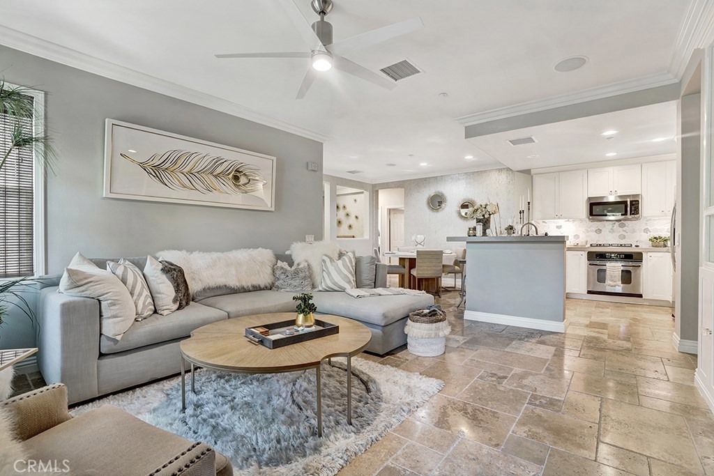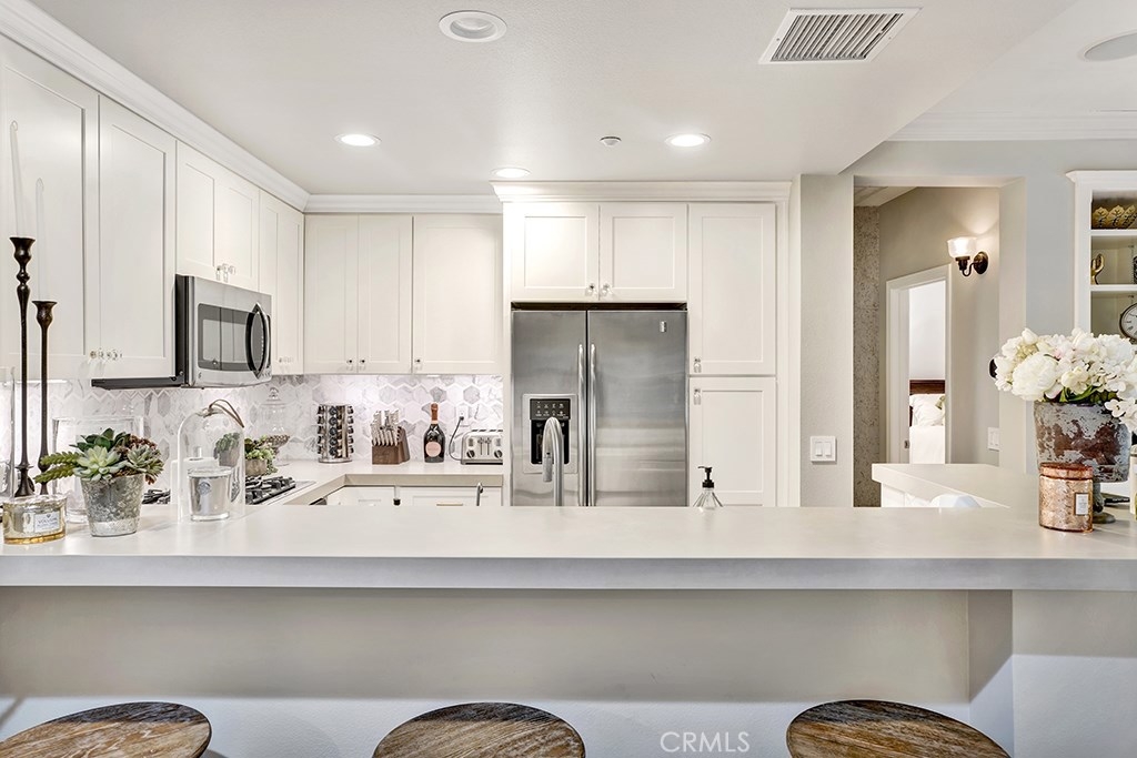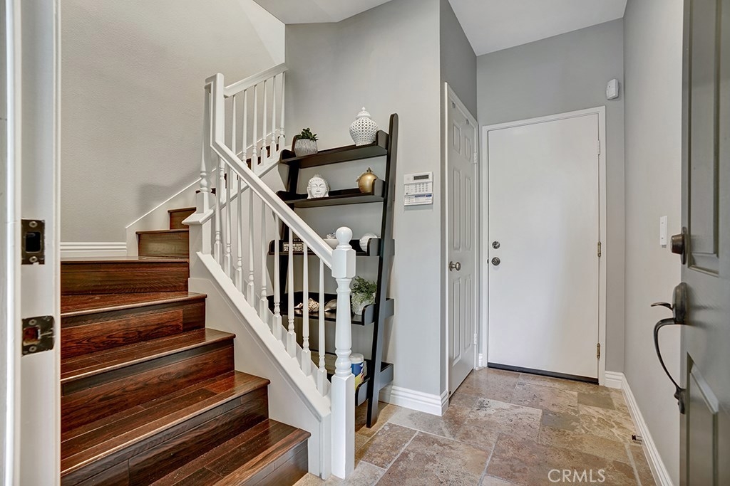 Extraordinary designer's touch in the desirable community of Turtle Ridge. This 2 bedroom 2 bath home embodies comfort & elegance, offering a generous living space with stylish finishes. Features wood staircase up to stone throughout, family room & dining room adorned with a designers touch. The modern kitchen features stainless steel appliances, quartz countertops, backsplash, counter seating and open concept. Both master suites completed with designer textured wallpaper, custom window coverings, & custom designed lighting. The remodeled master bath offers stone countertops, complete with stylish finishing’s. Enjoy gatherings in the family room complete with a custom entertainment center, surround sound and fireplace. This corner unit is bright and private. Open the windows and balcony doors to enjoy the California beach breeze. The laundry closet accommodates a full-size stackable washer and dryer. Spotless garage with custom cabinetry, storage, and epoxy flooring, large enough for two fill sized SUV’s. Including a variety of amenities such as pools, spa, & nearby hiking trails.