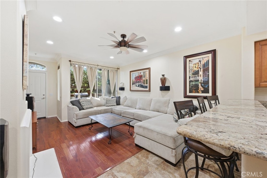 Welcome to Brio at Westpark, a vibrant Irvine community where elegant living meets everyday convenience. This rarely available ground-level, end-unit 2-bedroom, 2-bath home with an attached 2-car garage offers an exceptional blend of privacy, style, and true California living. Thoughtfully upgraded with brick patio tile flooring, ceramic travertine in the kitchen, and rich mahogany hardwood flooring throughout, this home also features crown molding, wood blinds, ceiling fans, a soaking tub, and custom garage cabinets. Enjoy the ease of direct-access garage parking and in-garage laundry. Step inside to soaring ceilings and walls of windows that fill the open floor plan with abundant natural light. Recessed lighting and a full suite of stainless-steel appliances make this home truly move-in ready. The remodeled great room and kitchen showcase newer cabinetry and upgraded granite countertops, ideal for both everyday living and entertaining. Relax by the cozy fireplace or unwind on your private patio overlooking lush greenbelt views—perfect for enjoying Orange County sunsets. The spacious primary suite is a peaceful retreat featuring a large walk-in closet, dual vanities, and a shower/tub combination. Generous storage throughout adds to the home’s functionality. Residents of Brio enjoy access to Westpark’s resort-style amenities, including three pools, spas, parks, playgrounds, picnic areas, and tennis & basketball courts. Located minutes from Irvine Spectrum, Fashion Island, South Coast Plaza, and award-winning Irvine Unified School District schools. A rare opportunity to own a beautifully upgraded home in one of Irvine’s most desirable communities.