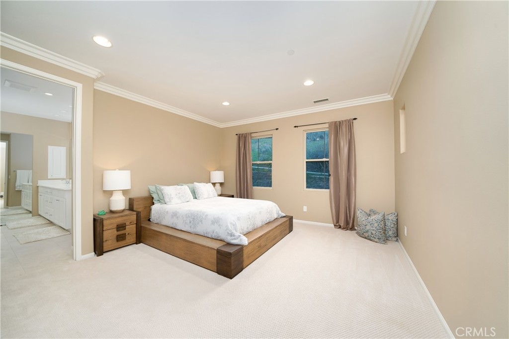 Fantastic home located in the popular gated community of Canyon Edge with private location and open views of the hills from rooms. Beautifully upgraded and customized throughout. This home has 3 bedrooms 2 of which are master bedrooms. One master bedroom is downstairs. The Entertainer’s delight gourmet kitchen has granite counters, tile backsplash, large center island including all new Stainless steel GE appliances. Living room has a welcoming stone fireplace, crown molding, sculptured carpet, French doors that open to the backyard and plantations shutters. Beautifully detailed upgrades adorn this home including custom paint and closet organizers + so much more. This community has association pool & spa with access to hiking, biking, and top rated schools (Vista Verde Elementary, middle school and University High).