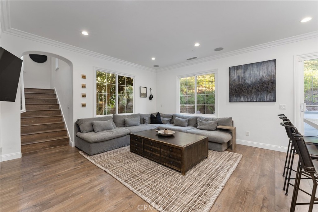 RARE Opportunity- this special Arborel 3X residence is sited on an oversized corner lot with its own large driveway. This highly desired Plan 3X residence offers exceptional privacy with just one neighboring home, and is larger than a standard Plan 3 with an oversized downstairs office/den. Welcome inside a light-filled main level with hardwood type floors throughout. At the heart of the home is the great room, complete with a family room with fireplace and built-ins that flows into the gourmet kitchen perfect for both entertaining and everyday living. The kitchen features a massive island with seating, designer finishes, quality stainless appliances, a built-in wine fridge, and a large walk-in pantry. Sliding doors open to your backyard retreat with a spacious patio and lawn, equipped with a built-in BBQ ideal for outdoor gatherings. Upstairs, three bedrooms and two full baths include your primary suite with a luxurious en-suite bathroom. The primary bath showcases double sinks, an expansive walk-in spa like shower, and a spacious walk-in closet. The attached two-car garage provides ample additional storage space. Arborel residents enjoy celebrated community amenities including resort-style pools, spa, cabanas, clubhouse, BBQ areas, and hiking trails, all within minutes of top-rated schools, beaches, and premier shopping and dining destinations. A rare combination of privacy, space, and amenities in this sought-after community.