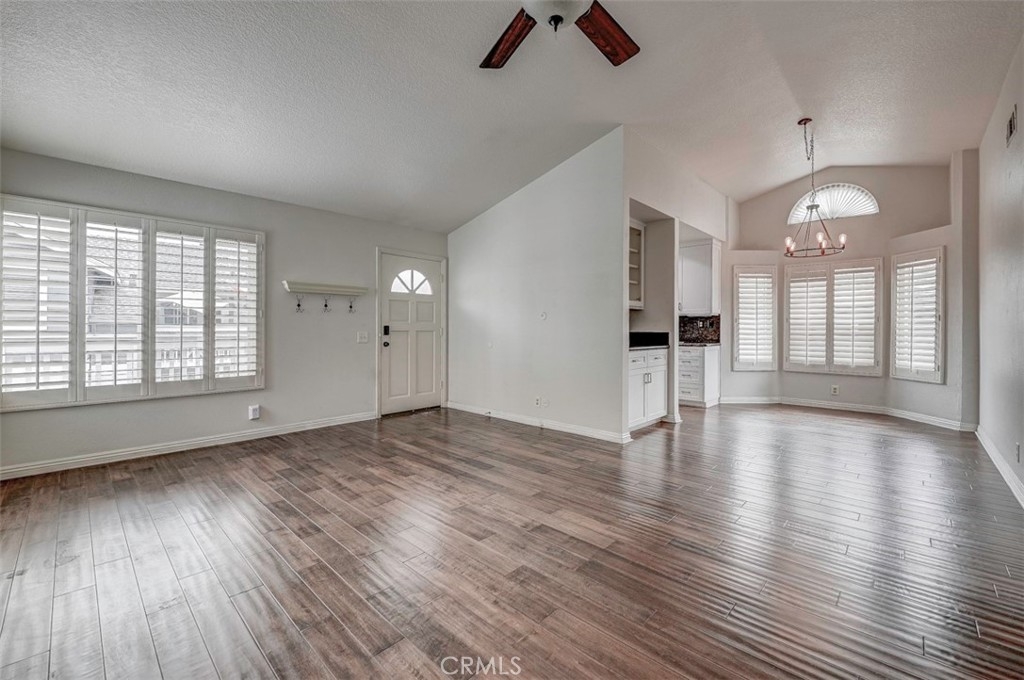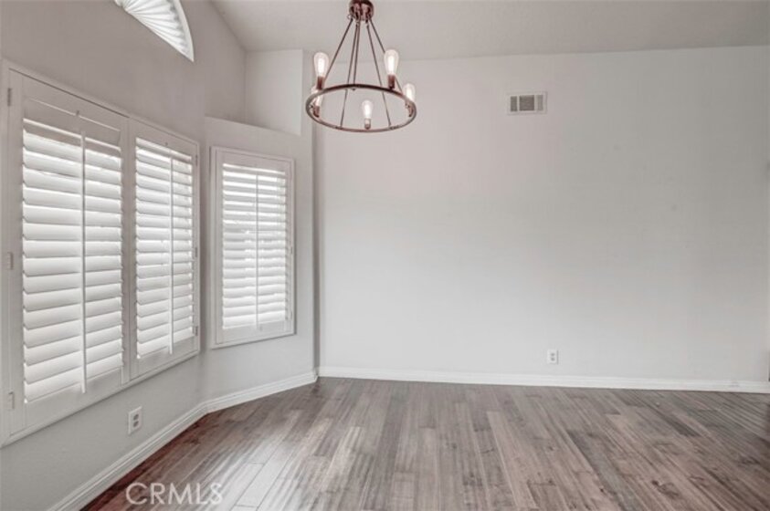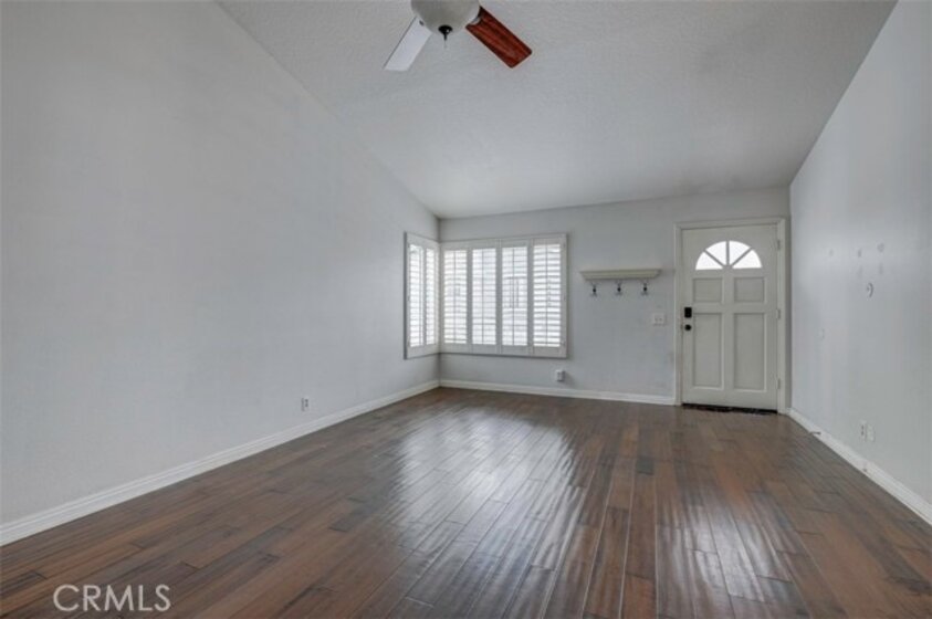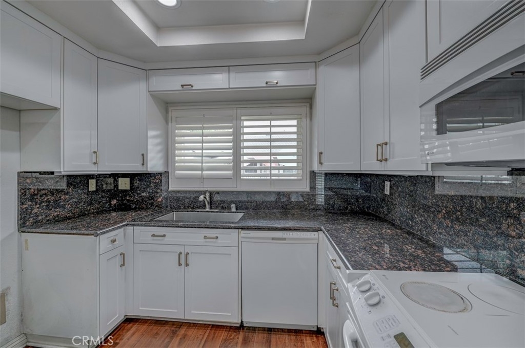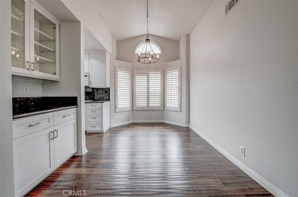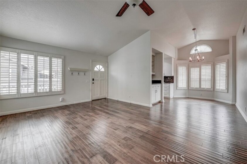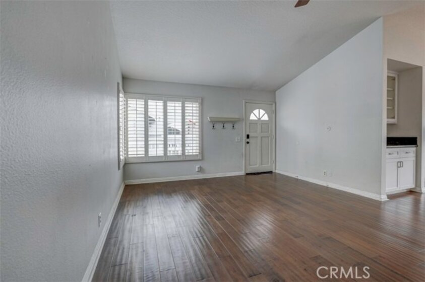 Warm, inviting and filled with natural light, this beautiful home offers a comfortable and stylish living experience. The spacious layout features wood flooring throughout the living room, dining area, kitchen and hallway complemented by granite countertops in both the kitchen and bathrooms. The kitchen is equipped with white cabinetry and appliances, a charming farmhouse sink and recessed lighting. A convenient cabinet niche in the dining room, complete with glass cabinetry and granite surfaces serves perfectly as a bar or decorative display. The living and dining rooms showcase elegant vaulted ceilings and an upgraded ceiling fan, creating a bright, open feel. Plantation shutters throughout add a timeless touch, while upgraded baseboards enhance the overall finish. The primary suite offers a large walk-in closet and direct access through a sliding glass door to the patio, creating a private and relaxing retreat. A secondary bedroom features mirrored closet doors for added style and functionality. Step outside to enjoy the spacious, enclosed patio ideal for outdoor living. Additional highlights include a detached garage conveniently located near the unit. This light-filled home blends comfort, charm, and thoughtful upgrades throughout.