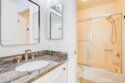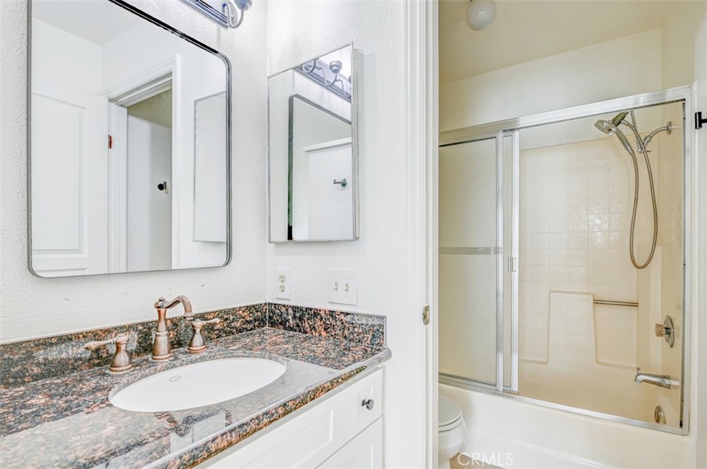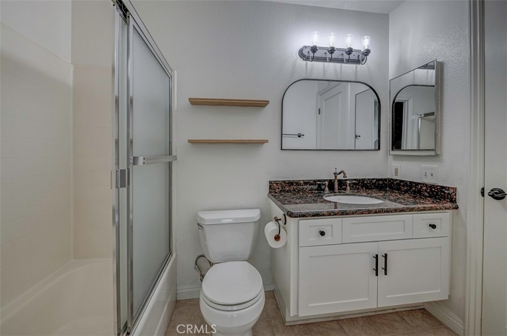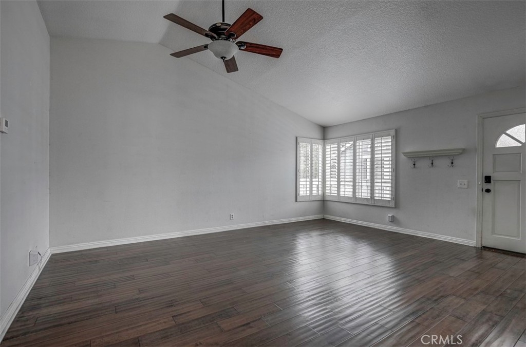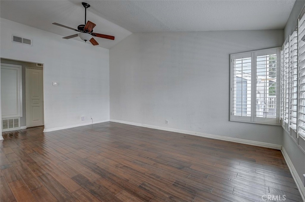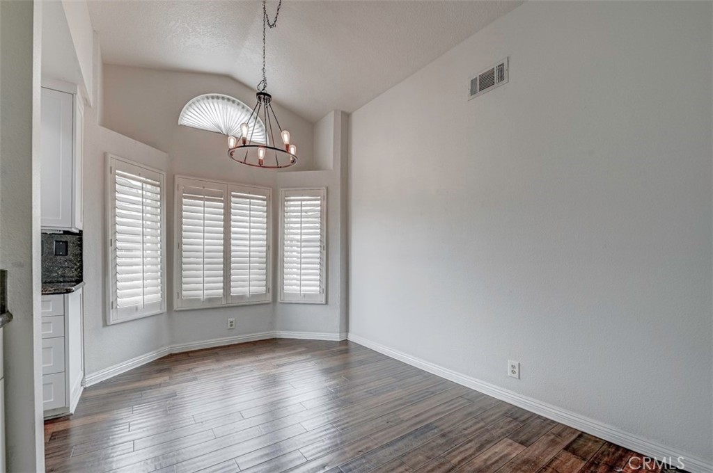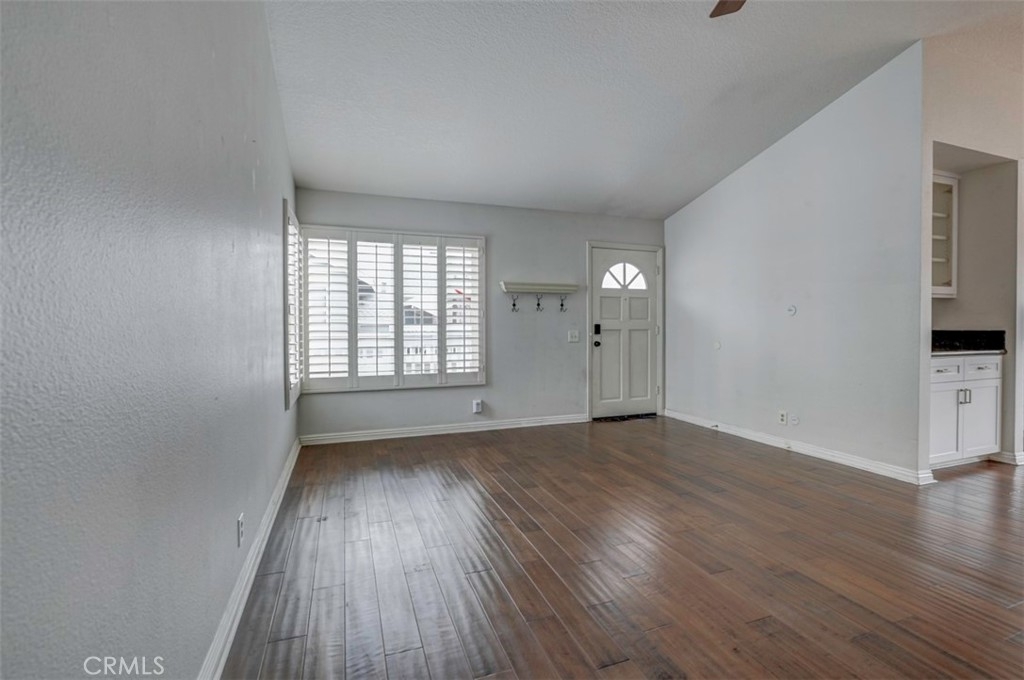 Warm, inviting and filled with natural light, this beautiful home offers a comfortable and stylish living experience. The spacious layout features wood flooring throughout the living room, dining area, kitchen and hallway complemented by granite countertops in both the kitchen and bathrooms. The kitchen is equipped with white cabinetry and appliances, a charming farmhouse sink and recessed lighting. A convenient cabinet niche in the dining room, complete with glass cabinetry and granite surfaces serves perfectly as a bar or decorative display. The living and dining rooms showcase elegant vaulted ceilings and an upgraded ceiling fan, creating a bright, open feel. Plantation shutters throughout add a timeless touch, while upgraded baseboards enhance the overall finish. The primary suite offers a large walk-in closet and direct access through a sliding glass door to the patio, creating a private and relaxing retreat. A secondary bedroom features mirrored closet doors for added style and functionality. Step outside to enjoy the spacious, enclosed patio ideal for outdoor living. Additional highlights include a detached garage conveniently located near the unit. This light-filled home blends comfort, charm, and thoughtful upgrades throughout.