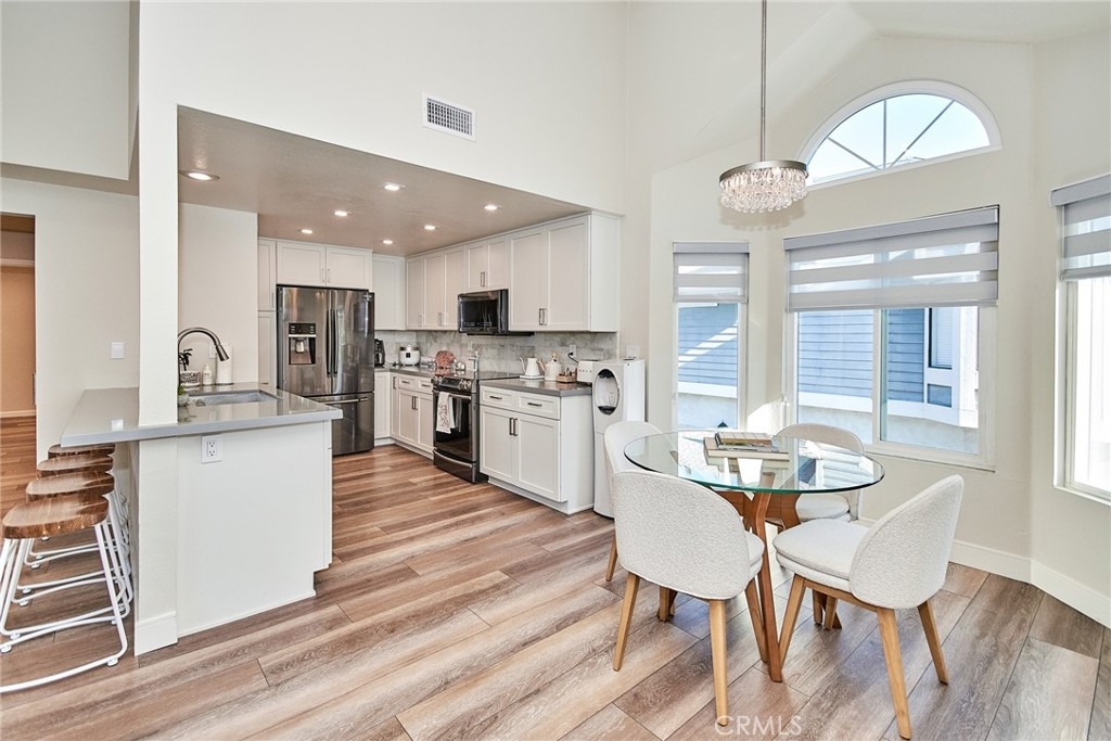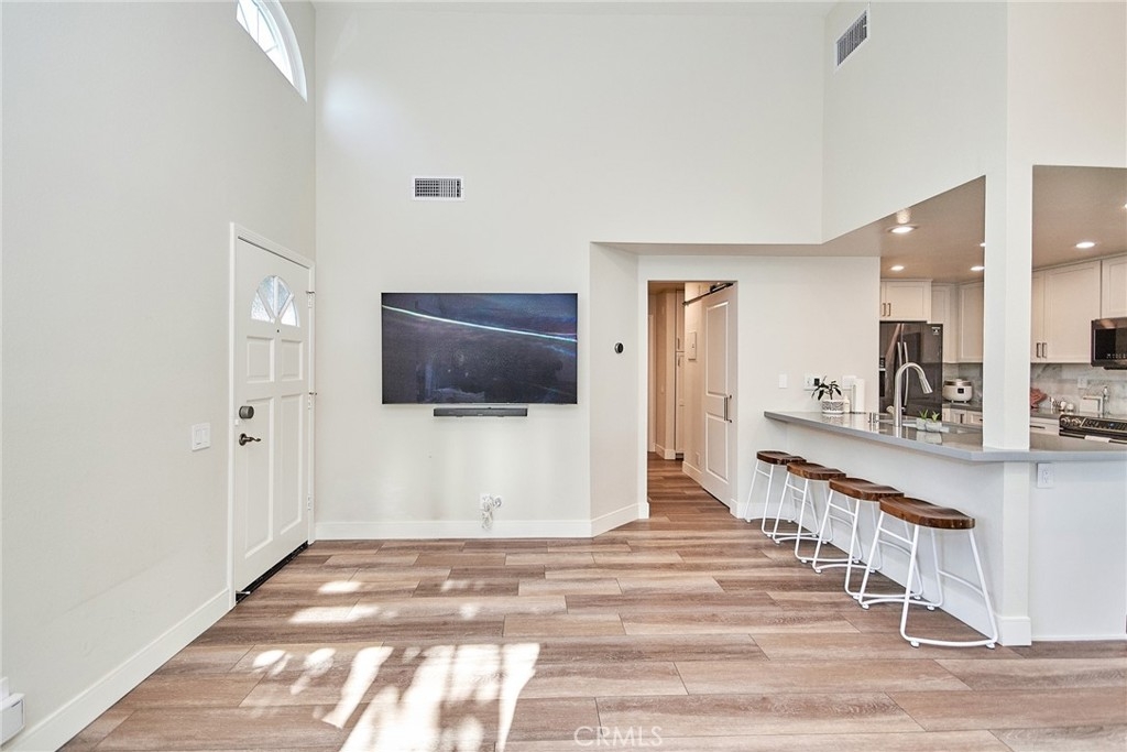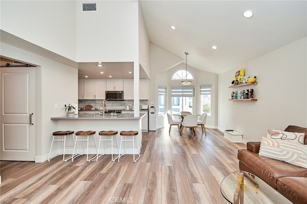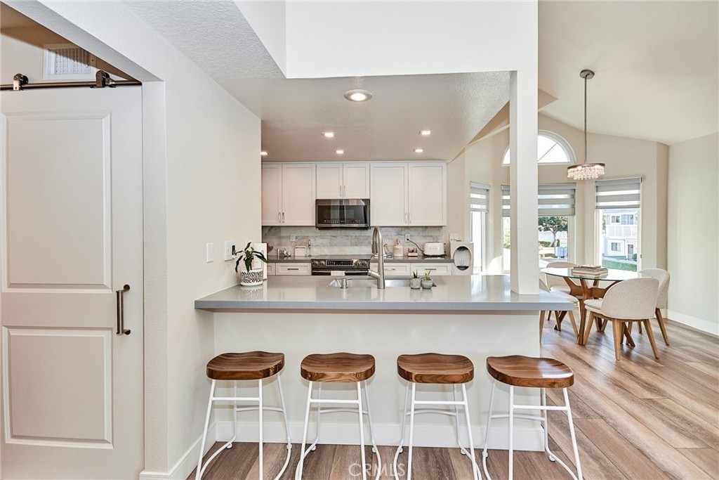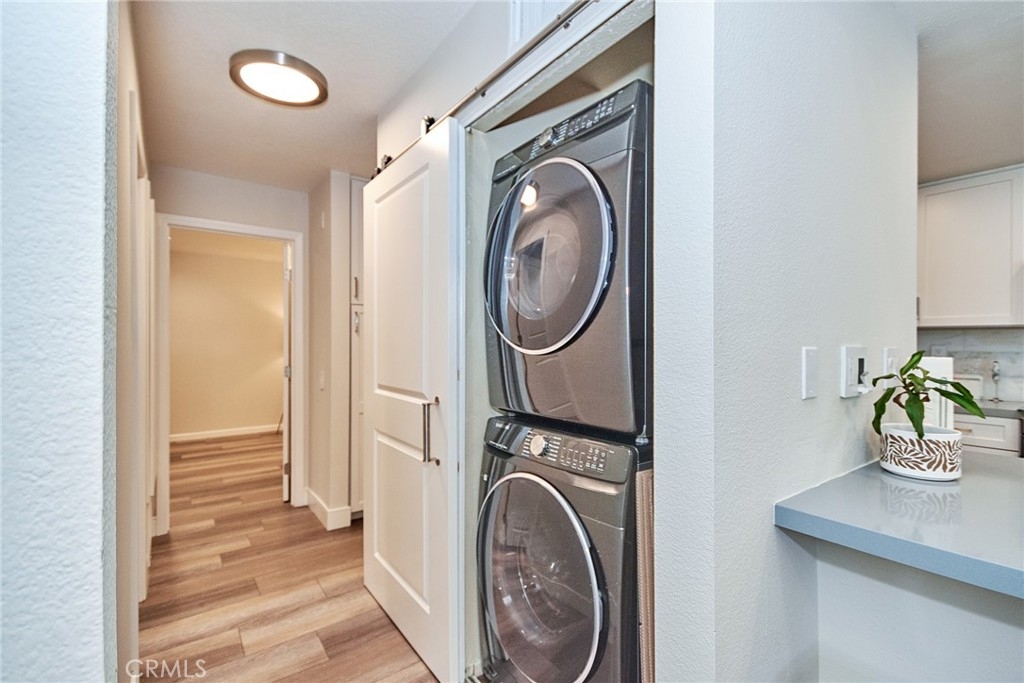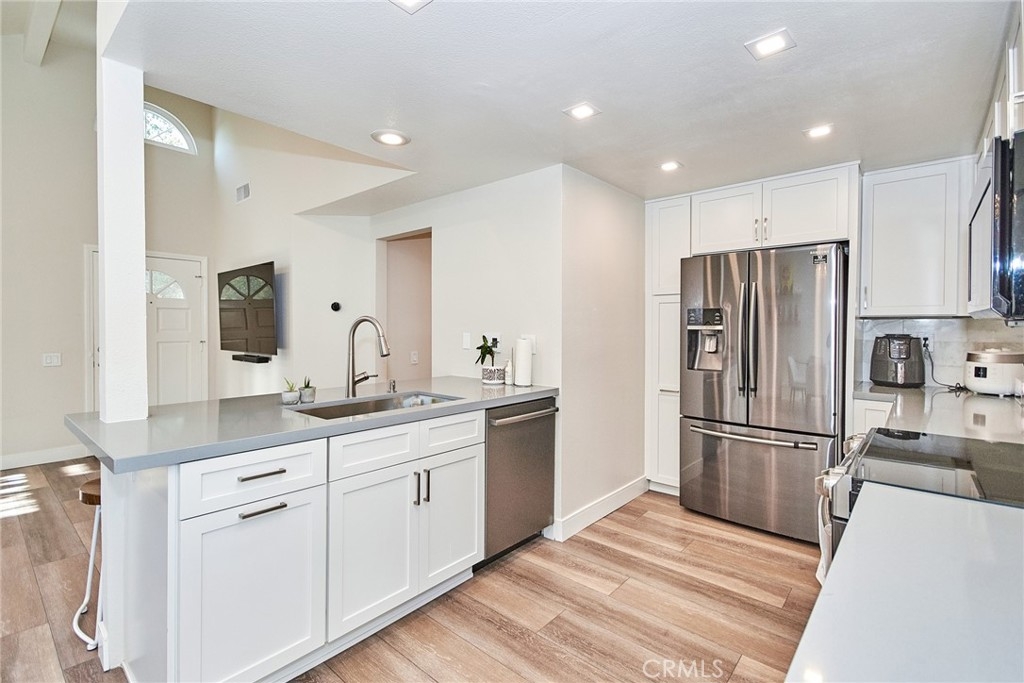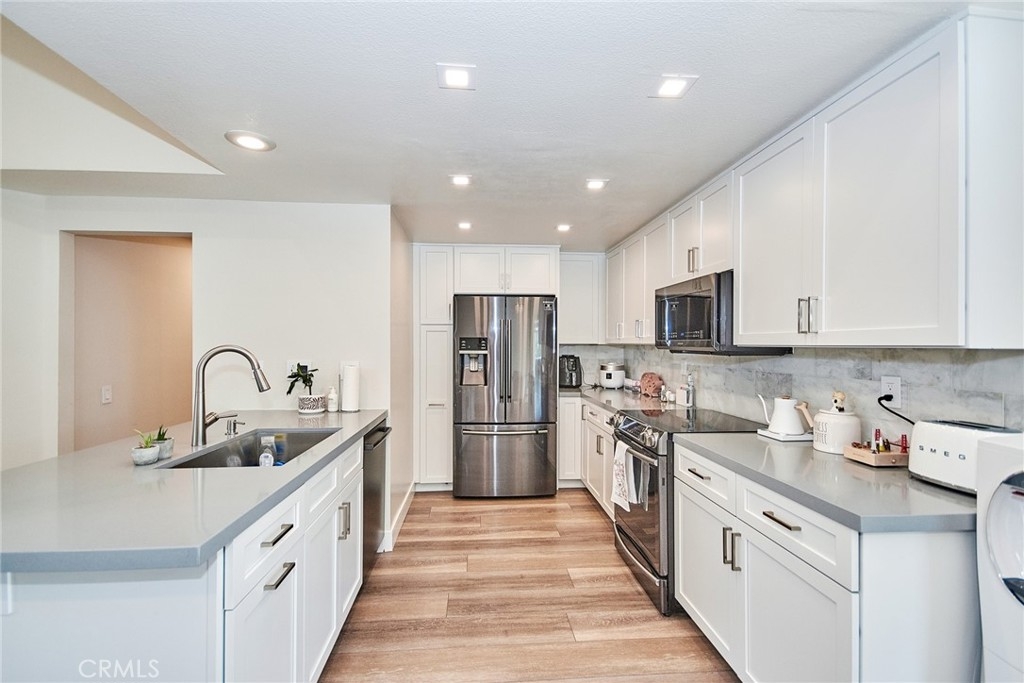 Welcome to this impeccably remodeled 2-bedroom, 2-bathroom corner end unit, offering a unique sense of privacy with no neighbors above or below. Move-in ready, this home impresses from the moment you step inside, featuring a spacious open floor plan, high ceilings, modern laminate wood flooring, and an abundance of natural light. The newly redesigned kitchen is equipped with sleek white cabinetry, refined countertops, full backsplash and premium Samsung stainless steel appliances. A matching in-unit Samsung washer and dryer add convenience. The primary suite showcases an upgraded bathroom and walk-in closet, while the second bedroom features an updated private bath with a luxurious tiled shower. Additional enhancements include recessed lighting throughout and a Nest smart thermostat, all seamlessly integrated with HomeKit for control via your phone or voice commands with Siri or Alexa. The private patio, offering views of lush greenery and captivating sunsets, serves as an ideal space for both relaxation and entertaining. This unit includes one-car garage directly below, with ample guest parking steps away, as well as an additional storage closet located under the stairs. Recent upgrades, such as energy-efficient dual-pane windows, custom window covering, central air conditioning, a new water heater, and fresh paint, ensure this home is in pristine condition. Nestled in the highly desirable Northwood Horizon community, this property is minutes from the Irvine Spectrum, Marketplace, Great Park, major freeways, and top-rated schools. The community features low HOA fees (no Mello-Roos) and provides access to two private pools with spas, all within walking distance of Orchard Park. This exceptional property presents a rare opportunity in a sought-after Irvine location