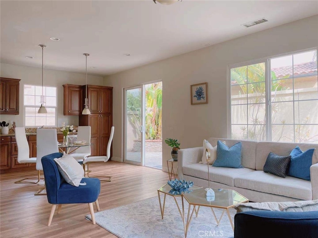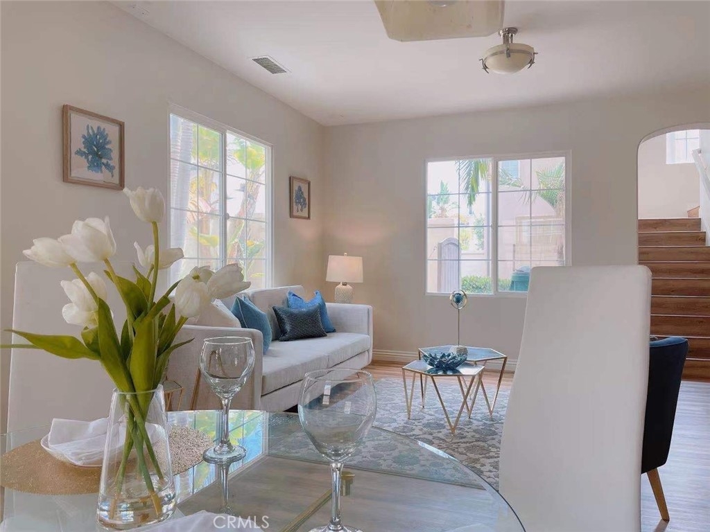 Santa Barbara style DETACHED home, end unit filled with lots of natural light. Highly desired open floor plan with three bedrooms upstairs with 4th bedroom downstairs currently configured as home office. New interior painting, new flooring for entire house. Bright gourmet kitchen opens to living & dining areas & is perfect for entertaining family & friends. Downstairs home office is easily converted to 4th bedroom. Great location. Short walk to pool & parks with easy access to shopping & freeways. Located in top rated Tustin school district. Low Tax rate , low HOA. A Must See!
