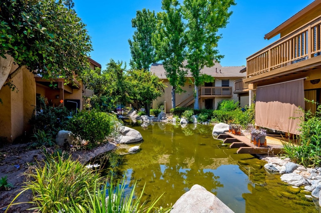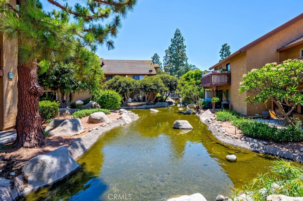 This is a very special unit. Enjoy the small waterfall right outside the front porch. No cars are visible from this location. At times you can smell the ocean breeze. The rear porch overlooks a beautiful well kept steam. The upstairs has an enclosed storage room that is 8 feet by 32 feet! Wonderful waterproof engineered wood flooring! New paint. New countertops. Upgraded cabinets. New bathroom vanity and faucets. Enjoy all the amenities: tennis court, clubhouse, workout room, basketball, tot lot. Plus the Irvine Unified School District, and the Irvine Valley College right next door. Award winning University of California, Irvine is close by. The Great Park is around the corner. Many job opportunities are within close distance. Great hiking trails are close. Best bicycle trails! You can bicycle all the way to the beach on bike trails, while going through Back Bay vast marshland that attracts many birds. Pools used in the Olympics are close by with great swim teams -- Novaquatics. While you have no freeway noise you are close the 5 and 405. Irvine Center Drive cuts nicely across Irvine where the speed limit is 55 mph. The Spectrum is just down the street. When you get home you should feel the park like setting. And know that you are home indeed.