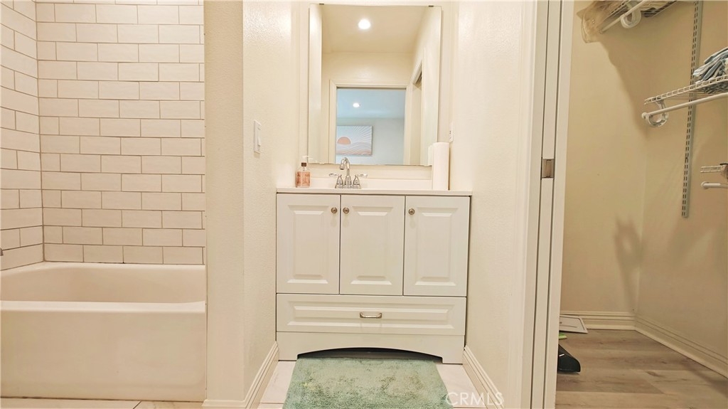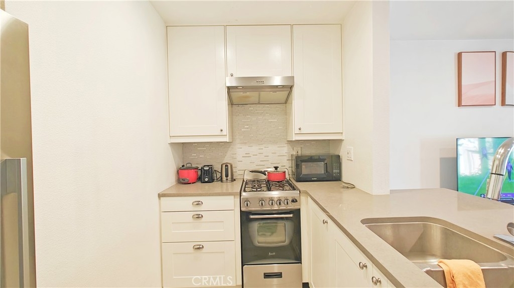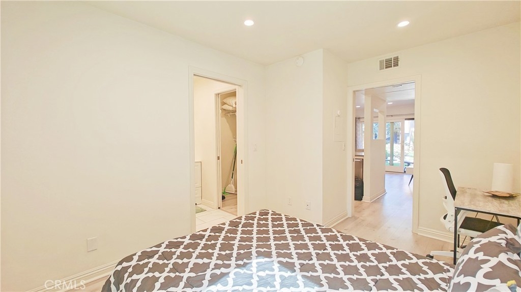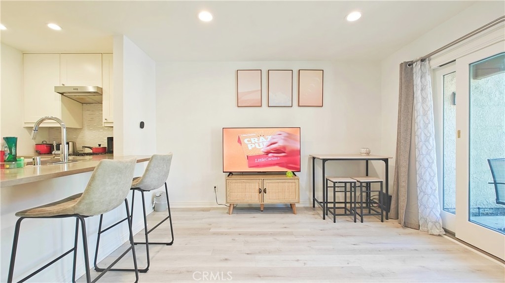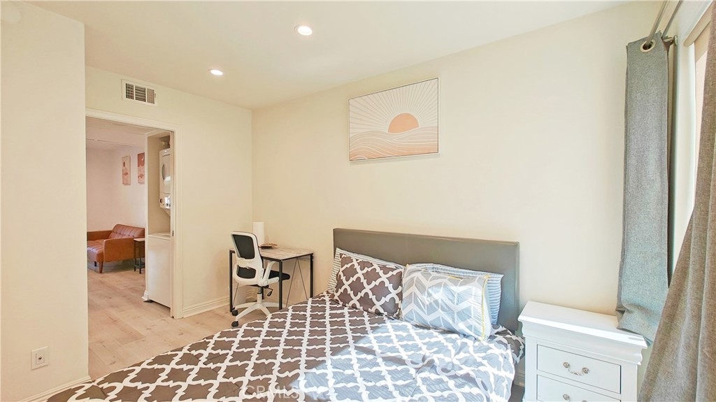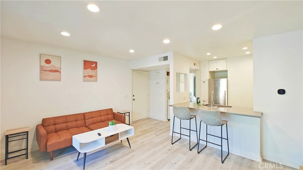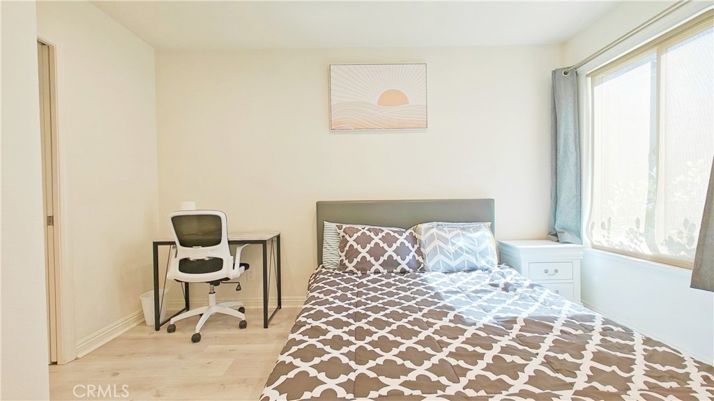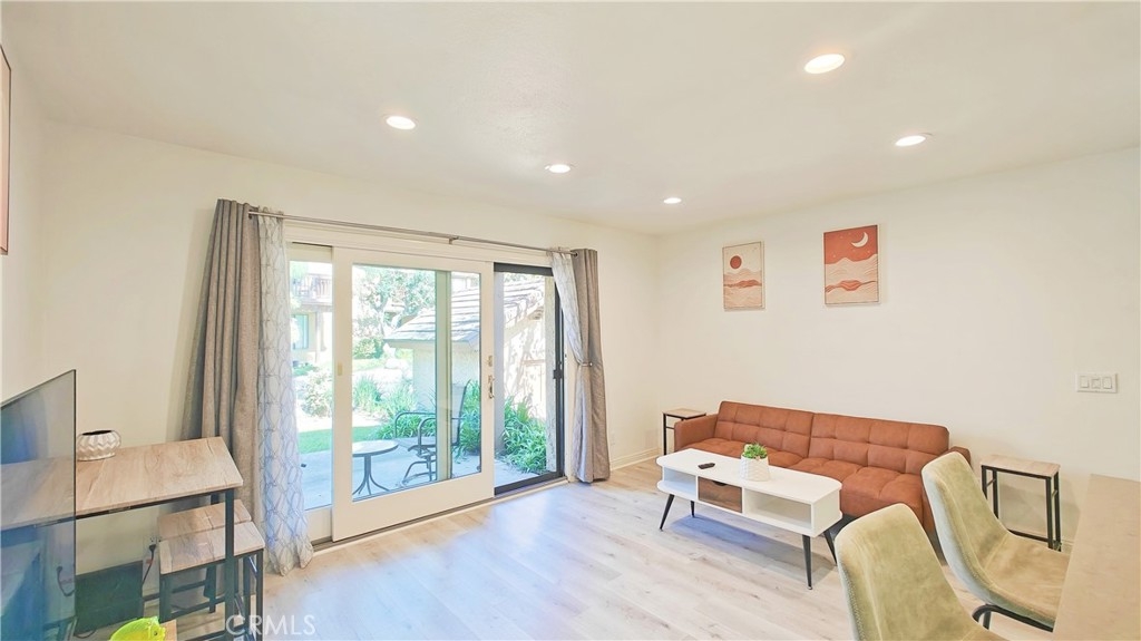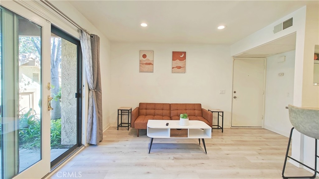 Discover this stunning 1-bedroom, 1-bath end unit on the lower level, it's filled with natural light, thanks to new energy-efficient windows and a sliding glass door. Inside, the space is maximized and modernized with durable laminate wood flooring. The kitchen shines with stainless steel appliances, quartz countertops, and innovative storage solutions like a pull-out pantry. The living area extends to a private patio with views of a tranquil pond and lush greenery, ideal for relaxation. The bedroom features an en suite bathroom and a walk-in closet. Additional upgrades include a new water heater, central heating and A/C, and a private stackable laundry unit. The unit comes with assigned covered parking and ample guest parking. The well-maintained community offers green spaces, water features, a clubhouse, pools, spas, tennis courts, and more. HOA fees cover TRASH, WATER, exterior insurance & maintenance. NO Mello Roos. Acclaimed Irvine Unified School District. Excellent location, w/ easy access to the 5 & 405 fwys and toll roads. This home is minutes from the Great Park Irvine Sports Complex, and top shopping and dining destinations.