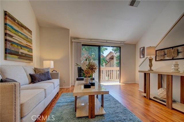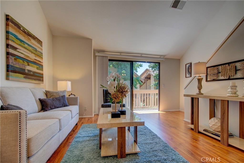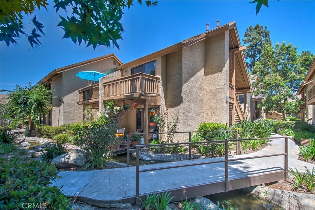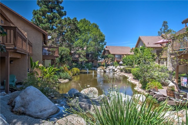 Upper end unit in the community of Orange Tree is light and bright and nicely appointed throughout. Enjoy the open living space with views of the trees through the patio sliding doors. The master bedroom has 2" window blinds, walk in closet and the adjoining bathroom features updated faucet, shower tub combo with frosted glass doors with stainless frame. The upstairs loft has plenty of room to be a separate living space or perfect for guests or office space. The kitchen has painted white cabinetry and granite counter top with an extended breakfast/eating bar, updated gooseneck faucet and a stainless refridgerator. Other special features include interior laundry, wood laminate flooring throughout, 2" blinds, ceiling fan with light kit and a nice sized balcony patio with a view of the surrounding stream/lakes. Conveniently located near IVC, Oak Creek Golf Club, UCI and easy access to 5/405 fwys, toll roads, entertainment and shopping. 309 Tangelo is move in ready and available for you to begin creating your own memories. Welcome to your new home.