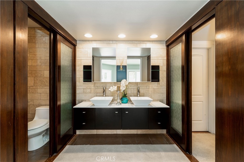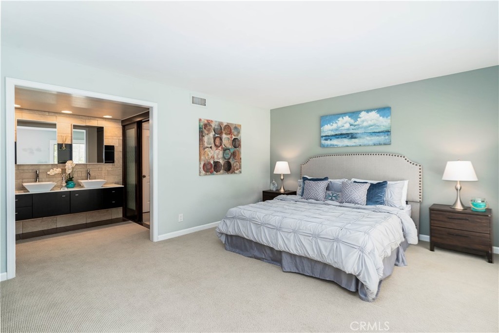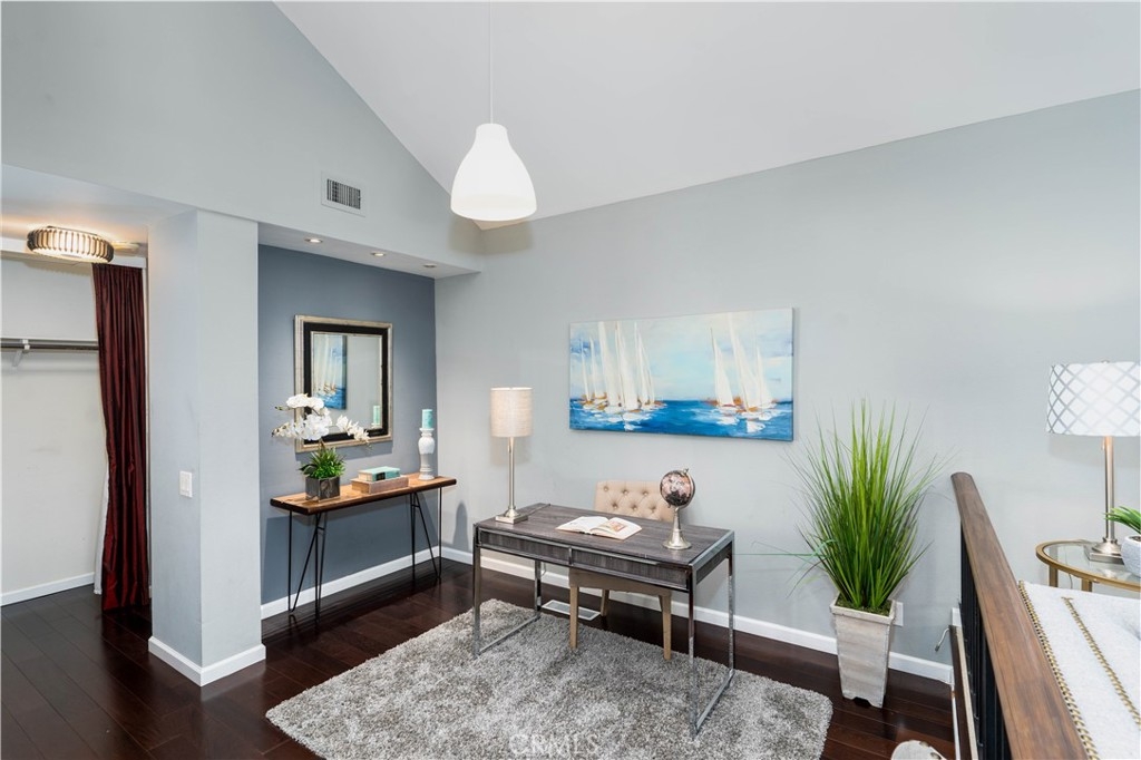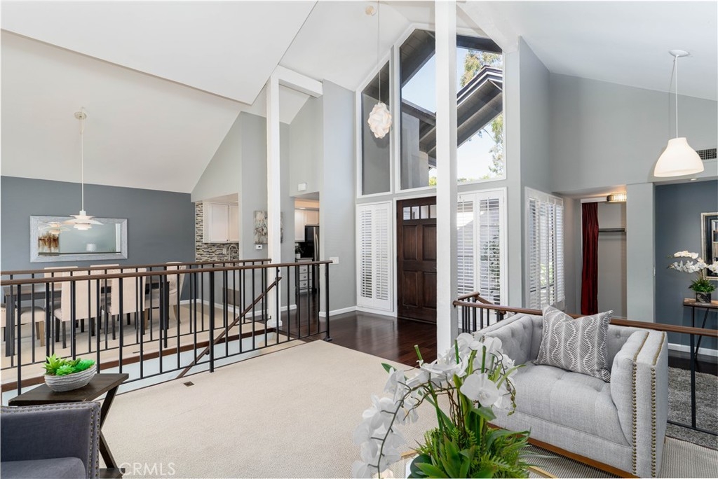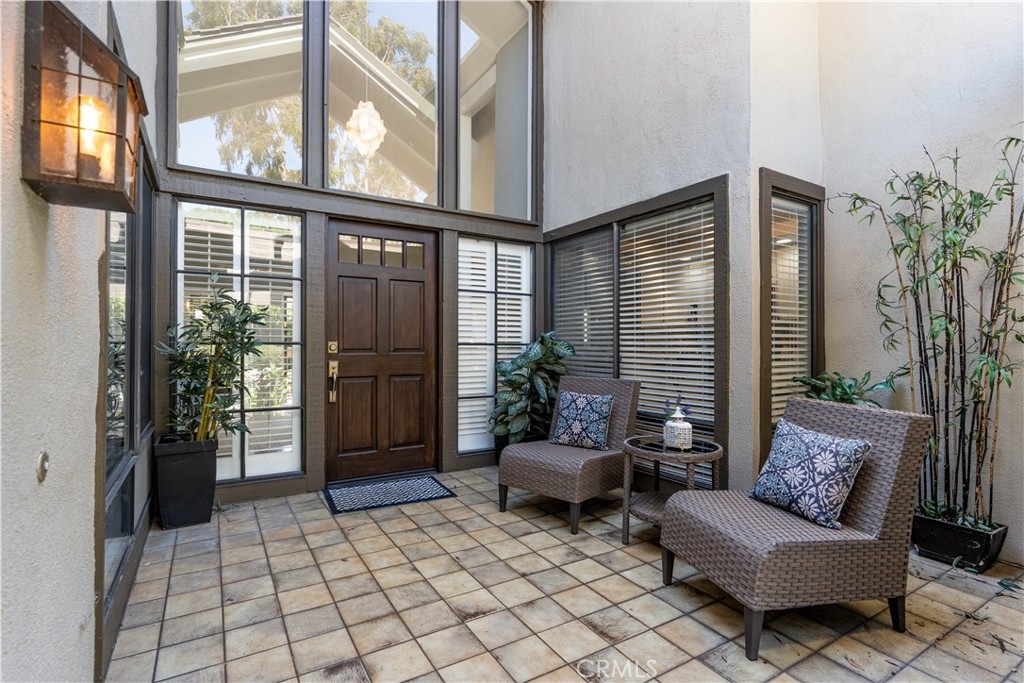 A HOUSE OF SPECTACULAR DEATAILS…As you enter the home, you are welcomed by an architectural designed ceiling inlay with panoramic windows. Soaring vaulted ceilings and open floor plan allows plenty of natural light that displays the rich Brazilian hardwood. The living room has a custom designed wood panel feature that highlights the floating fireplace. Renovated kitchen with granite countertop, mosaic backsplash, top of the line stainless steel appliances, private coffee bar, and cove lighting. This home offers 2 Master suites plus a Den/Office Space (Den could be converted to 3rd bedroom). Master bedroom opens into a stunning bathroom with dual sinks and contemporary floor to ceiling tile throughout. The huge walk-in closet leads to a hidden basement area that could be used for storage or wine-cellar. Interior location at the end of a cul-de-sac with no one above or below, plus three separate patio areas that overlook the greenbelt. Direct access from the garage, plus additional private covered parking. This highly desirable Rancho San Joaquin property is walking distance to pools, William Mason Park. Conveniently located near UCI, tennis club, shopping, dining, and golf course. Access to award-winning schools within the Irvine Unified School District. This property is a one of a kind opportunity to live the RSJ lifestyle and explore all of the details for yourself.