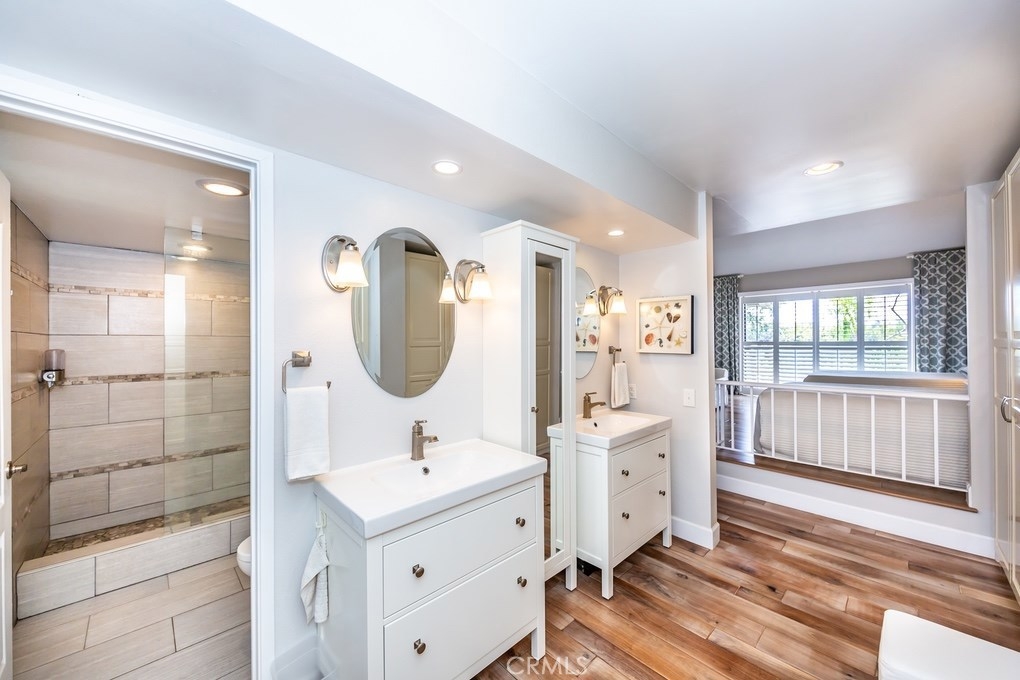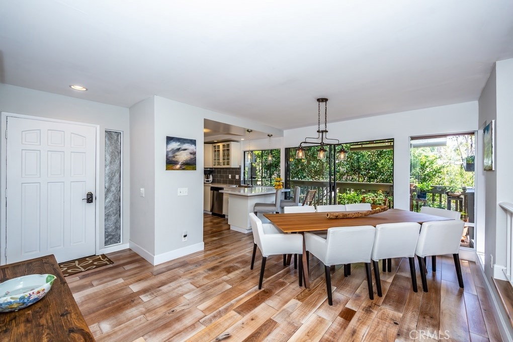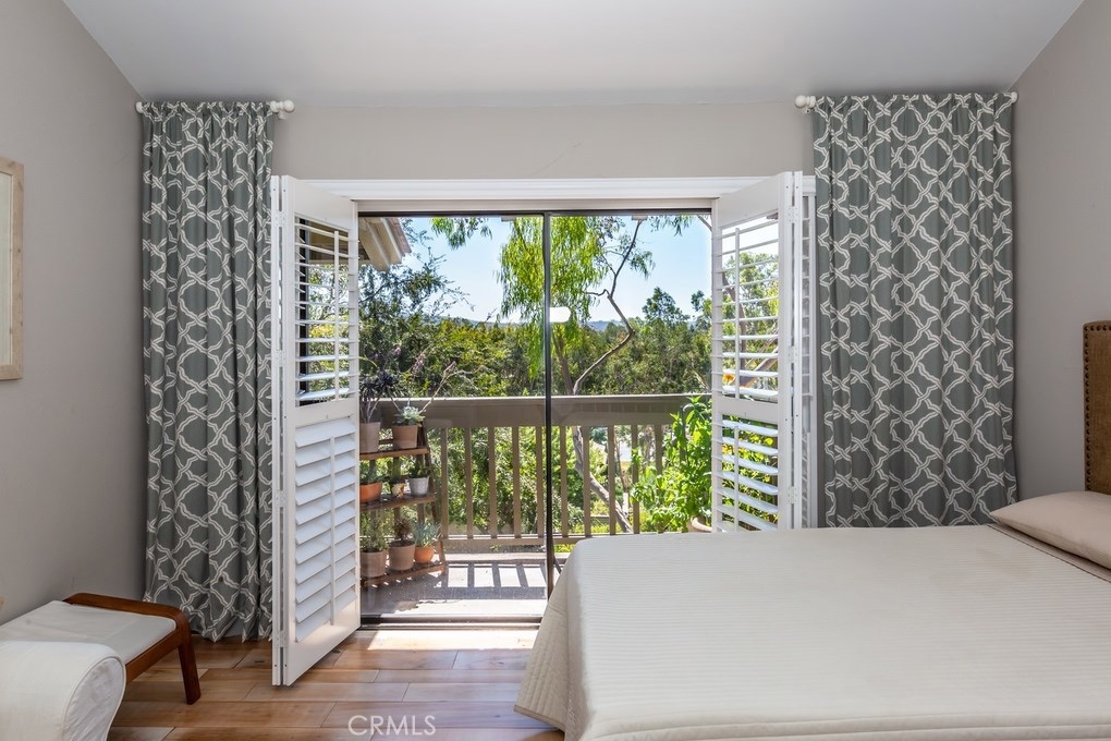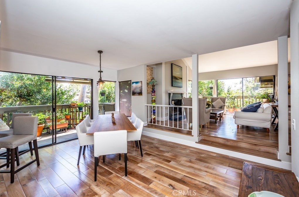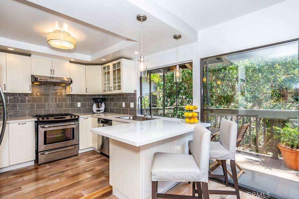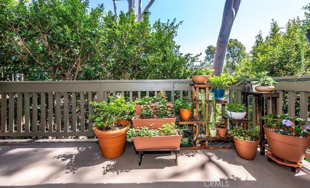 Beautifully remodeled corner-lot Penthouse on top of a rise with amazing views of greenbelt, trees and park! Upgraded by an artist, premier open-layout, one-level home is absolutely gorgeous. Light & bright with walls of windows, cathedral ceilings, & warm rich wood floors. Expansive great room has no walls between kitchen, dining & living rooms. Gourmet kitchen has breakfast bar, stainless steel appliances, upscale cabinetry & backsplash tiles. Kitchen window & dining room sliding glass door open to one of three outdoor decks, to relax, dine & entertain surrounded by nature. Living room with wonderfully black-tiled fireplace has views of nature out multiple windows, & its own outdoor deck. The den, which can be converted to a 3rd bedroom, is partially open to the living room & has serene views of trees & park. Down the hallway is a bedroom with frosted-glass sliding closet doors, a full bathroom with exquisite shower tiles, & then an ensuite master bedroom with high ceilings & private deck with magnificent view of trees and park. Master bathroom has entire wall of sleek high-end closets with organizers, two vanities, and spa-like walk-in shower with marvelous tile work. Within highly-acclaimed Irvine School District & University High. 2-car garage & street parking. Just steps to community resort-style pool and spa. Ideally located near UCI, William Mason Park, John Wayne Airport, Newport Beach, Fashion Island & walking distance to shops & entertainment. A rare opportunity!
