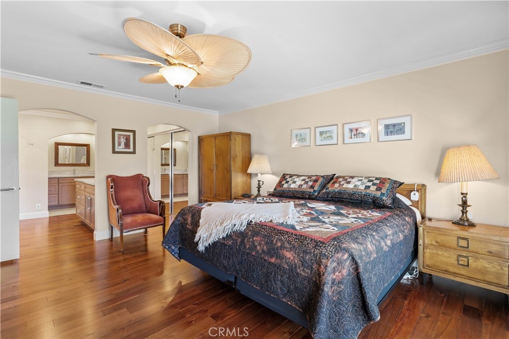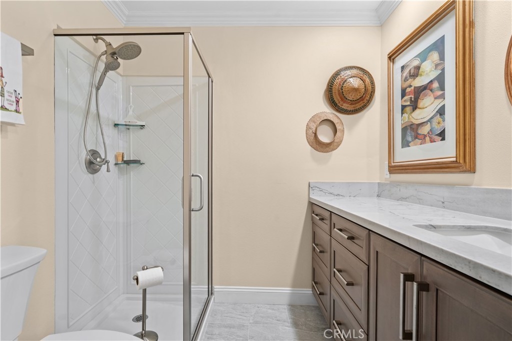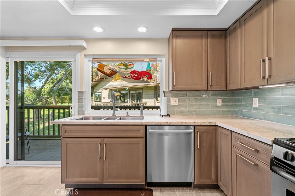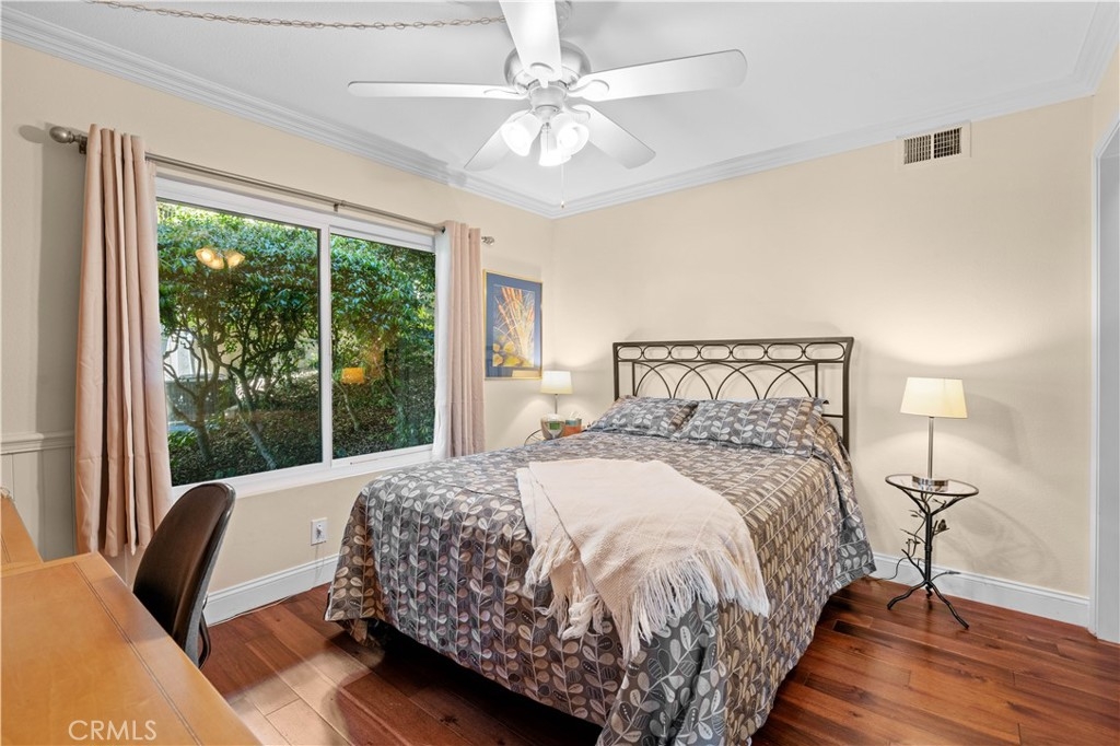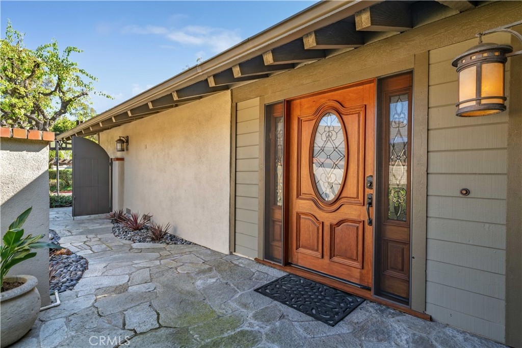 Beautifully remodeled home on a private cul-de-sac, offering panoramic views of the golf course, pond, city skyline, and sunsets, perfectly situated near the 6th and 7th fairways. Through the front gate is a courtyard featuring a fountain and rock waterfall. Inside the front door is an open room, illuminated by a skylight, that flows into the main living spaces, making it ideal for a playroom or guest area. This home has an open floor plan with cathedral ceilings and recessed lighting, enhanced by dual-pane windows that fill the space with natural light. Beautiful hardwood flooring throughout (with tile flooring in kitchen, bathrooms and laundry area). The living room seamlessly connects to the dining area and the gourmet kitchen, complete with Quartzite countertops and custom cabinetry. Sliding glass doors from both the dining room and kitchen lead to separate outdoor decks, perfect for relaxing amid lush greenery. The primary bedroom features a sliding glass door that opens to a back patio with amazing golf course views. It also includes a spacious ensuite bathroom with two vanity areas, each with its own sink and cabinets, a walk-in shower, and a privacy door to the toilet. The second back bedroom offers wide-open golf views and can easily serve as an office. Each bedroom is thoughtfully equipped with a ceiling fan for added comfort. Enjoy the convenience of a finished storage area, accessed through the downstairs front bedroom walk-in closet. The kitchen, main floor bathroom, and primary bathroom were all beautifully remodeled four years ago, while dual-pane windows were installed three years ago. Recent upgrades also include a new roof and tenting completed in early 2023. Other benefits include a direct-access two-car garage with EV charger, indoor laundry area, and access to two community pools and spas. Association dues cover water, trash, and exterior maintenance. Situated within the acclaimed Irvine School District, including University High, this home is just minutes from UCI, William Mason Park, John Wayne Airport, Newport Beach, and Fashion Island. This remodeled home, with spectacular golf course views, offers a turnkey resort-style living experience!