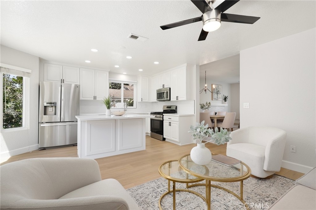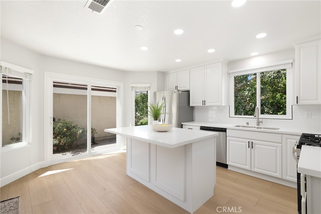 Welcome to this beautifully upgraded end-unit townhouse in the highly sought-after neighborhood of Woodbridge. Spanning 1,406 square feet, with 3 bedrooms and 2.5 baths, this light-filled, two-story residence is ideally located at a quiet cul-de-sac, boasting a rare, extra-large side yard adorned with lush green foliage and fruit trees. Step inside to discover a spacious living room accented by a cozy fireplace, abundant natural light, and new fresh designer paint throughout. Downstairs features newly upgraded Luxury Vinyl floors that complement the inviting kitchen and den area, complete with new quartz countertops, new tile back splash, white shaker-style cabinets, stainless steel appliances, and recessed lighting and eat at island. Upstairs, you'll find upgraded bathrooms with newer floors, faucets, high-end roller shower/tub door enclosures as well as new neutral carpet, new ceiling fans, and new custom-ordered mirrored closet doors. Enjoy the convenience of newer windows and patio doors with dual-pane glass, enhancing energy efficiency and tranquility. This townhouse offers more than just a home; it provides a lifestyle within the resort-like amenities of Woodbridge. Residents enjoy access to two lakes with docks, two beach lagoons, over 15 swimming pools and spas, including saltwater heated pools, along with over 20 tennis courts and several pickleball courts. The community also features numerous parks with playgrounds, volleyball courts, and scenic tree-lined streets perfect for leisurely walks. Located within the top-rated Unified Irvine School District, residents benefit from proximity to Springbrook Elementary, Lakeside Middle School, and renowned Woodbridge High School, all within walking or biking distance. Easy access to major routes such as I-405 and I-5 makes commuting a breeze, while world-class shopping, dining, beaches, UCI, and the Irvine Business Complex are just moments away. With no Mello Roos tax and one of the most central and desirable locations in Irvine, this special home offers a rare opportunity that won't last long!
