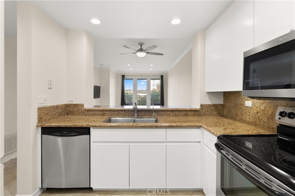 Resort style living at The Metropolitan. LOWEST PRICED UNIT IN THE COMPLEX! Why spend $75-100K in remodel when this unit is turnkey! Very large one bedroom plus den that can be used as an office or second bedroom. Very good location. Only 1 common wall. Beautiful new flooring in living room and den. Office/den/second bedroom features sliding glass door and drapery for privacy. Kitchen features newer granite countertops, stainless steel electric oven and range, very large stainless refrigerator, dishwasher, front loading washer, and dryer all included in sale. 9-foot ceilings throughout. Highly upgraded Bathroom features dual vanity with stone countertops and cabinets with lots of storage, private toilet & walk in stone lined shower adjacent to large stone cased soaking bathtub. Bedroom has spacious walk-in closet and newer carpeting. Patio is very large with lush tropical landscape and greenbelt views. Close to South Coast Plaza & Fashion Island/ Newport Beach, all the best Orange County has to offer is at your doorstep. Within a few minutes of JW Airport & 3 major freeways this ideal location is for the most cosmopolitan of residents. Features pool, spa, gym & guarded gate. Water, hot water trash and gas are all included in HOA dues. Great opportunity here!
