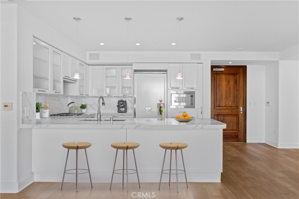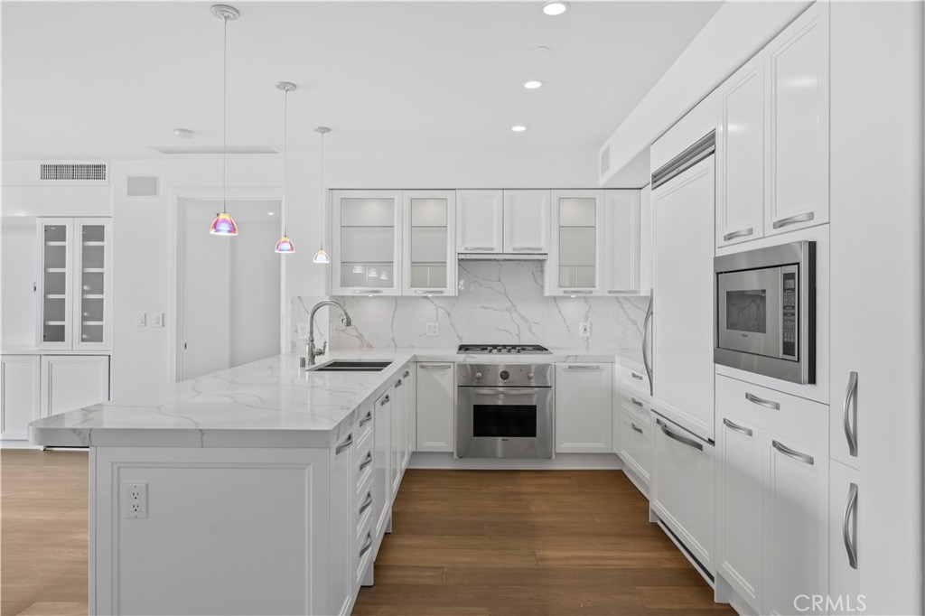 BACK ON MARKET!!! BUYER COULD NOT PERFORM!!! Move up to glamorous New York City-style living at this newly upgraded luxury condominium at The Plaza in the heart of Irvine, where sophisticated high-rise living is redefined. A transitional designed, spacious and bright living area showcases opulent designer finishes and fixtures, including high-end lighting, French oak flooring, Carrara white quartz countertops in the kitchen and baths, and large windows that welcome an abundance of natural light. Prep fabulous meals or simply entertain stylishly in a magazine-worthy kitchen with Viking appliances that include a built-in refrigerator with cabinet-matched doors. Approximately 1,701 square feet, the residence reveals a versatile den and two bedrooms and two baths in a dual primary suite configuration. The main suite pampers homeowners with a spacious walk-in closet, dual sinks, a jetted spa-caliber tub and a separate shower. The Plaza provides residents with exclusive access to a resort-caliber pool and lap pool, private cabanas, conference rooms, banquet facilities, a game/media room with pool table, concierge and limousine services, grocery delivery, a state-of-the-art fitness center and gated parking. Enjoy views of city lights and Disneyland’s fireworks from The Plaza, which is moments from John Wayne Airport, South Coast Plaza, Newport Beach, high-end shopping, fine dining, a nature preserve and major freeways.