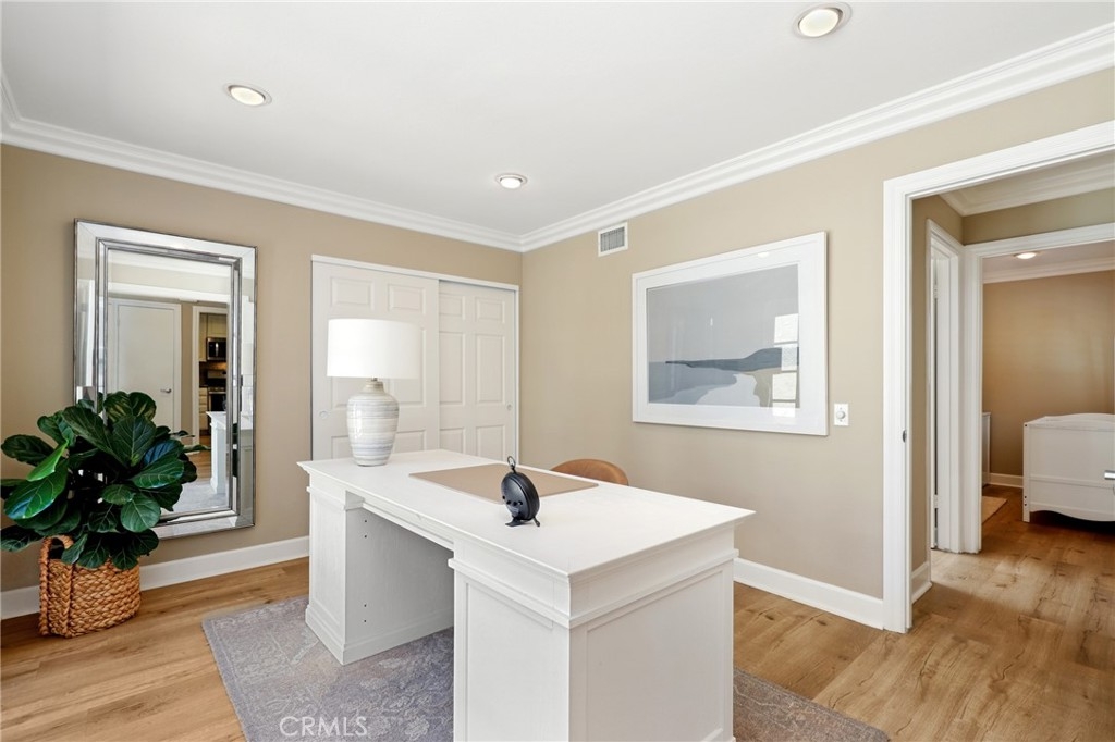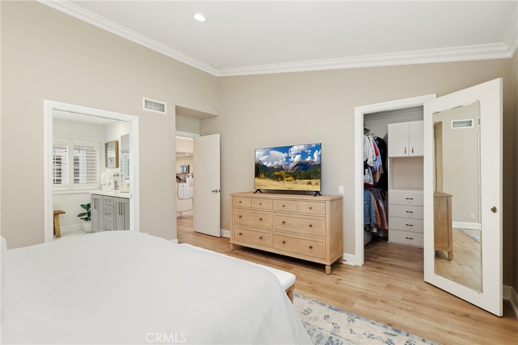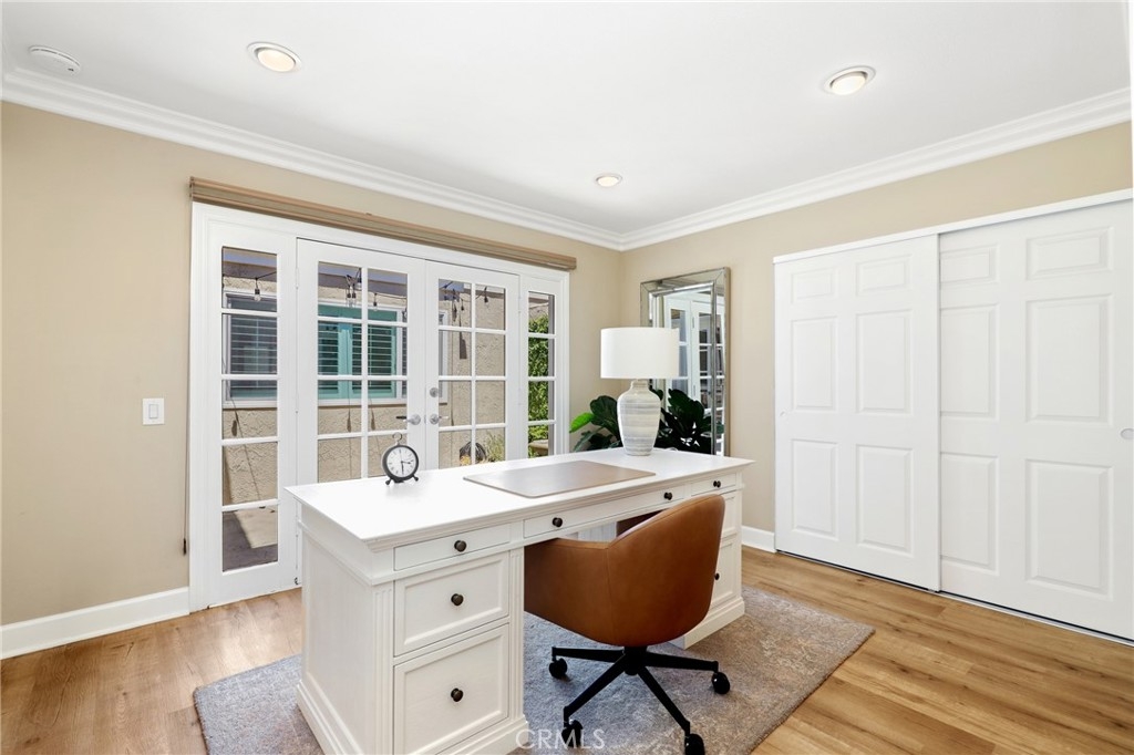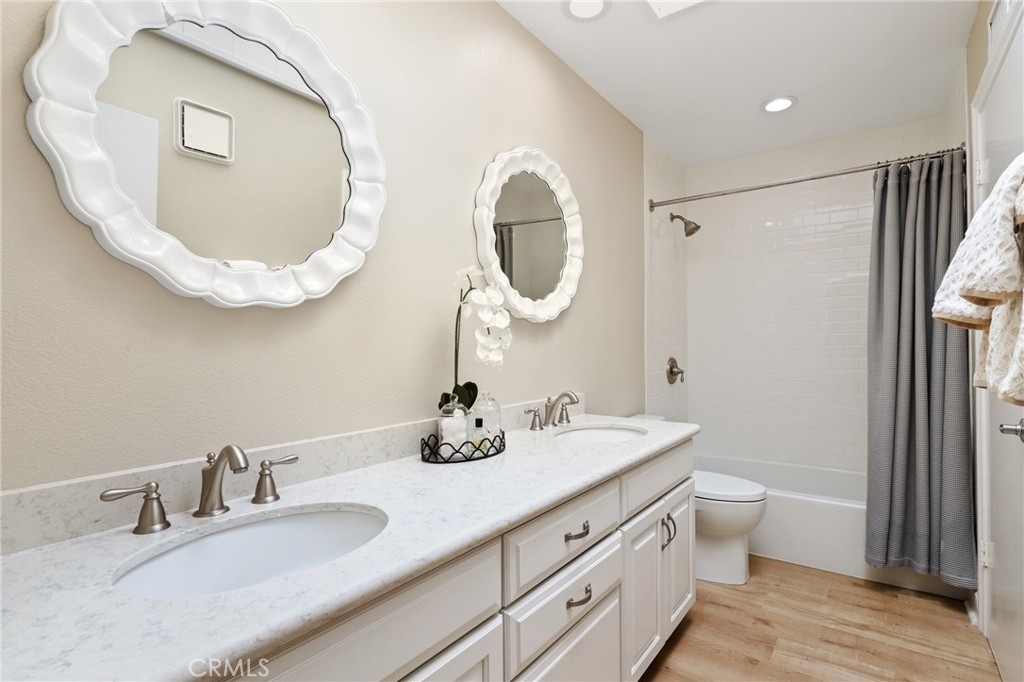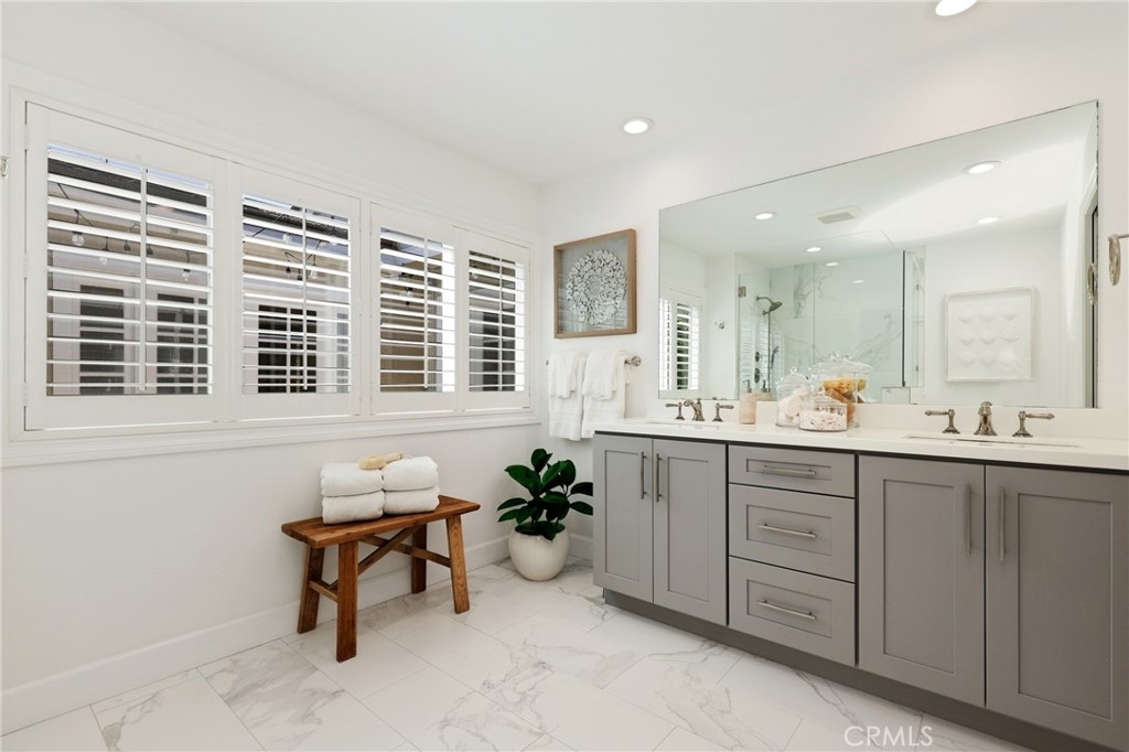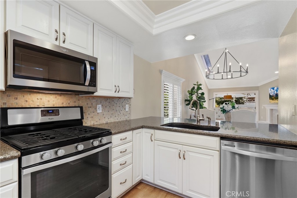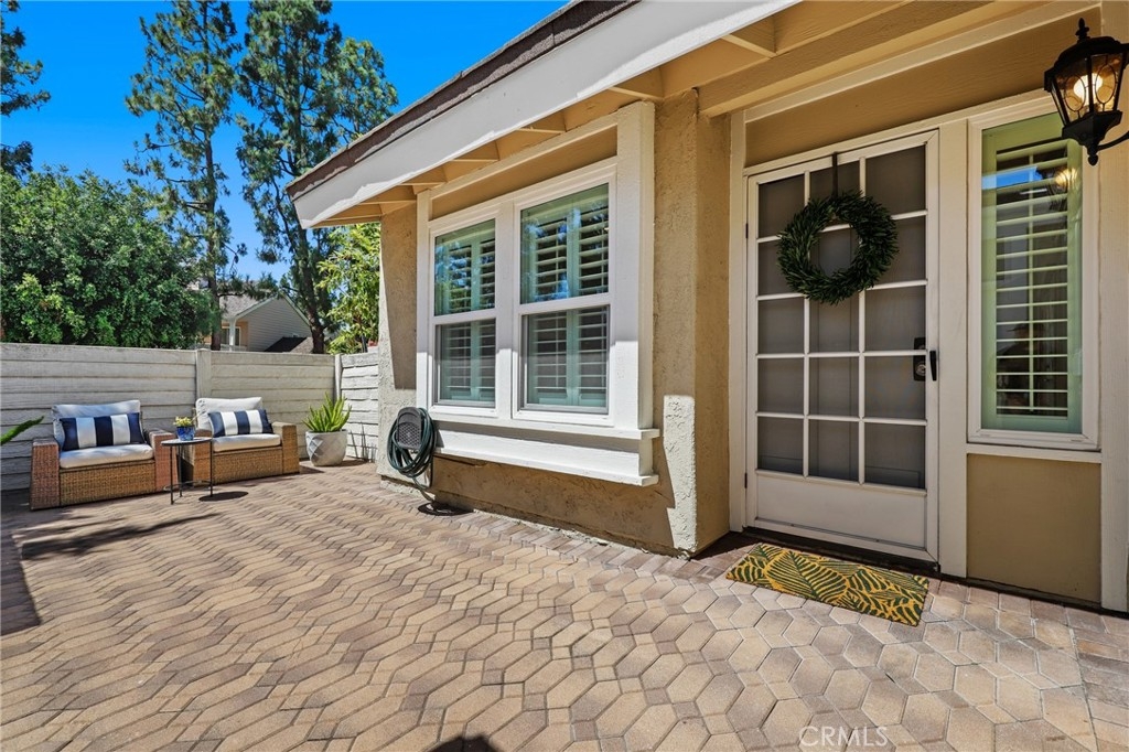 Welcome to this beautifully updated single-level corner unit on Yale Loop, just steps from North Lake in Irvine’s desirable Woodbridge community. This turnkey home features wide-plank vinyl flooring, vaulted ceilings, recessed lighting, crown molding, and abundant natural light from skylights, French doors, and large sliders that open to one of the largest patios in the neighborhood—perfect for outdoor entertaining. The remodeled kitchen includes Whirlpool stainless steel appliances, soft-close cabinetry, and a convenient pass-through. The spacious primary suite offers a recently upgraded bathroom with dual vanities and added windows for natural light. Secondary bedrooms share a stylishly renovated Jack-and-Jill bathroom with dual sinks and a tub/shower combo. Additional upgrades include dual-pane windows, plantation shutters, custom closet shelving, an EV charging outlet, tankless water heater, Lennox HVAC system, driveway, and a finished two-car garage with epoxy floors and custom storage. Enjoy Woodbridge's unmatched amenities—beach clubs, pools, tennis and pickleball courts, parks, trails—and walkable access to the lake and Woodbridge Village Center with shopping, dining, and entertainment options. Some highlights include tons of natural lighting, wide entry, vaulted ceilings in living room and master bedroom, skylight in guest bathroom and living room, crown molding and vinyl plank flooring throughout. Renovated primary bathroom, upgraded guest bathroom (added tub + tile), added new windows to primary bedroom and bathroom, added plantation shutters to all windows, added custom shelving to office closet and hall closet, added EV electrical outlet for electric car charging, added closet doors to guest bedroom. Close distance to lake and Woodbridge Village Center that has AMC movie theatre, Grocery Outlet Bargain Market, Sessions West Coast Deli, Yogurtland, and CorePower yoga.