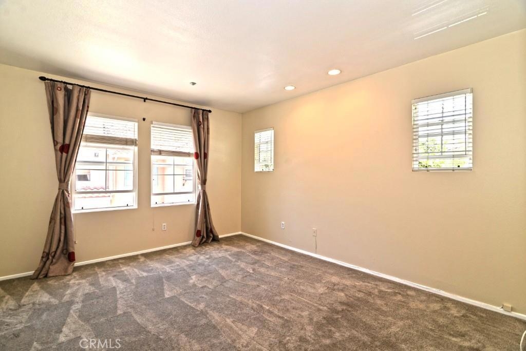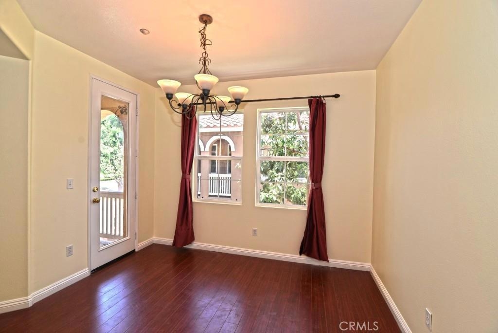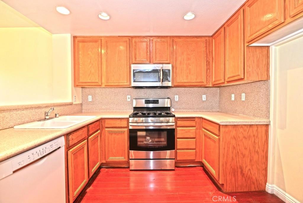 Ideal convenient location in gated Collage Community of Northwood Pointe. Situated at best end unit with only one common wall, charming unique 2 bedrooms & 2 bathrooms townhouse filled with natural light, has most living spaces including roomy master suite on the main level and a large upstairs 2nd bedroom. Upgrades include lovely kitchen counterstops & full backsplash, beautiful hardwood flooring, recessed lighting, new decorate hallway lighting, pretty fireplace molding, privacy door to upstairs bedroom, custom window covering, and more. Cozy & pleasant fireplace is in open living room. Separate dining room is adjacent to the open kitchen which features ample cabinet space, breakfast bar, and brand new stainless steel microwave & cooking stove. New fresh paint is throughout the house including garage and storage room. One car garage with lager storage room covered with new Epoxy paint, attached & located on the ground level. Peek-A-Poo mountain view from upstairs 2nd bedroom. The house has a reserved parking space PS 20 assigned and next to the front entrance. Just 5 minutes walk to Blue Ribbon Canyon View Elementary School and wonderful Grammy Award Winning Blue Ribbon Northwood High School.