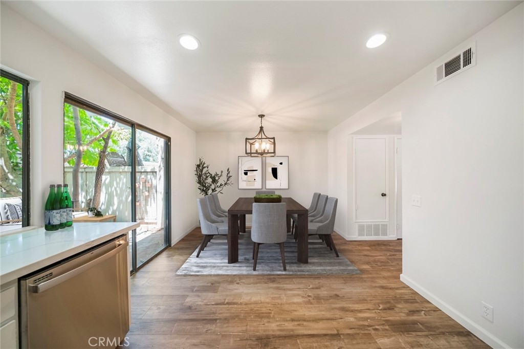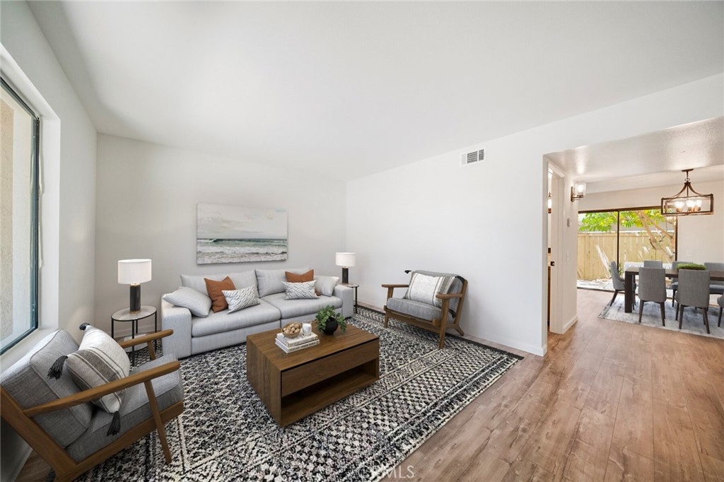 Newly renovated, turnkey home with scenic park views. This bright and airy 3 bedroom, 1.5 bathroom, 2-story home with no one living above or below has been tastefully updated throughout. The main level features fresh paint, new laminate flooring, new can lighting and designer light fixtures throughout. The redesigned kitchen has been updated with new quartz counters, all new hardware, new sink and faucet, and new stainless-steel 30’’ gas range, hood and dishwasher. Next to the kitchen, a formal dining space large enough for a dining table is framed by a new and modern chandelier. Rarely found in condos, this home features a separate laundry area with ample storage. Up the freshly painted staircase with new carpet, the three generously sized bedrooms all have new carpet, new hardware and new mirrored closet doors. The upstairs bathroom has been remodeled with a modern floor tile, new hardware and new quartz countertop. The spacious and private outdoor space includes a large storage area. The covered parking space is conveniently located directly behind the unit. The amenity rich community of Woodbridge offers multiple pools and spas, two lakes with docks, two beach lagoons, a splash pad, numerous parks with play equipment, multiple sport courts, and organized community events and activities. This beautiful home is located in the heart of Irvine, across the street from a park with playground, and is within a top-rated, award winning school district.