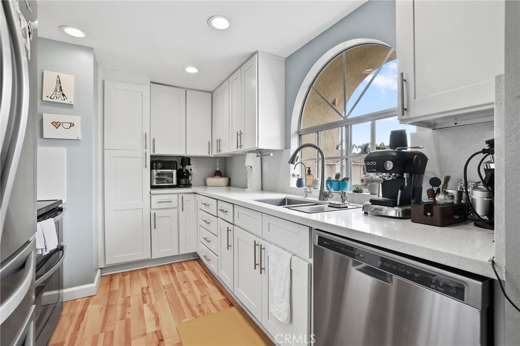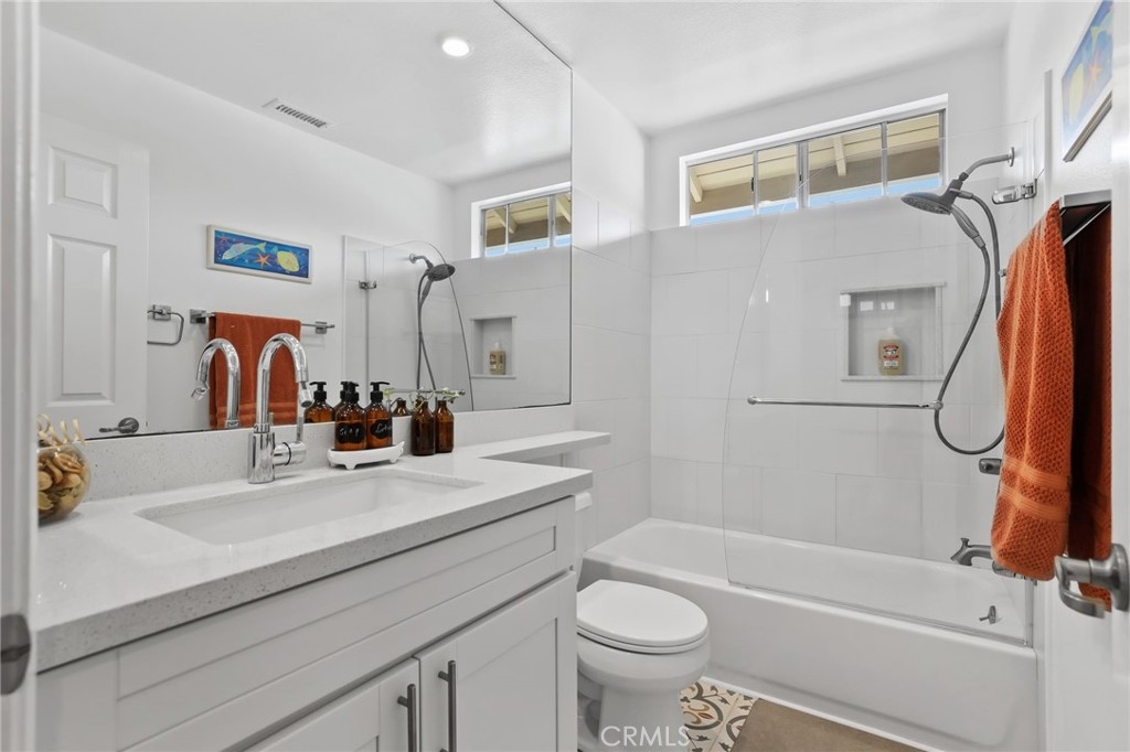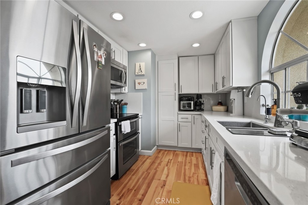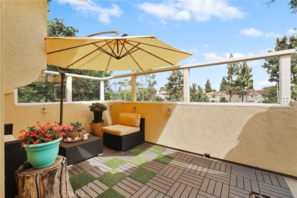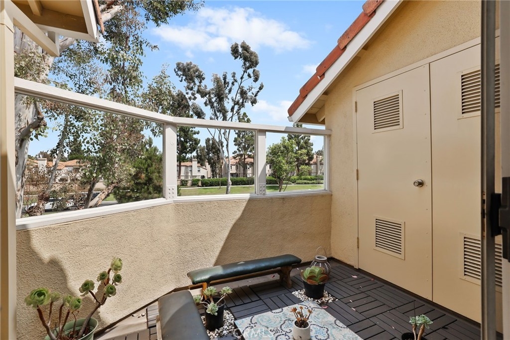 Discover this stunning, completely remodeled upstairs end-unit condo in the Westpark Tiempo community of Irvine. You are welcomed into the bright, open family room featuring a vaulted ceiling and an abundance of natural light pouring into this condo. The family room also has a cozy gas fireplace that seamlessly flows into the dining area, which includes a custom built-in work desk that doubles as a buffet area. The modern kitchen is equipped with quartz countertops and backsplash, white shaker soft-close cabinets, stainless steel appliances, and a deep sink with a custom faucet. The primary bedroom boasts dual closets, sliding doors to a private balcony, and an en-suite bathroom with a quartz-topped vanity and an oversized walk-in shower. The generously sized secondary bedroom with vaulted ceilings is adjacent to the full-hall bathroom. Additional features include closet organizers, Kohler sinks and toilets, touchless faucets in kitchen/primary bath, an indoor laundry closet with a washer and dryer, recessed lighting, scraped ceilings, a new heater pump/Air Conditioner and ductwork, kitchen water filtration system & nest thermostat. Enjoy the spacious front patio, a fully finished one-car garage with epoxy garage floor coating, an outlet for an Electric Vehicle charger, and an additional carport space. There is no one living above or below you! Enjoy community amenities such as a refreshing pool and soothing spa, and benefit from nearby shopping, dining options, and top-rated Irvine schools. No Mello Roos!