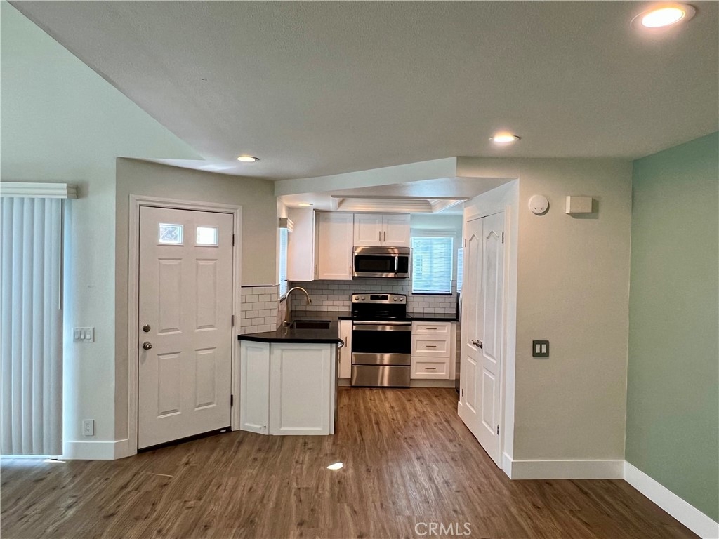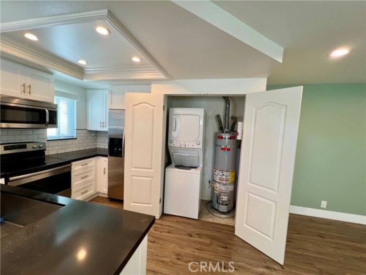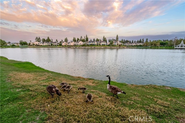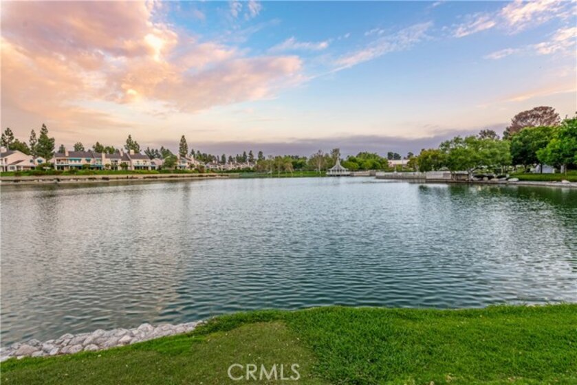 Luxurious end unit with a newer roof and exceptional upgrades throughout. The living room offers a soaring vaulted ceiling, a cozy fireplace, and a new vinyl slider that opens to a spacious patio deck—perfect for entertaining or relaxing. The gourmet kitchen showcases quartz countertops, a new subway tile backsplash, and quiet-close cabinet doors, along with a stainless steel refrigerator, microwave, sink, and newer range. A new stackable washer and dryer are conveniently located in the utility closet. The generously sized primary bedroom features mirrored wardrobe doors and an ensuite dressing area with a quartz countertop and quiet-close cabinetry. A striking spiral staircase leads to an expansive loft, ideal as a second bedroom, home office, or flex space. New luxury vinyl flooring enhances both levels, providing easy maintenance and a modern touch. Seller is related to the listing agent Residents enjoy all the world-class amenities of Woodbridge, including two lakes with sailing and fishing, pools, picnic areas, lagoons, sandy beaches, parks, ball fields, bike trails, and walking paths—creating a resort-like lifestyle in one of Irvine’s most sought-after communities.