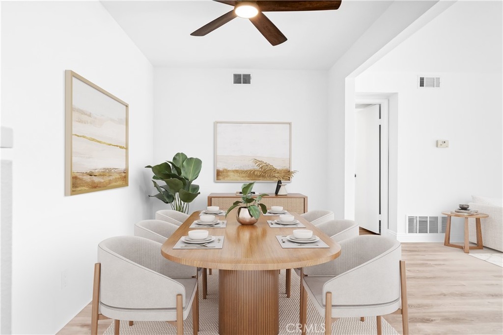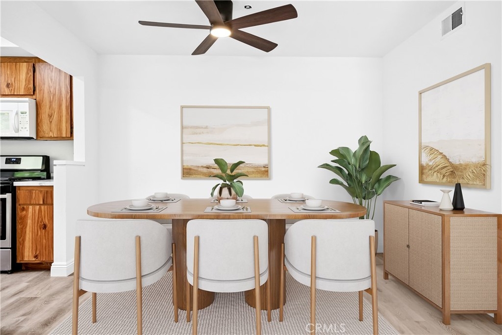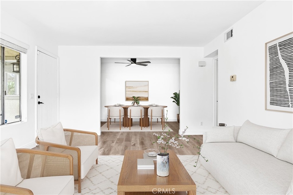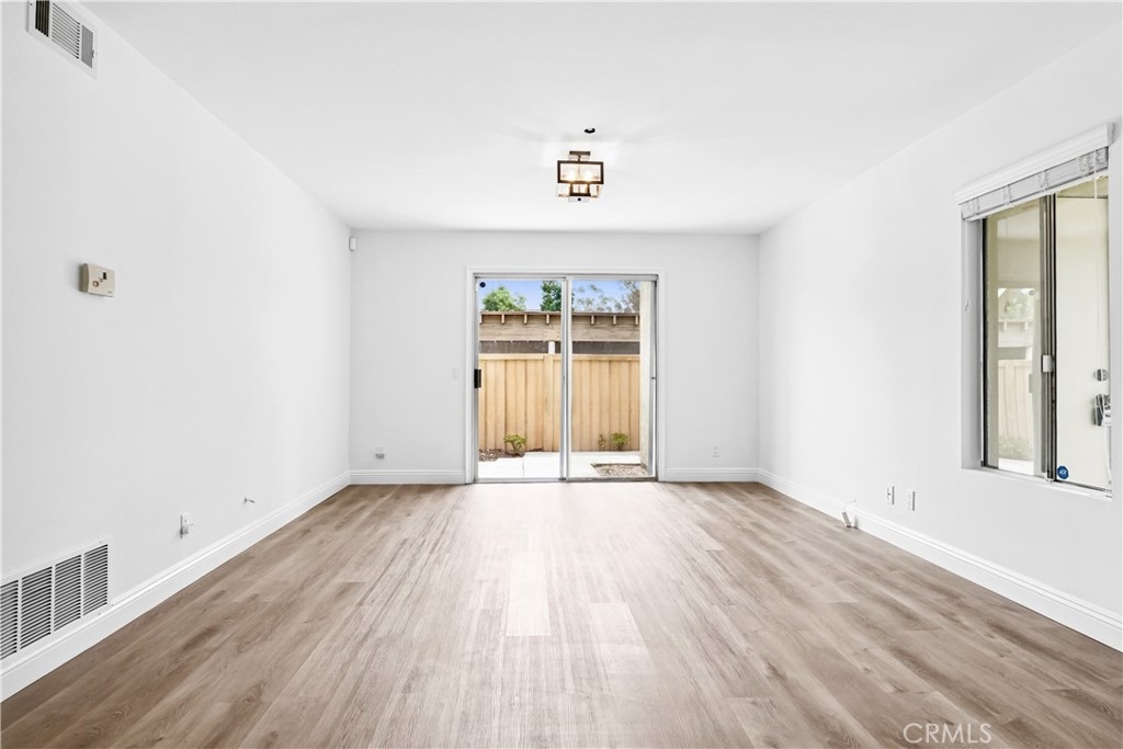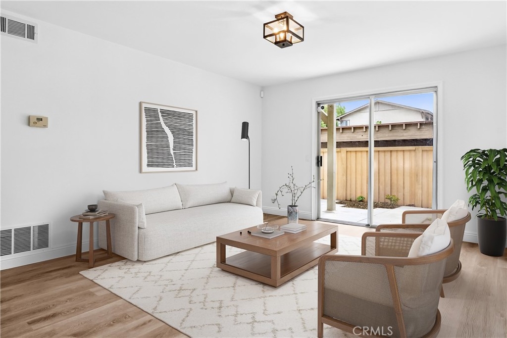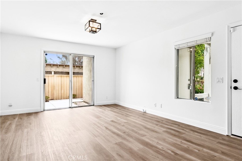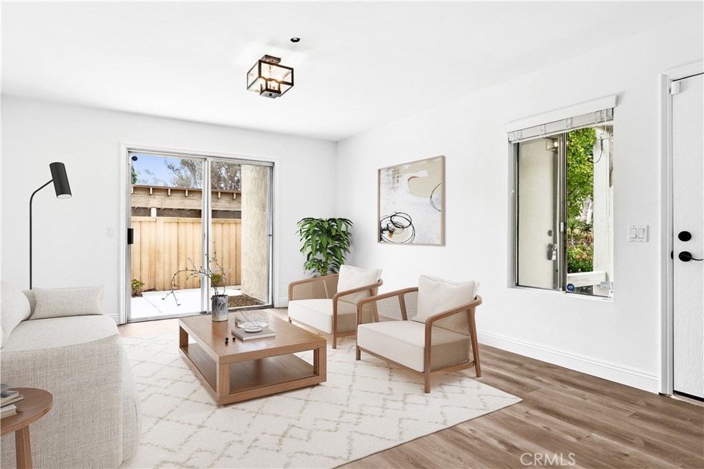 This charming, clean, and spacious one-bedroom, one-bathroom condo is filled with natural light and features an inviting open layout, luxury vinyl plank flooring, and fresh interior paint throughout. The bright living room opens to a private patio—perfect for entertaining—and flows into a lovely separate dining area. The kitchen features quartz-like countertops, wood cabinets, dishwasher, microwave, and stainless-steel sink, refrigerator and oven. The bedroom offers two large windows for ample light, while the updated bathroom includes a new vanity, modern mirror, stylish backsplash, and a quartz-like shower surround. Additional features include an oversized exterior storage closet, a covered carport, and no interior steps—all on one level. The home backs right up to the park and is a short one-minute walk to the pool and playground. This property includes access to Woodbridge’s unmatched amenities: two private lakes with boat rentals, quiet beaches, 22 swimming pools, pickleball, tennis, volleyball & basketball courts, miles of walking trails, gym, clubhouses, and more! Whether you're a first-time buyer, investor, or simply looking to enjoy a low-maintenance lifestyle in one of Orange County’s most desirable neighborhoods, this home checks every box. Walk to top-ranked schools and enjoy a short drive or bike ride to UCI, Fashion Island, South Coast Plaza, beautiful beaches, world-class dining, theaters, and more.