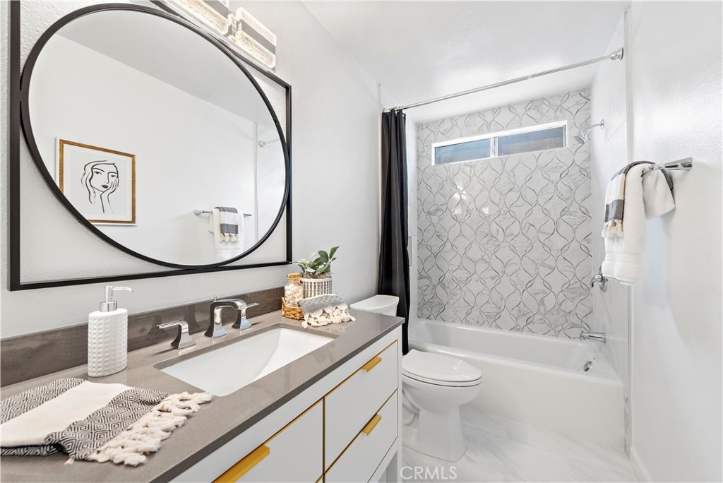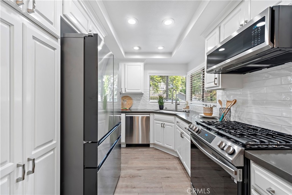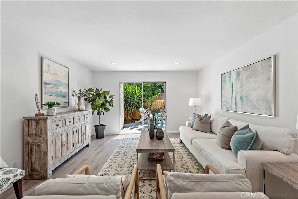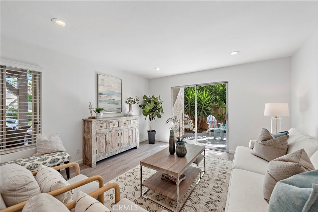 This highly upgraded 3 Bedroom 2 bath ground floor condo is in the Park Vista community of Woodbridge! As you enter the spacious living room with a grand view of the backyard, you will see the beautiful new taupe-gray wood-planked floors throughout. The formal dining room leads you into the open concept kitchen featuring over-the-sink windows, all brand-new top-of-the-line appliances, gray Corian counters, white cabinets and ample counter space. The bathrooms have also been remodeled, everything new including glass shower enclosure and gorgeous lighting fixtures. All New A/C and heater. Every door inside is also brand new, with all windows and sliders to be replaced soon. This turnkey home is drenched in natural light from the sliding glass doors leading to the amazing backyard patio overlooking an expansive grassy area surrounded by tropical foliage and a peach tree. Your private outdoor space can be accessed from both the living room and the large master bedroom. There are an abundance of guest parking spaces that do not require permits. The Park Vista Community has its own pool, spa and park close to this unit. Woodbridge's HOA additionally provides tennis courts, clubhouses, playgrounds, and pathways for walking, biking, and hiking. The North and South Lake Lagoon areas both have beach clubs, lagoon-style swimming pools, boats, kayaks, and sand volleyball courts for residents to use. Attend award-winning Irvine Unified Schools. Close to the 405 freeway, Irvine Spectrum, UCI, Kaiser and HOAG Medical Facilities.