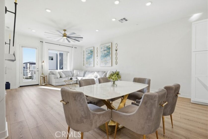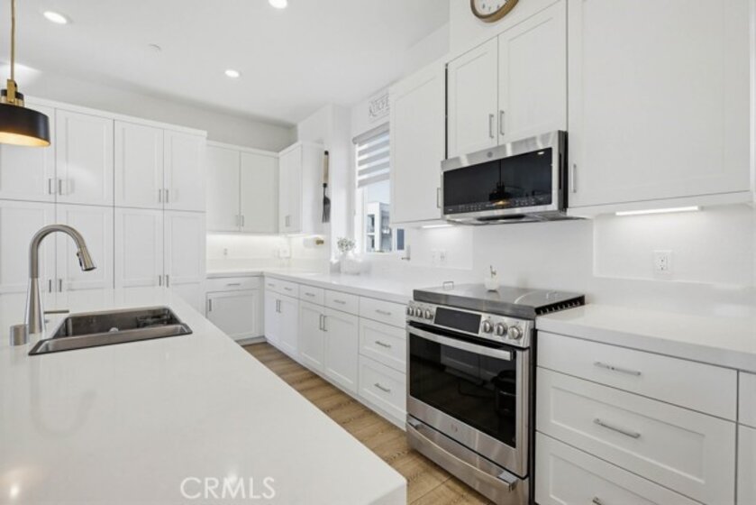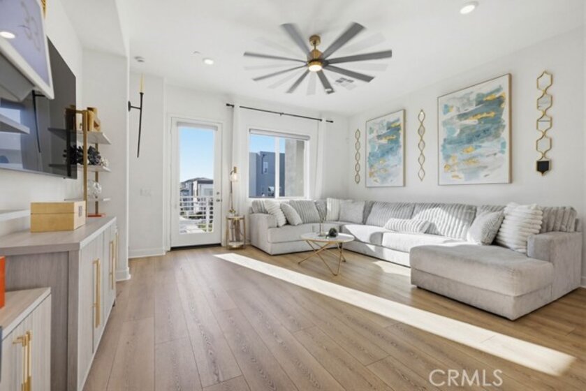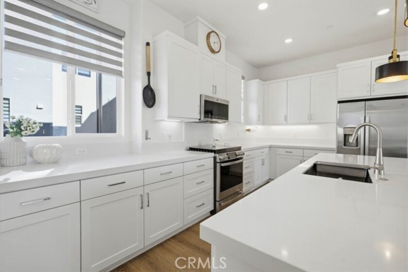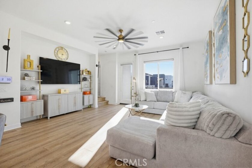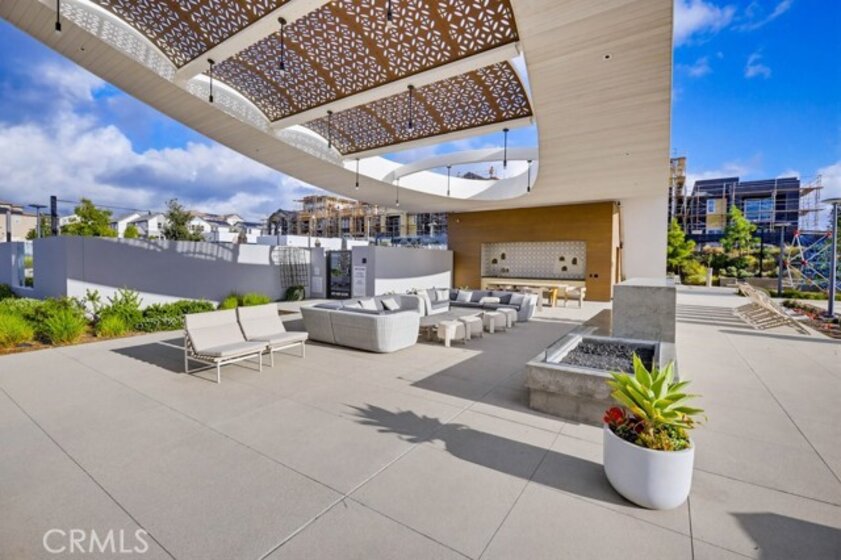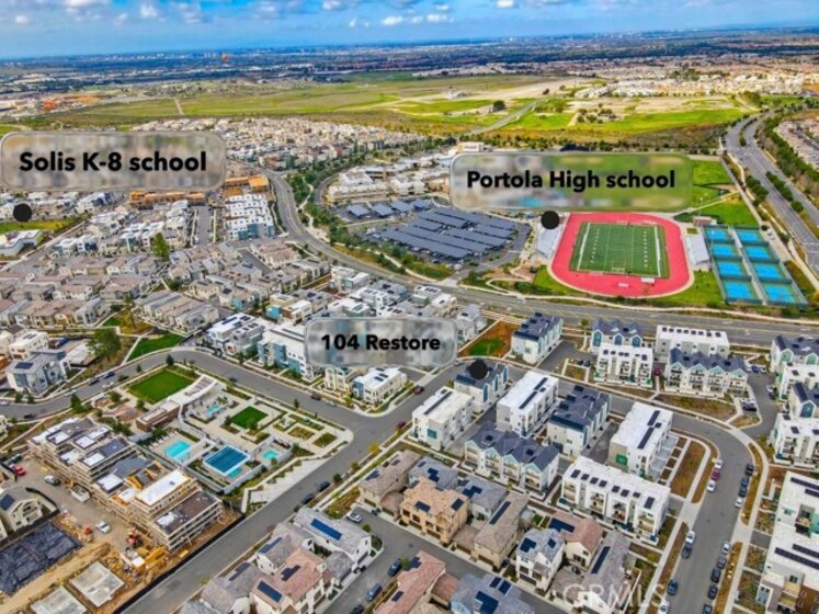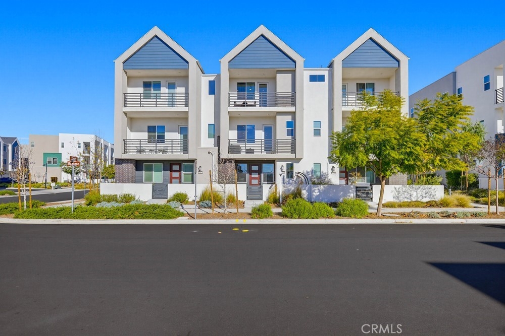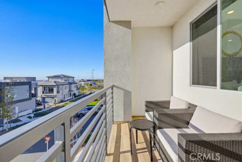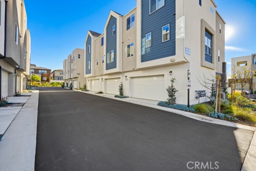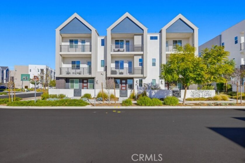 Located within Irvine’s Great Park community, this contemporary three-level home offers a flexible layout and a clean, modern aesthetic throughout. Updated flooring spans all levels and outdoor space, creating a cohesive and polished feel. Part of the new desirable Mulberry Collection in Solis Park, the property is only steps away from Portola High school and Solis K-8 school. The first level features a versatile entry-level flex space ideal for a home office, den, or bonus room, along with access to a patio. This level also includes a dedicated storage room and a side-by-side two-car garage with additional storage and an EV charger. The second level serves as the main living area, featuring an open-concept kitchen, dining, and living space enhanced by recessed lighting and updated flooring. The kitchen is finished with white shaker cabinetry, stone countertops, and a large island. A balcony extends the living space outdoors, and a convenient powder bathroom completes this level. On the third floor are two bedrooms, each with its own ensuite upgraded bathroom. One bedroom includes a walk-in closet, while the primary suite features a spacious walk-in closet, dual-sink vanity, updated finishes, and access to a private balcony. The double stack laundry is conveniently located on the same floor as the bedrooms. Located in the heart of Orange County Great Park with acess to resort-style amentites including parks. Residents enjoy pools, fitness center, tennis and basketball courts, clubrooms and BBQ areas. Minutes to Woodbury Town Center, Irvine Spectrum, major freeways, Kaiser Permanente and John Wayne airport. Zoned for award winning Irvine Unified School District. This property also includes paid off Solar!