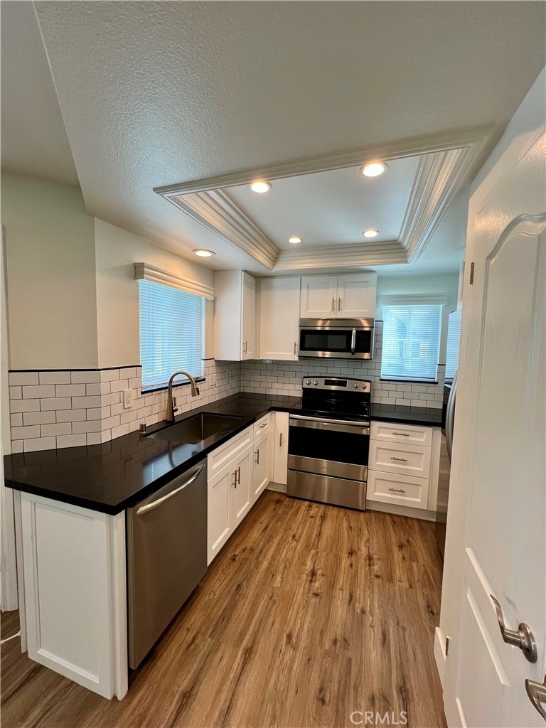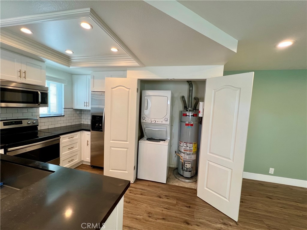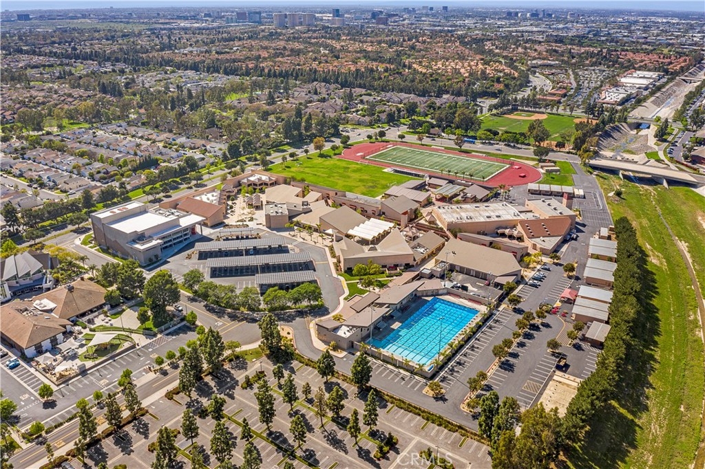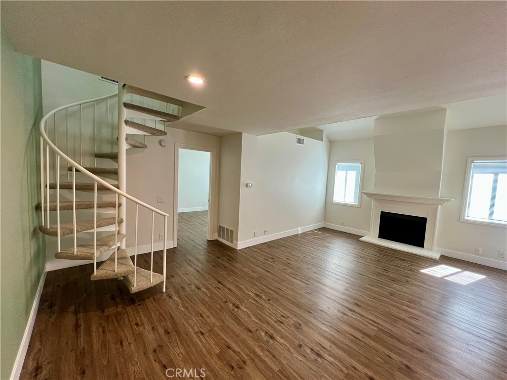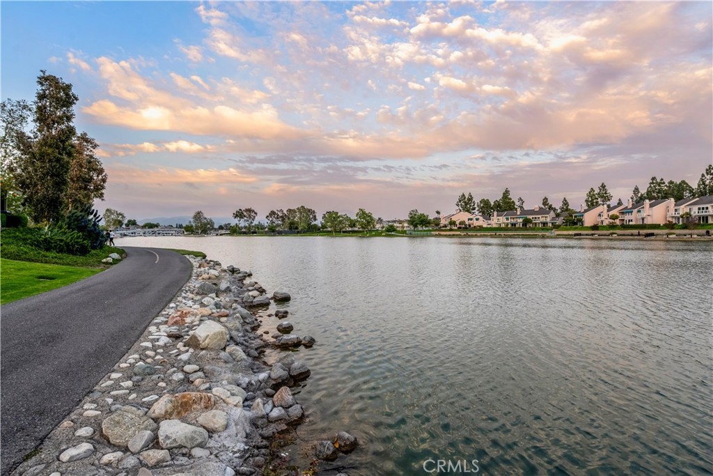 Luxurious end unit with a newer roof and exceptional upgrades throughout. The living room offers a soaring vaulted ceiling, a cozy fireplace, and a new vinyl slider that opens to a spacious patio deck—perfect for entertaining or relaxing. The gourmet kitchen showcases quartz countertops, a new subway tile backsplash, and quiet-close cabinet doors, along with a stainless steel refrigerator, microwave, sink, and newer range. A new stackable washer and dryer are conveniently located in the utility closet. The generously sized primary bedroom features mirrored wardrobe doors and an ensuite dressing area with a quartz countertop and quiet-close cabinetry. A striking spiral staircase leads to an expansive loft, ideal as a second bedroom, home office, or flex space. New luxury vinyl flooring enhances both levels, providing easy maintenance and a modern touch. Seller is related to the listing agent Residents enjoy all the world-class amenities of Woodbridge, including two lakes with sailing and fishing, pools, picnic areas, lagoons, sandy beaches, parks, ball fields, bike trails, and walking paths—creating a resort-like lifestyle in one of Irvine’s most sought-after communities.