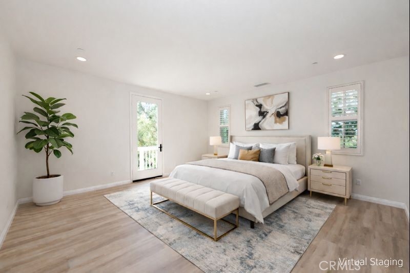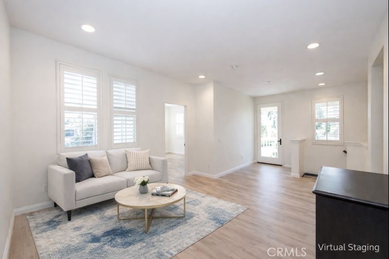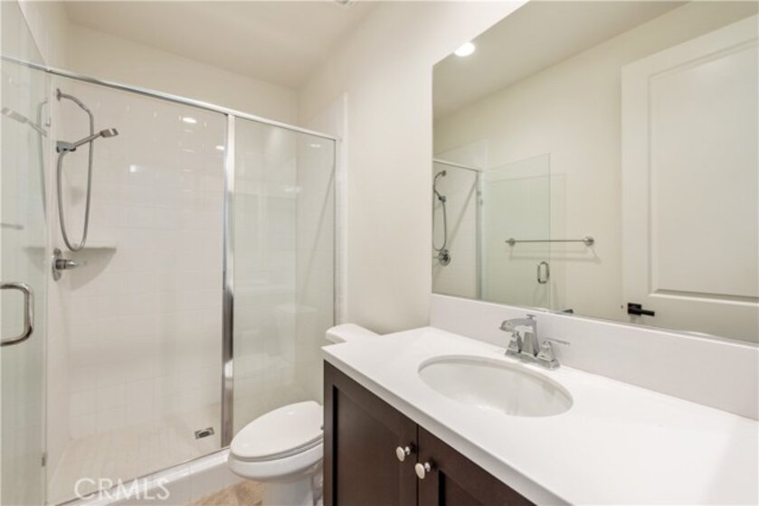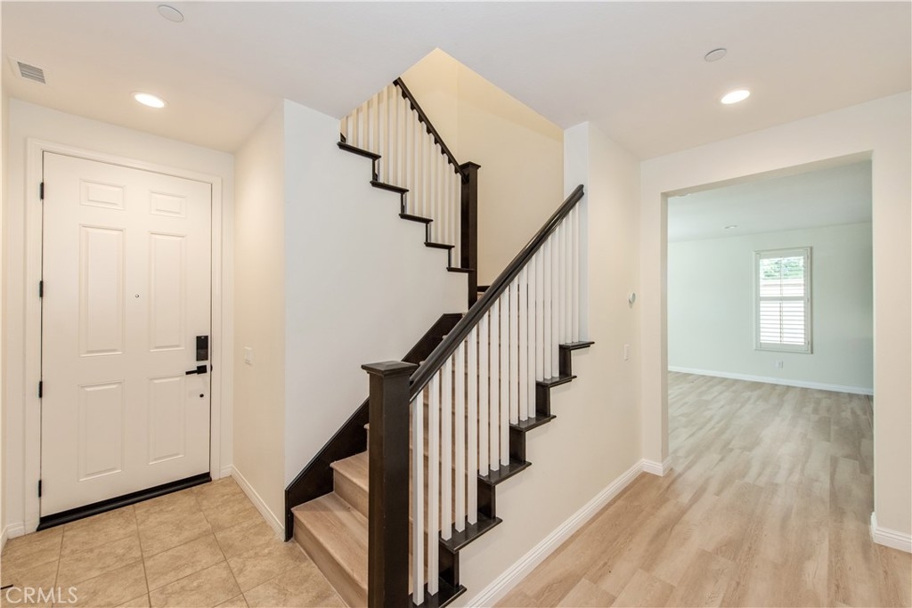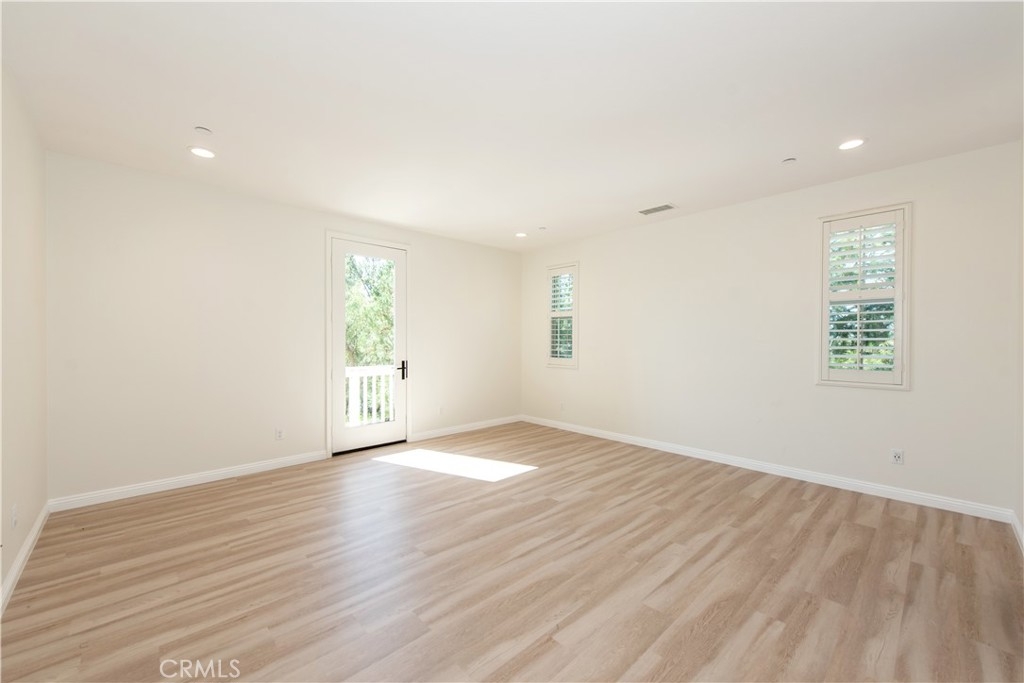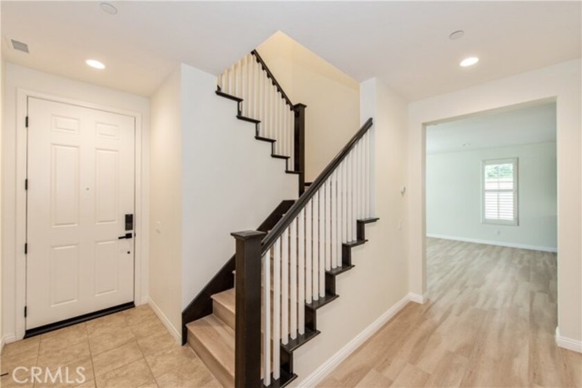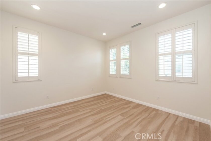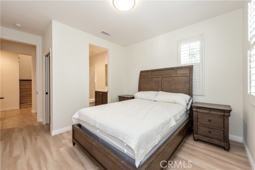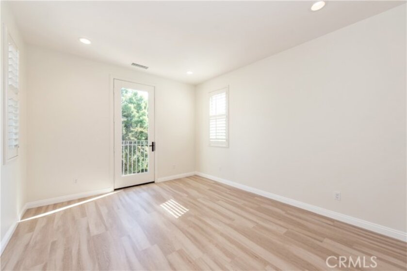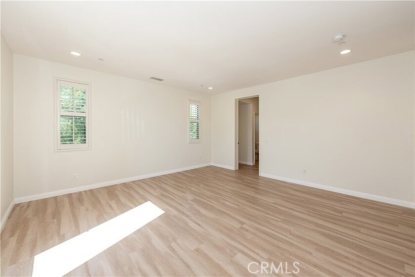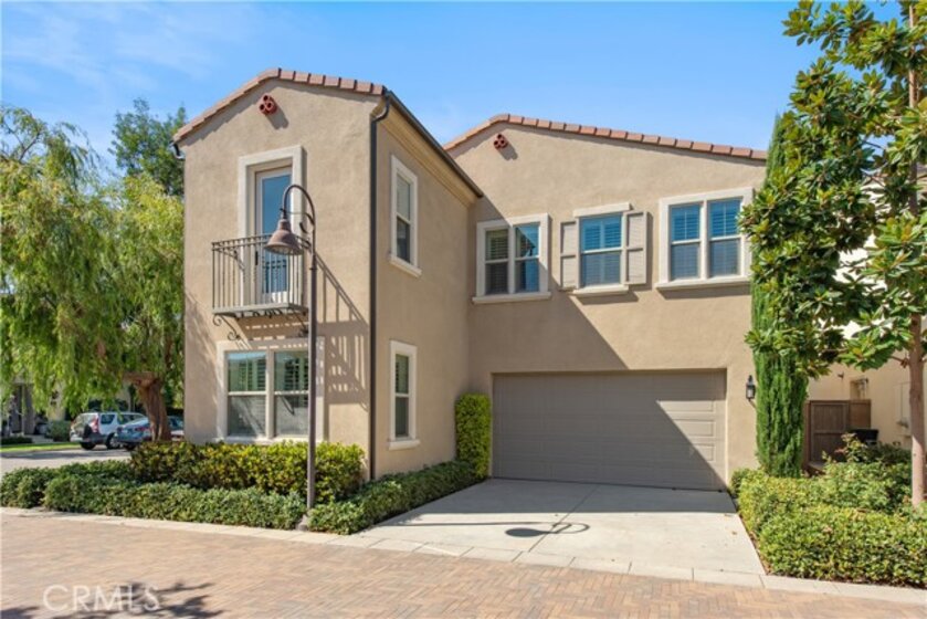 Located in the highly sought-after Portola Springs village of Irvine, this elegant 4-bedroom, 3.5-bath residence is situated on a premium corner lot, offering enhanced privacy, abundant natural light, and strong curb appeal. The home features a rare full driveway and an attached two-car garage. The thoughtfully designed layout includes a welcoming street-facing entrance and a side-entry garage opening to a motor court, providing both functionality and privacy. A first-floor bedroom suite with a private bath offers flexible use for guests or a home office. This space is filled with natural light from windows on three sides and includes a spacious shower. A nearby powder room and coat closet add everyday practicality, while upgraded flooring throughout the main living areas delivers a clean, cohesive finish. The main living space is arranged in an open-concept great room, seamlessly connecting the living room, dining area, and kitchen. Large windows and sliding glass doors bring in abundant natural light and open to the patio, creating an easy indoor-outdoor flow. The kitchen features a central island with seating, generous counter space, extensive cabinetry, and direct access to the garage. The patio offers a comfortable setting for outdoor dining and entertaining. Upstairs, a versatile bonus room provides flexible space for a media lounge, home office, or play area. The second level also includes three additional bedrooms, a full bathroom with dual sinks, and a dedicated laundry room with side-by-side washer and dryer space and an optional sink. The primary suite occupies its own wing, offering privacy and a relaxing retreat. The bedroom features a Juliet balcony, ample wall space, and a large walk-in closet. The spa-inspired primary bathroom includes a long dual-sink vanity, a soaking tub, and an oversized walk-in shower with seating. Located within the thoughtfully planned Portola Springs community, residents enjoy resort-style pools, parks, playgrounds, sports courts, and scenic hiking and biking trails. The neighborhood is conveniently close to top-rated Irvine schools, shopping and dining destinations, and major freeways. An owned solar system further enhances long-term value by improving energy efficiency and reducing utility costs.