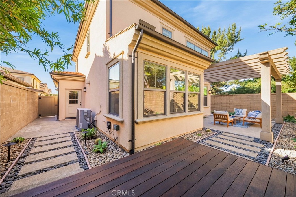 Welcome to 125 Island Coral, a beautiful detached home located in the heart of Cypress Village, one of Irvine’s most sought-after master-planned communities. Tucked along a quiet, interior street, this 3-bedroom, 2.5-bathroom home offers 1,745 SQFT of thoughtfully designed living space and an attached 2-car garage, combining comfort, style, and functionality in one stunning package. Built in 2016, this home showcases a bright, open floorplan with high ceilings, natural light, and designer upgrades throughout. The Great Room seamlessly flows into the gourmet kitchen, featuring crisp white shaker cabinetry, Quartz countertops, white tile backsplash, stainless steel appliances, and a spacious center island—perfect for meal prep and casual dining. A dedicated dining area off the kitchen adds charm and function, while sliding glass doors lead to a low-maintenance backyard that features a custom deck surrounded by mature bamboo, fruit trees in handcrafted concrete pottery, and two distinct entertaining spaces—one under a shaded covered patio, and another on the elevated deck—offering the perfect setting for zen-inspired relaxation or hosting guests. Upstairs, the spacious primary suite offers a personal retreat with a walk-in closet, dual vanities, and a spa-inspired walk-in tiled shower. Two generously sized secondary bedrooms, a full hall bath, and an upstairs laundry room with built-in cabinetry complete the second level. Additional highlights include recessed lighting, custom window treatments, tankless water heater, and energy-efficient systems throughout. Enjoy resort-style living with Cypress Village amenities including multiple Junior Olympic pools and spas, tot lots, picnic areas, sports courts, and lush parks—all within walking distance. Zoned for the top-rated Irvine Unified School District, including Cypress Village Elementary, Jeffrey Trail Middle School, and Irvine High School. Ideally situated near Woodbury Town Center, freeways, shopping, and dining, this move-in ready home offers the best of Irvine living. Don’t miss your chance to own this turnkey beauty in one of Orange County’s most vibrant communities!