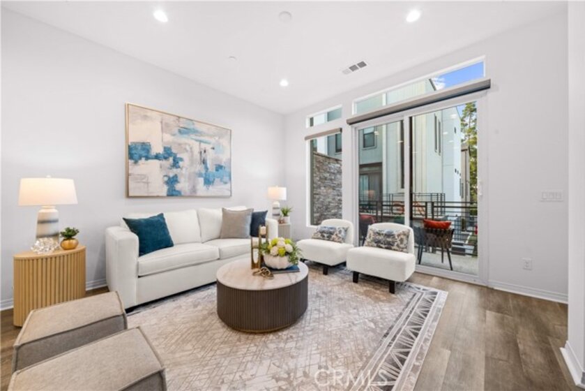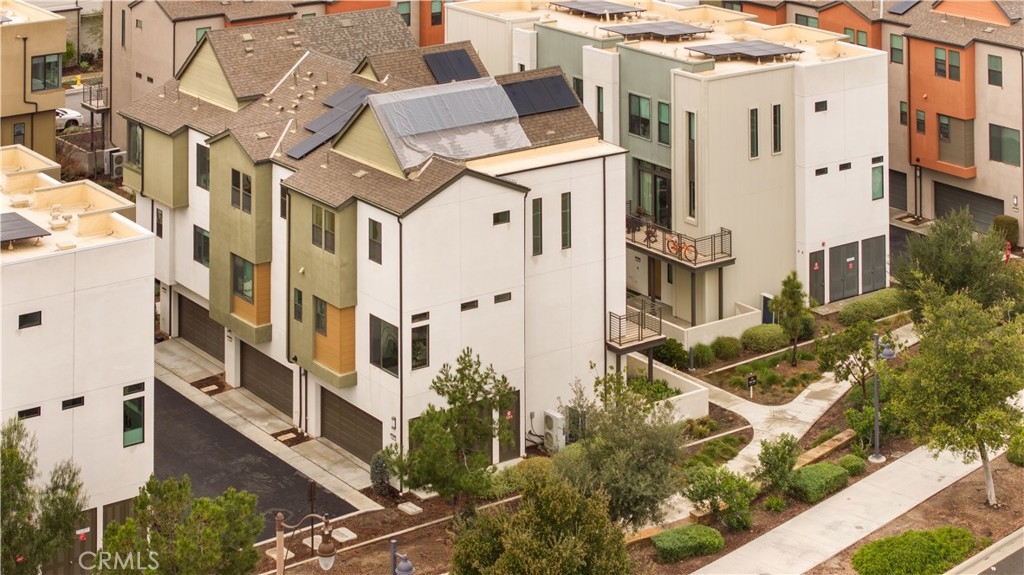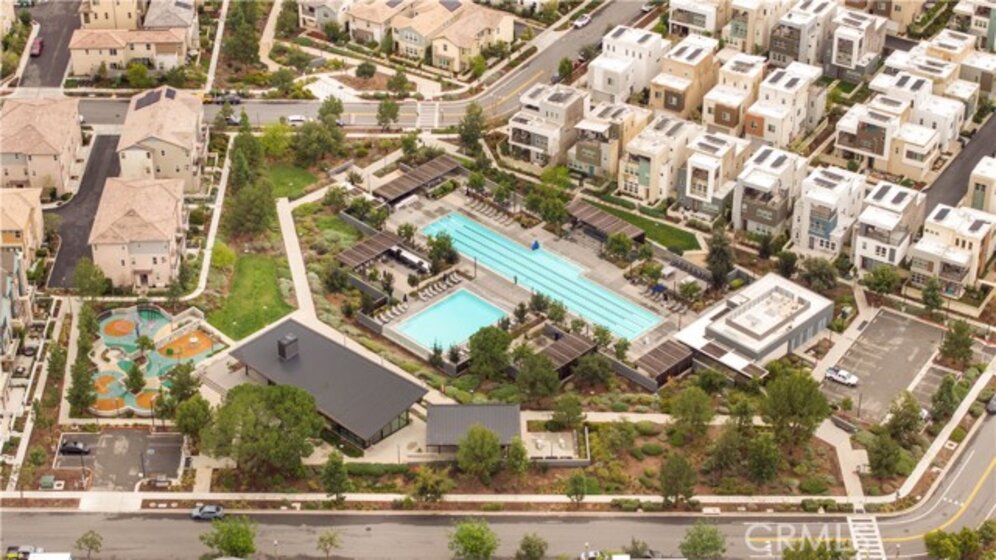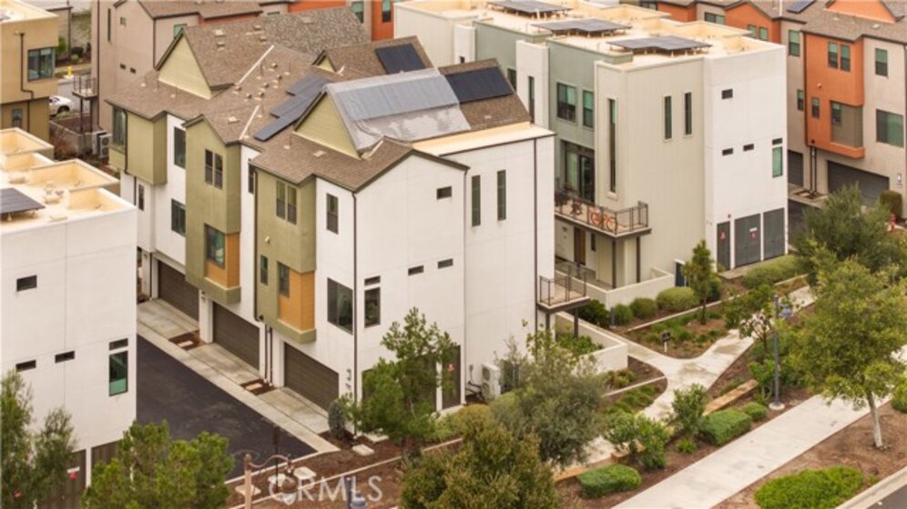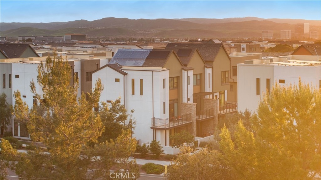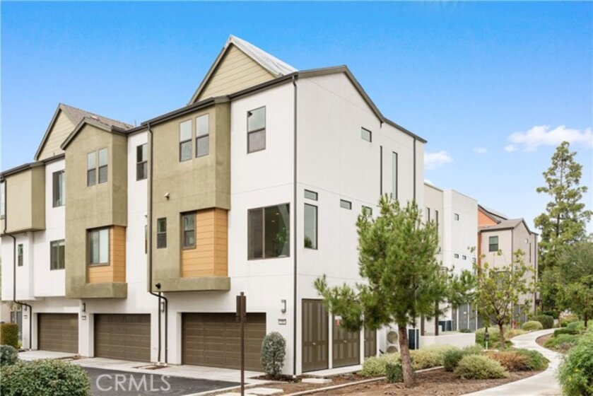 Located in the highly desirable Great Park community, this modern corner-unit residence offers abundant natural light, mountain views, and exceptional walkability. Ideally situated within a short walk to both Portola High School and Solis Park K-8 School, the location is one of the home’s most compelling features. The first level features direct-access garage space and entry access to the home. The second level serves as the main living area, showcasing a bright open floor plan with high ceilings and expansive windows that capture beautiful sunset skies and mountain views. The living and dining areas flow seamlessly into the contemporary kitchen, highlighted by a generously sized center island with ample prep space and storage—ideal for accommodating multiple appliances and everyday cooking. Clean modern finishes throughout enhance the home’s inviting atmosphere. Hunter Douglas motorized window treatments with blackout layers add both convenience and comfort. The third level includes two spacious bedroom suites, each with its own en-suite bathroom and walk-in closet, offering both privacy and functionality. A conveniently located laundry area completes the upper floor. As a desirable corner unit, the home benefits from additional windows, enhanced privacy, and excellent natural light throughout the day. The professionally designed front yard includes an irrigation system and solar lighting, creating an attractive and low-maintenance outdoor setting. Equipped with solar panels for improved energy efficiency, residents also enjoy access to Great Park’s extensive amenities, including parks, Olympic-size pools, trails, and community facilities, providing a vibrant and convenient lifestyle in one of Irvine’s most sought-after neighborhoods.