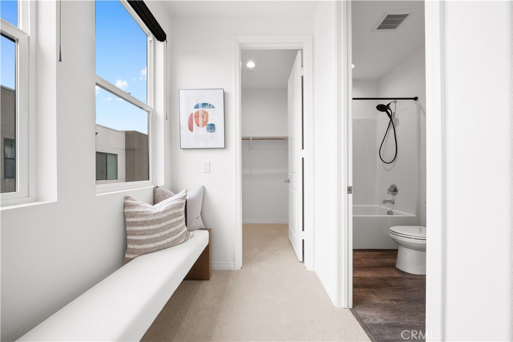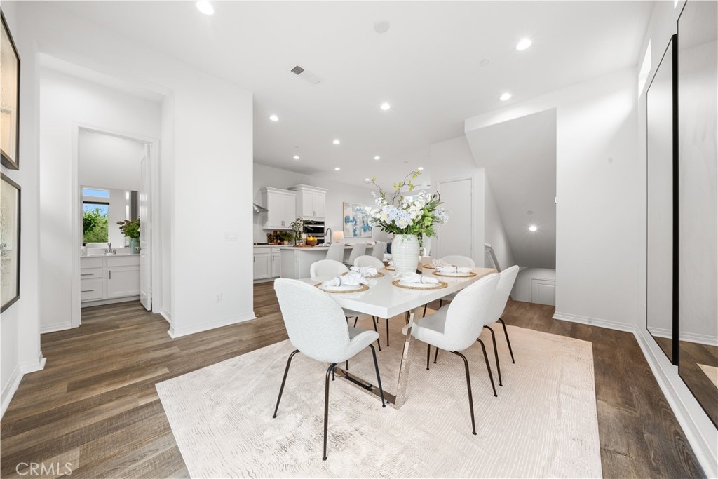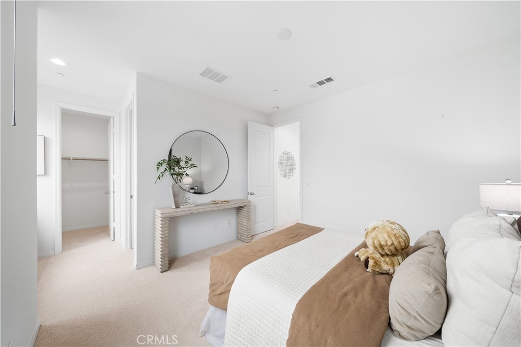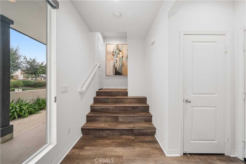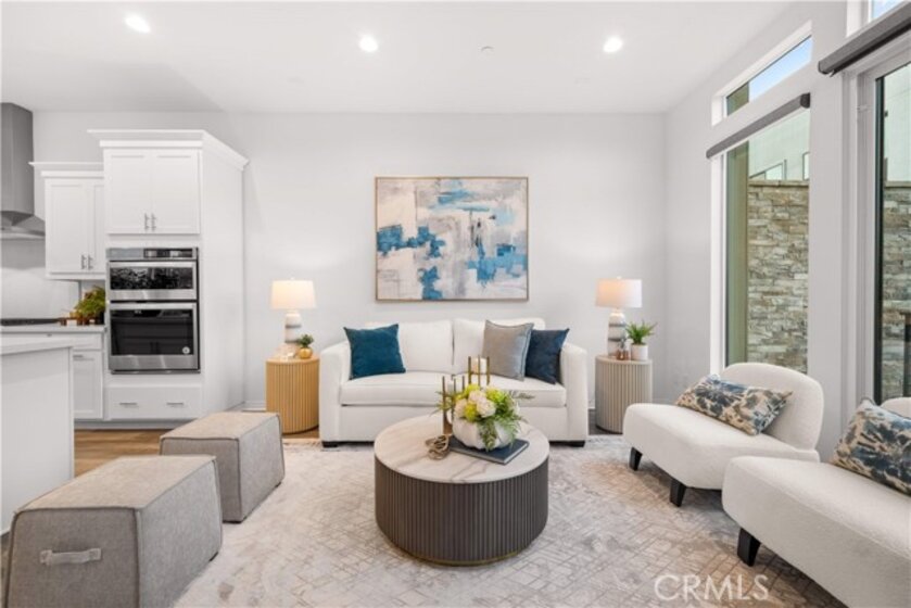 Located in the highly desirable Great Park community, this modern corner-unit residence offers abundant natural light, mountain views, and exceptional walkability. Ideally situated within a short walk to both Portola High School and Solis Park K-8 School, the location is one of the home’s most compelling features. The first level features direct-access garage space and entry access to the home. The second level serves as the main living area, showcasing a bright open floor plan with high ceilings and expansive windows that capture beautiful sunset skies and mountain views. The living and dining areas flow seamlessly into the contemporary kitchen, highlighted by a generously sized center island with ample prep space and storage—ideal for accommodating multiple appliances and everyday cooking. Clean modern finishes throughout enhance the home’s inviting atmosphere. Hunter Douglas motorized window treatments with blackout layers add both convenience and comfort. The third level includes two spacious bedroom suites, each with its own en-suite bathroom and walk-in closet, offering both privacy and functionality. A conveniently located laundry area completes the upper floor. As a desirable corner unit, the home benefits from additional windows, enhanced privacy, and excellent natural light throughout the day. The professionally designed front yard includes an irrigation system and solar lighting, creating an attractive and low-maintenance outdoor setting. Equipped with solar panels for improved energy efficiency, residents also enjoy access to Great Park’s extensive amenities, including parks, Olympic-size pools, trails, and community facilities, providing a vibrant and convenient lifestyle in one of Irvine’s most sought-after neighborhoods.