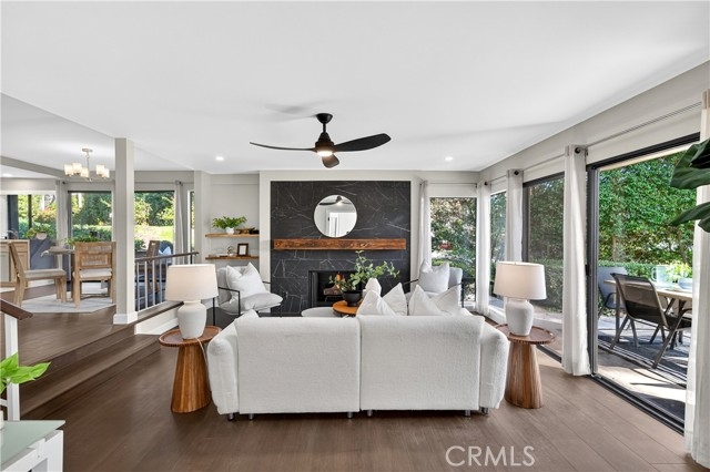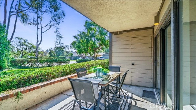 BEAUTIFULLY REMODELED CORNER CONDO ON A PRIVATE GREENBELT WITH AN OPEN FLOOR PLAN AND THREE SEPARATE PATIOS. This bottom-level residence offers one-level living with high smooth ceilings, recessed lighting, and large windows that fill the space with natural light. The den has been converted into a true third bedroom complete with doors and a closet. The kitchen, dining room, and living room are seamlessly connected, while each area, including the spacious primary bedroom, has its own sliding glass door leading to a patio. Situated down the hall, the front bedroom is conveniently located next to the hall bathroom, providing easy access for guests, while further along is the primary bedroom with its own ensuite bathroom featuring a double-sink vanity and a privacy door to the shower. Recent updates include a new roof and tenting completed in Summer 2023, with the HOA special assessment fully paid. The remodel, which is HOA approved and permitted, features a new HVAC system, porcelain tile flooring in the kitchen and bathrooms, Shaw luxury vinyl plank flooring throughout, solid core doors, elegant maple kitchen cabinets, quartz countertops and backsplashes, LED mirrors in bathrooms, a striking black marble porcelain tile fireplace wall, and fresh paint throughout. Resident amenities include two community pools and spas, with association dues covering water, trash, and exterior maintenance. Located in the acclaimed Irvine School District, including University High, this condo is conveniently situated near UCI, William Mason Park, John Wayne Airport, Newport Beach, and Fashion Island, providing a truly turnkey home with an interior that feels like new construction. See Virtual 3D Walkthrough at https://my.matterport.com/show/?m=t6zHgD1K9RW&brand=0