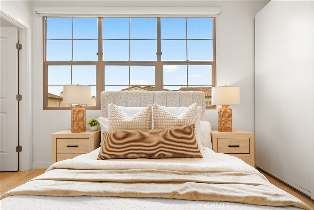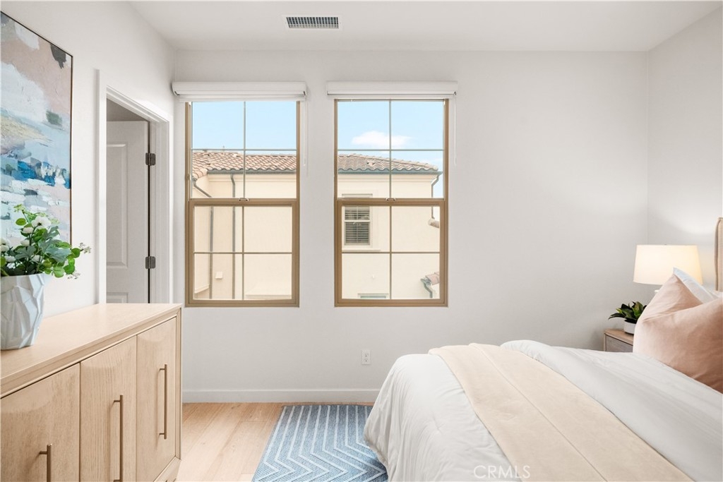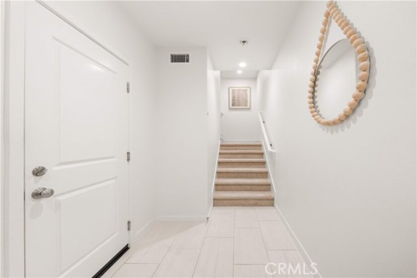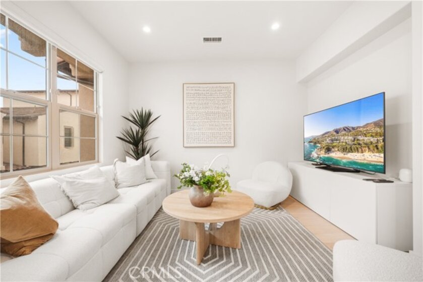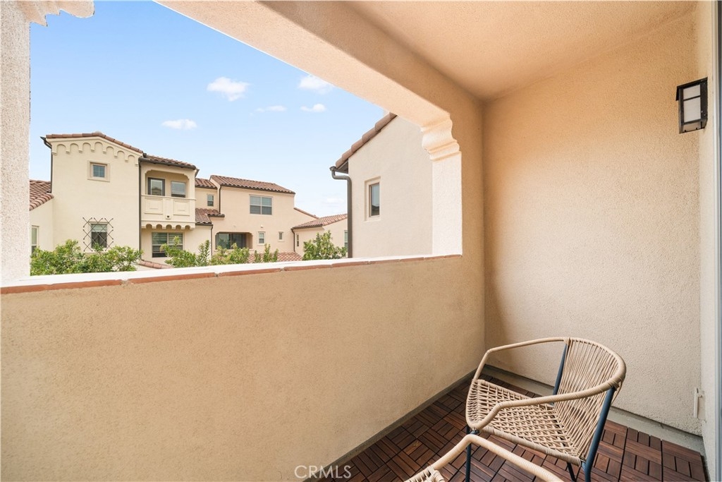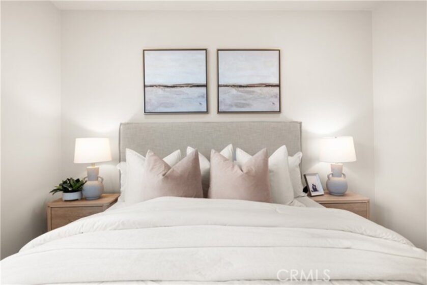 Situated in the serene hillside setting of Portola Springs, 184 Elkhorn is a beautifully maintained Brisa Plan 1 condominium in the heart of Irvine. The home showcases high-end engineered hardwood flooring throughout, creating a seamless and elevated feel, complemented by a bright, open layout designed for both comfort and functionality. The modern kitchen is thoughtfully appointed with quartz countertops, white shaker-style cabinetry, stainless steel appliances, and a generous island with bar seating, seamlessly connecting to the living and dining spaces filled with natural light. The seller has also installed a brand-new premium heated water purification system, along with a whole-house water softener system, ensuring improved water quality, reduced mineral buildup, and enhanced protection for plumbing and appliances. A private balcony off the dining area provides a pleasant extension of the indoor living space. The living room and bedrooms are enhanced with sleek motorized window shades, offering a modern, tech-forward touch while providing effortless light control and privacy. Upstairs, the residence offers two spacious en-suite bedrooms, including a well-designed primary suite with a walk-in closet, dual vanities, and a tiled walk-in shower. Additional highlights include upstairs laundry, high ceilings, recessed lighting, an energy-efficient whole house fan, and a tankless water heater. The direct-access two-car attached garage features built-in storage and is equipped with a Tesla-compatible EV charging outlet, making it ideal for electric vehicle owners. Residents of Portola Springs enjoy access to an impressive collection of resort-style amenities, including Olympic and junior Olympic swimming pools, clubhouses, tennis and sports courts, beach volleyball courts, parks, playgrounds, and miles of scenic walking and biking trails. Ideally located near the top of the community, this home is within walking distance to Loma Ridge Elementary School and Portola Springs Community Park, just minutes from Woodbury Town Center and Irvine Spectrum, and a short drive to Laguna Beach and John Wayne Airport.