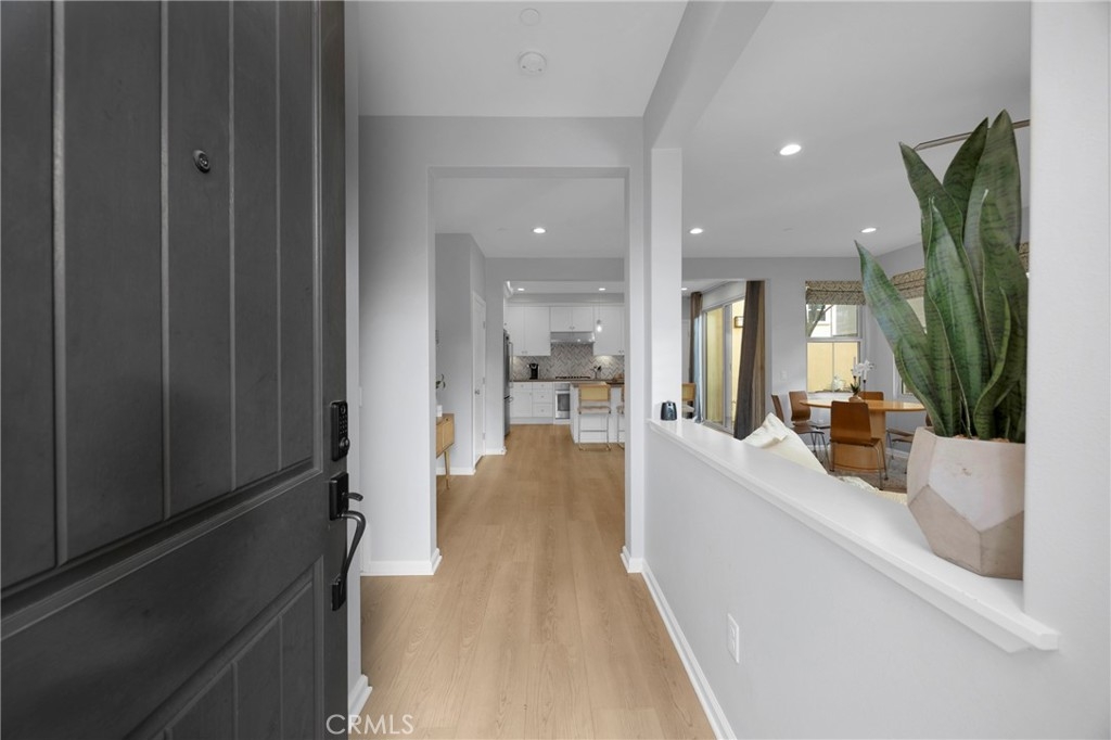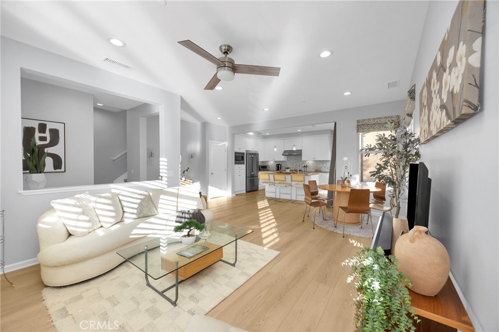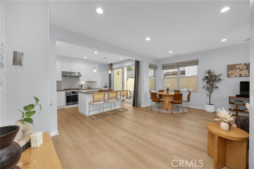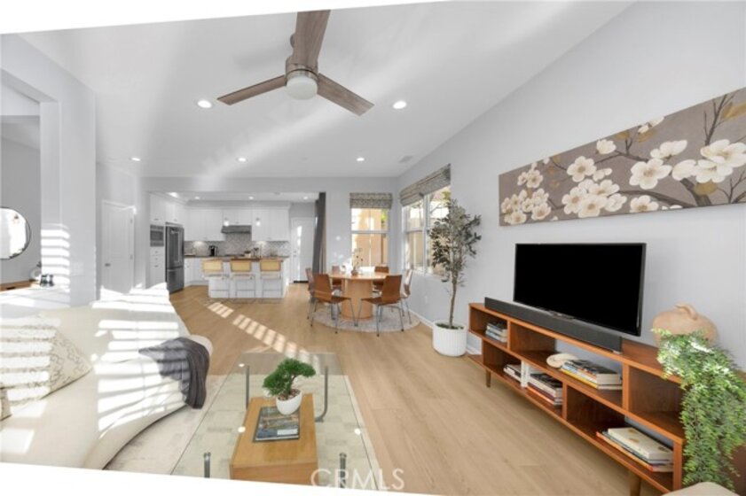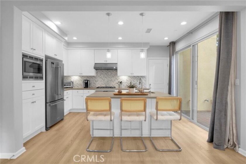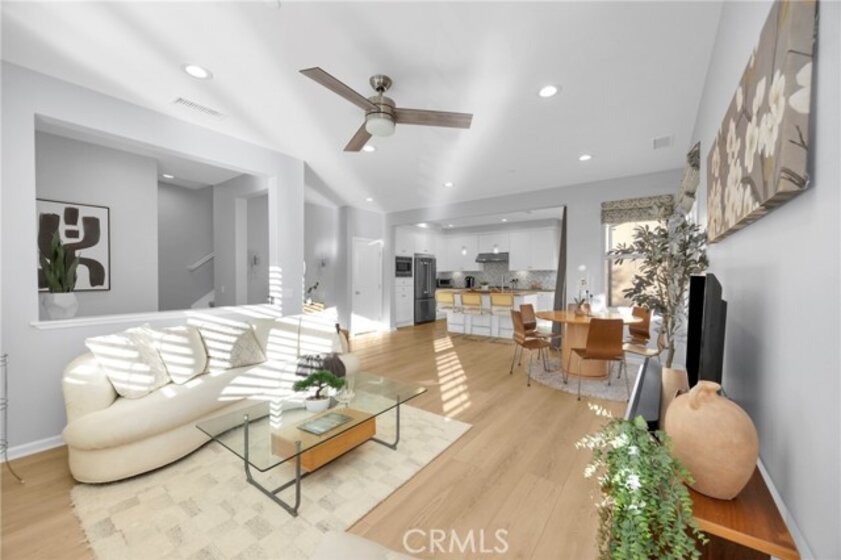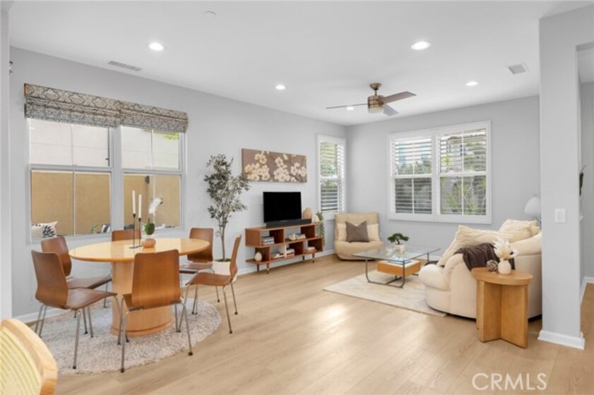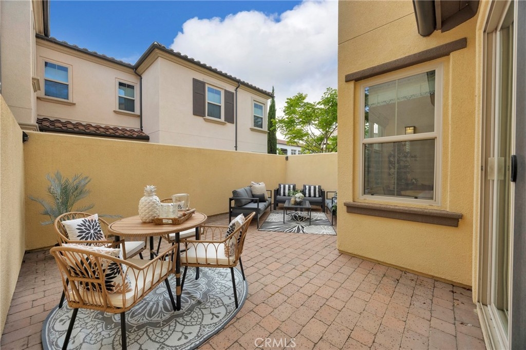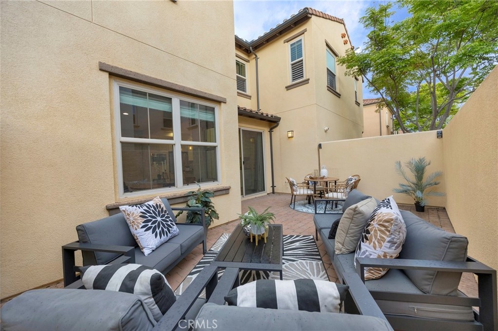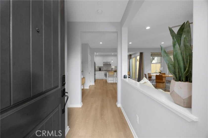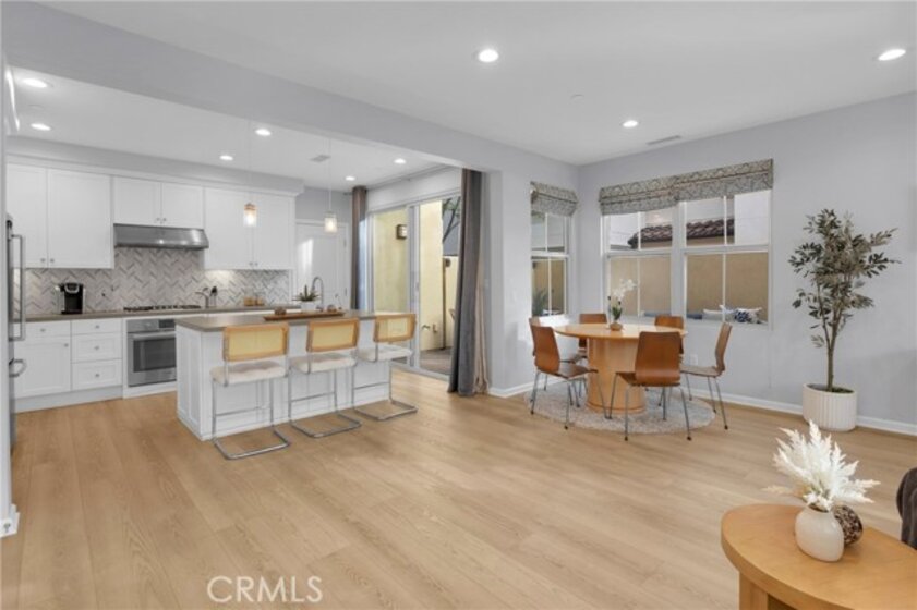 Corner, turnkey home in Portola Springs with an oversized private courtyard and one of the largest and most desirable floor plans in the community. Built in 2016, this 3-bedroom, 3.5-bath home includes a versatile upstairs loft and offers 1,778 sq ft of bright, open living space filled with natural light. The main level features vinyl flooring throughout, a spacious kitchen with a center island, quartz countertops, white shaker cabinetry, upgraded tile backsplash, stainless steel appliances, and seamless flow into the dining and living areas—ideal for everyday living and entertaining. Additional highlights include designer paint, custom window coverings, pendant lighting, recessed lighting throughout, and added insulation for enhanced comfort. Sliding doors from the kitchen create an easy indoor-outdoor connection to the oversized private courtyard, and a tucked-away half bath adds convenience on the first floor. Upstairs includes generously sized bedrooms, each with its own bathroom, along with the loft and an upstairs laundry room. The primary suite features a dual sink vanity, soaking tub, separate shower, and a walk-in closet. Positioned with only one attached wall, the home offers added privacy and abundant natural light throughout. Includes a 2-car attached garage with direct access. Located near top-rated Irvine schools, parks, pools, and Woodbury Town Center.