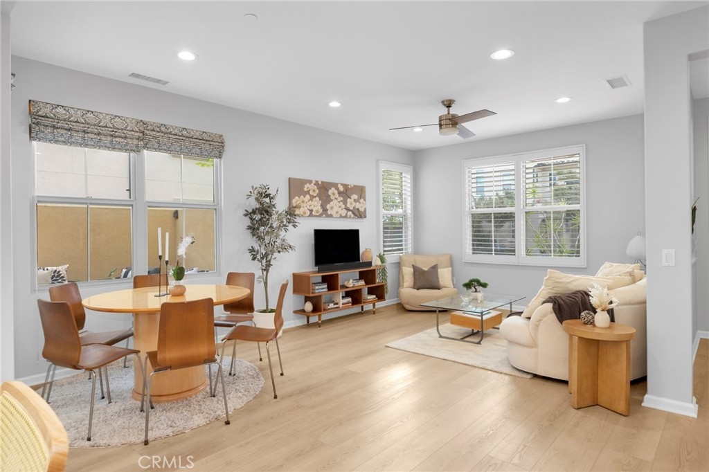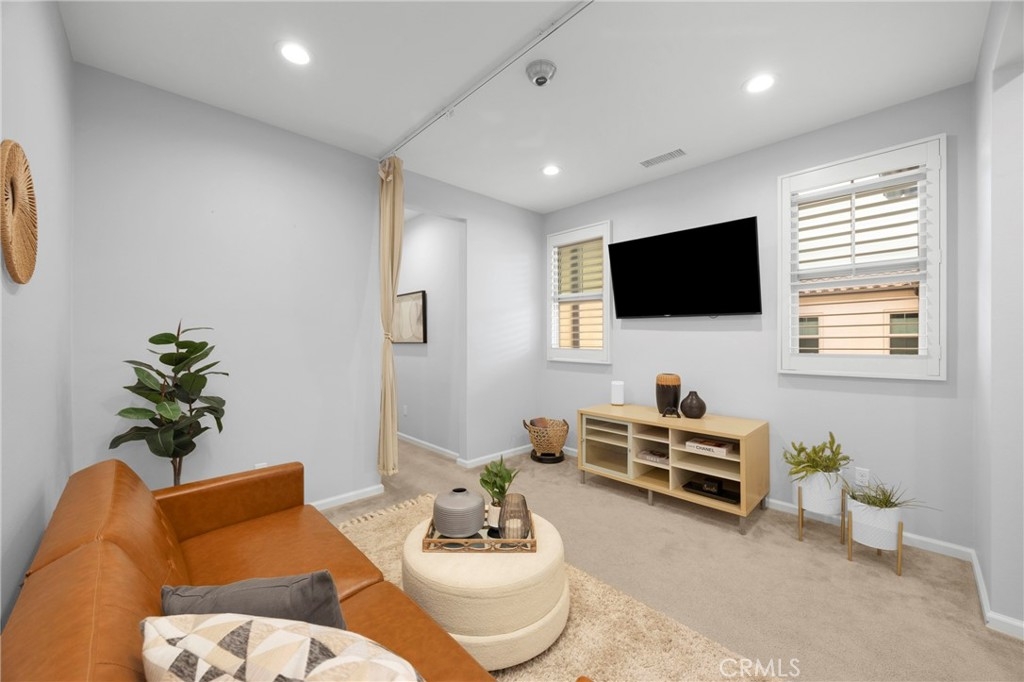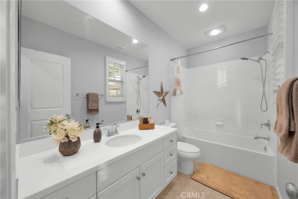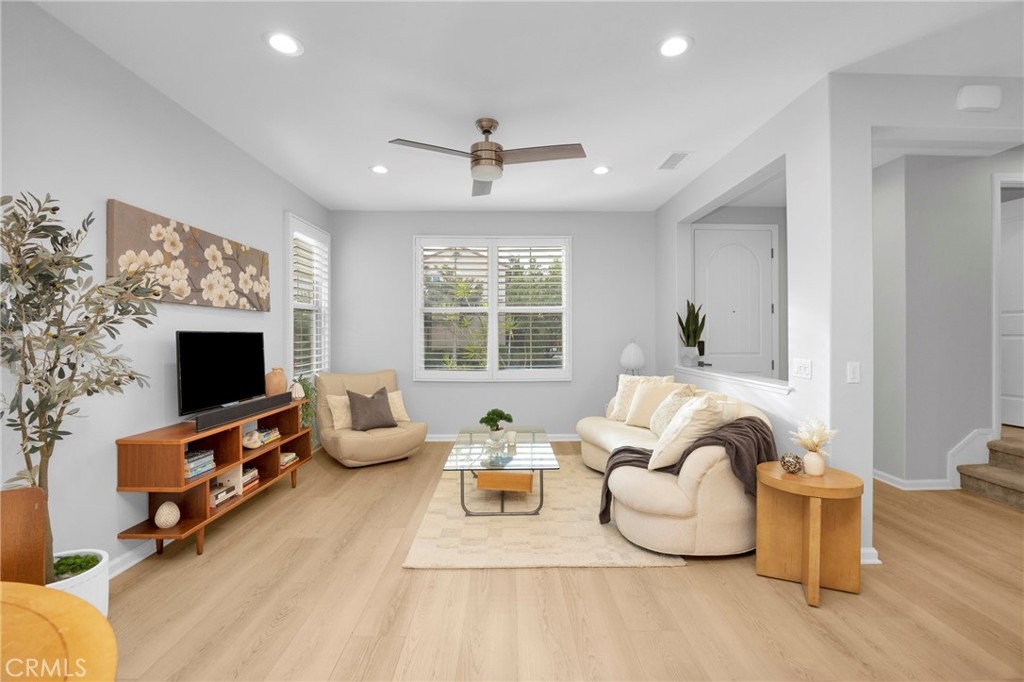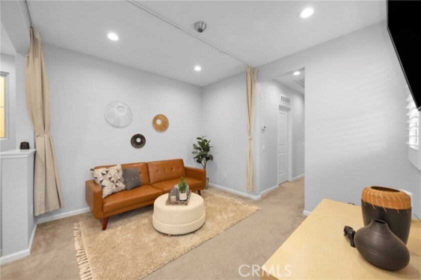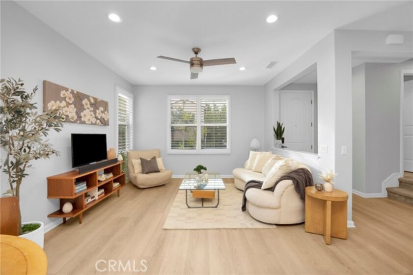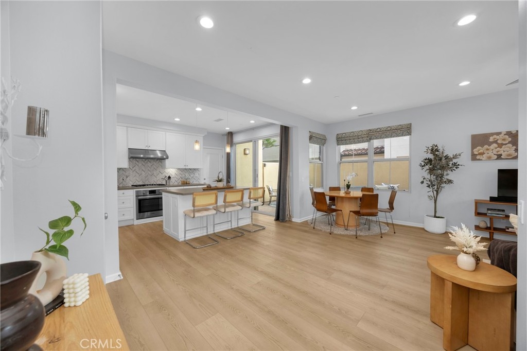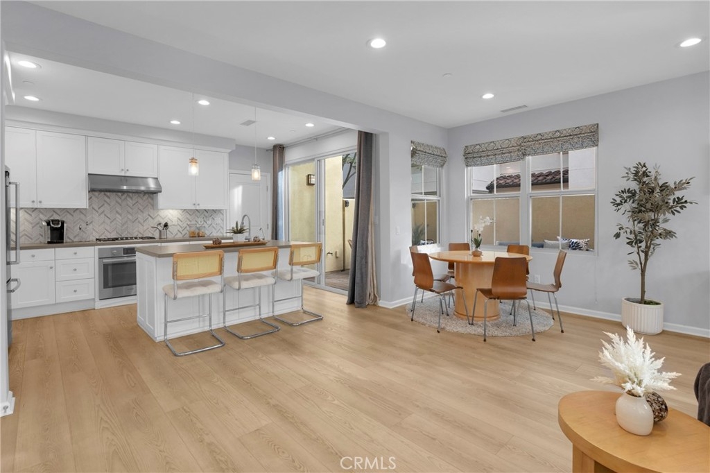 Corner, turnkey home in Portola Springs with an oversized private courtyard and one of the largest and most desirable floor plans in the community. Built in 2016, this 3-bedroom, 3.5-bath home includes a versatile upstairs loft and offers 1,778 sq ft of bright, open living space filled with natural light. The main level features vinyl flooring throughout, a spacious kitchen with a center island, quartz countertops, white shaker cabinetry, upgraded tile backsplash, stainless steel appliances, and seamless flow into the dining and living areas—ideal for everyday living and entertaining. Additional highlights include designer paint, custom window coverings, pendant lighting, recessed lighting throughout, and added insulation for enhanced comfort. Sliding doors from the kitchen create an easy indoor-outdoor connection to the oversized private courtyard, and a tucked-away half bath adds convenience on the first floor. Upstairs includes generously sized bedrooms, each with its own bathroom, along with the loft and an upstairs laundry room. The primary suite features a dual sink vanity, soaking tub, separate shower, and a walk-in closet. Positioned with only one attached wall, the home offers added privacy and abundant natural light throughout. Includes a 2-car attached garage with direct access. Located near top-rated Irvine schools, parks, pools, and Woodbury Town Center.