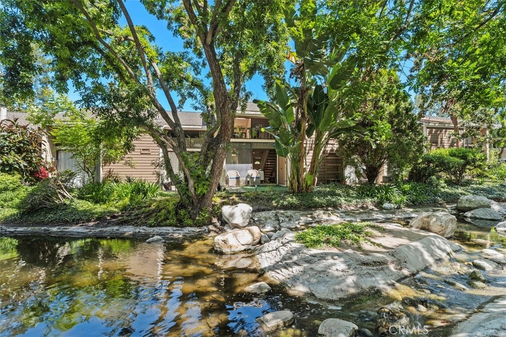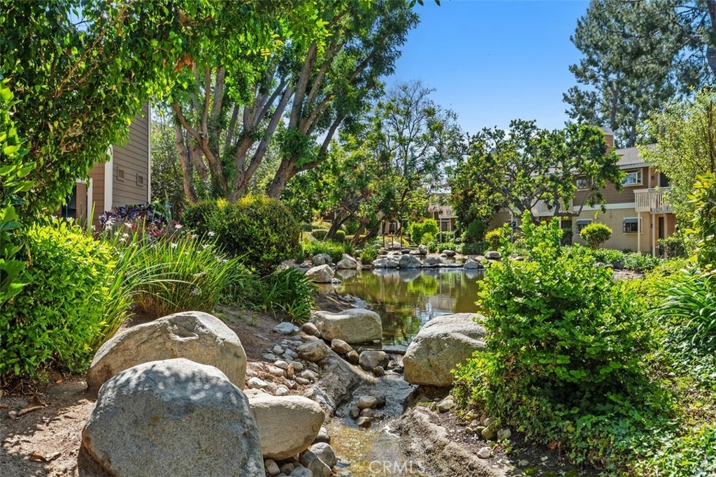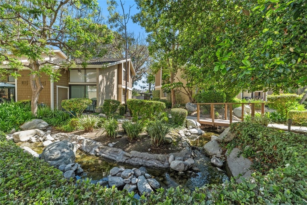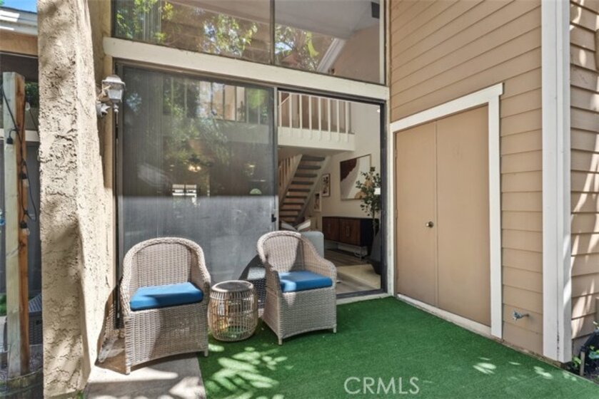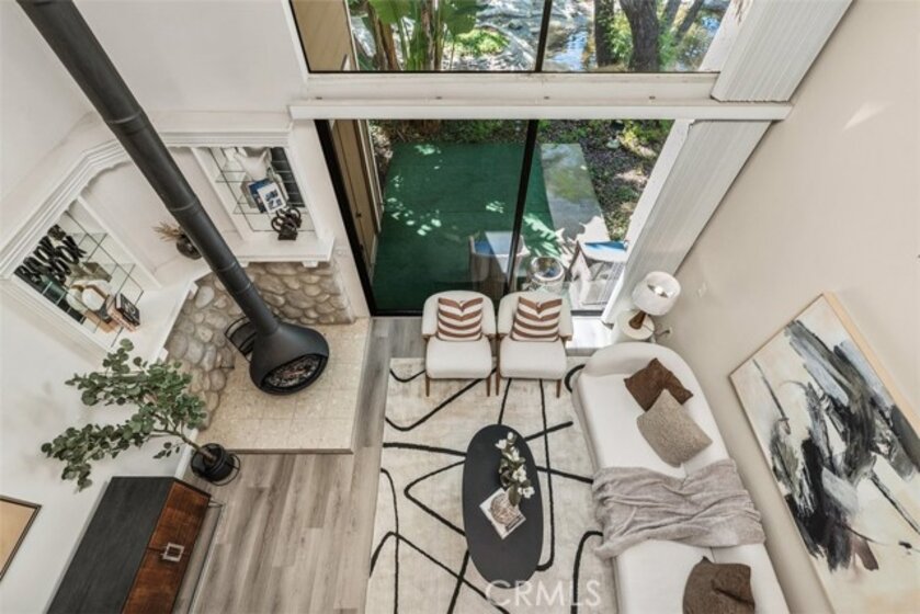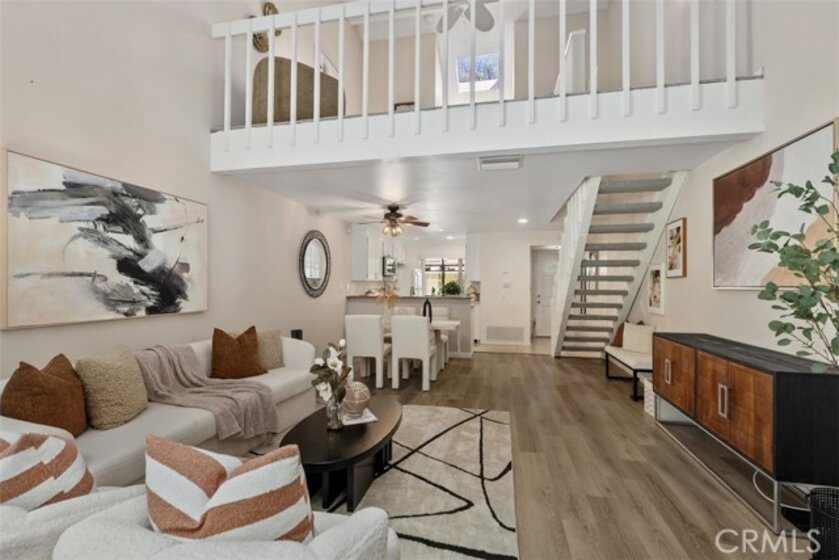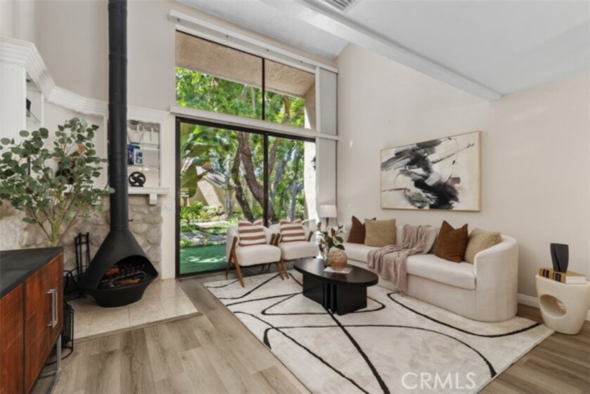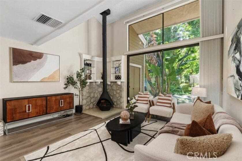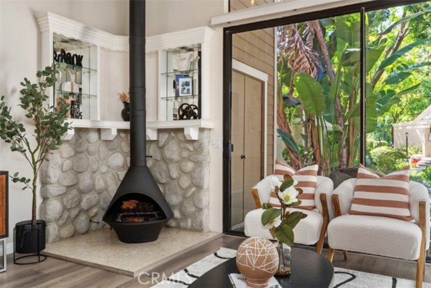 This turnkey loft-style home is a rare opportunity, featuring no neighbors above or below, a highly sought-after layout that offers exceptional privacy and comfort. Upon entering the front door, you’re welcomed into an open-concept living space filled with natural light, enhanced by soaring ceilings and large windows. The wood-burning fireplace in the living room creates a warm and inviting atmosphere. Upgrades include vinyl flooring and new carpet on the stairs and upstairs bedroom in 2023, adding a fresh and modern feel throughout. Additional features include recessed lighting, stone countertops, central A/C and heat, and an included washer and dryer conveniently located in a closet just off the patio. Upstairs, the spacious loft-style bedroom offers a generous walk-in closet, vanity area, and a shower-tub combination. Step outside to your private patio, where you can relax and enjoy peaceful views of lush greenery and tranquil streams, bringing a natural backdrop to everyday living. Located within an award-winning school district and just minutes from shopping, dining, Tustin Marketplace, and Irvine Spectrum, this home offers both convenience and lifestyle.The community features resort-style amenities including pools, tennis courts, and scenic streams throughout, with HOA dues covering water and trash for added ease. A rare blend of privacy, comfort, and convenience, this home truly speaks for itself.