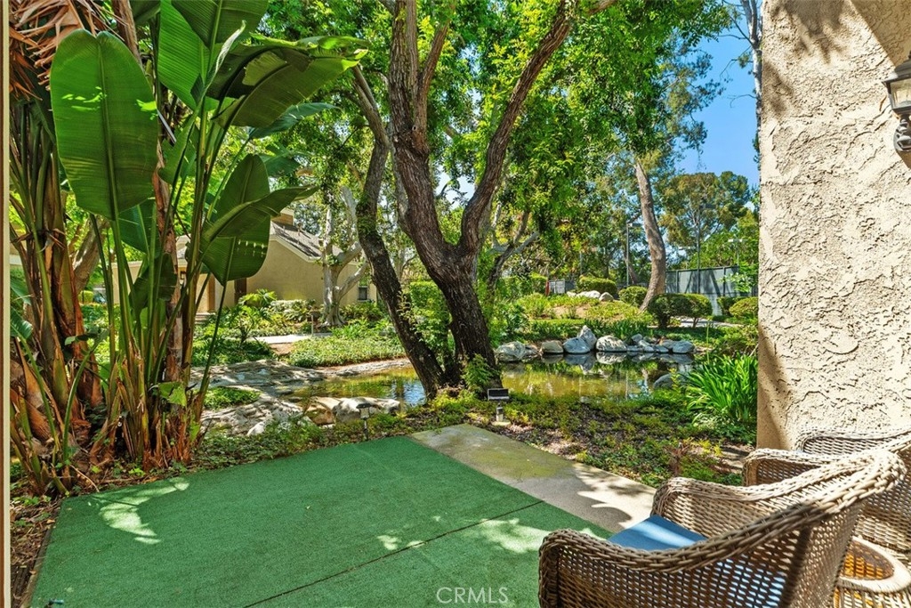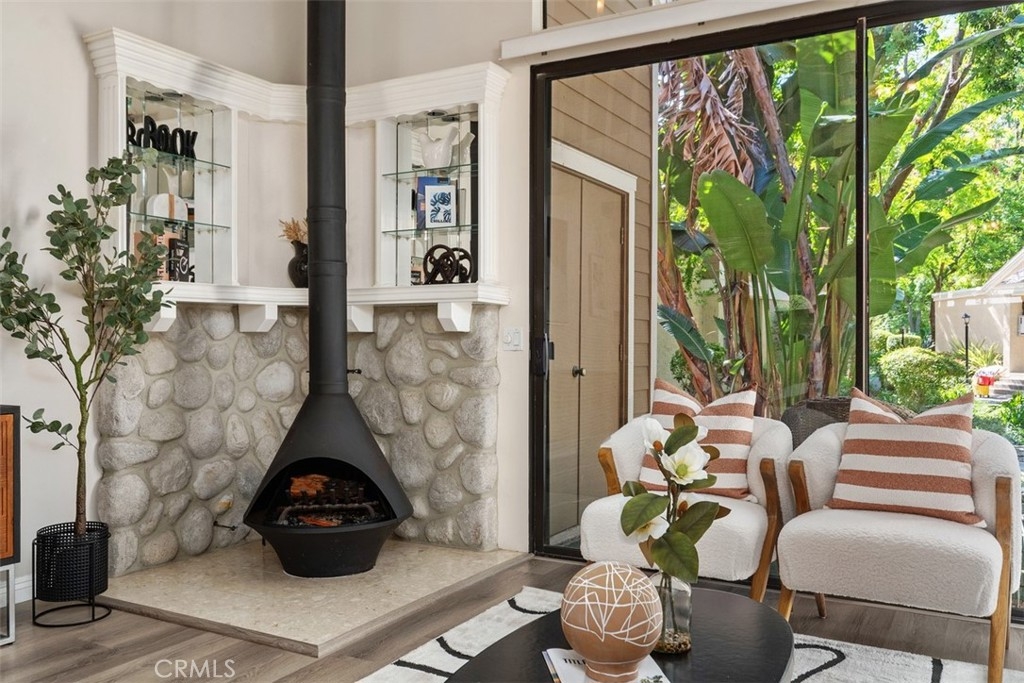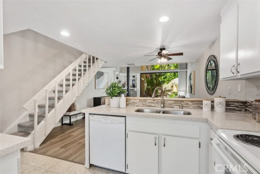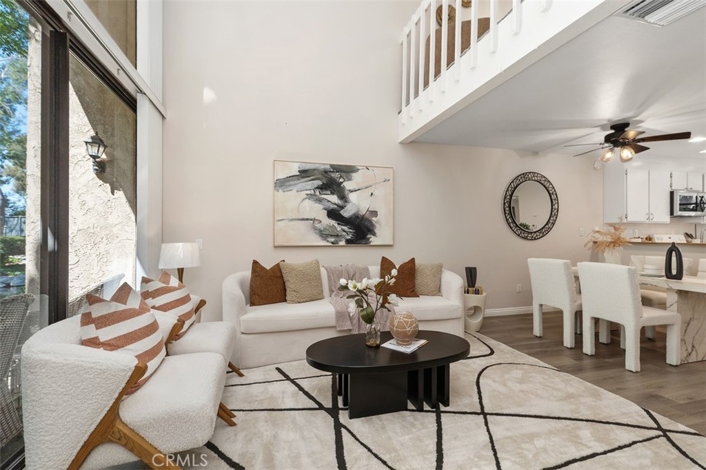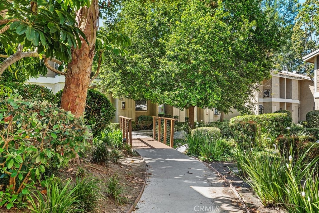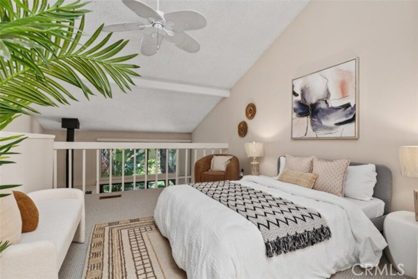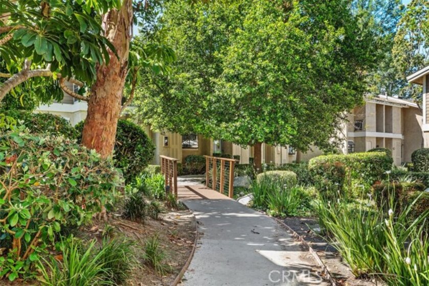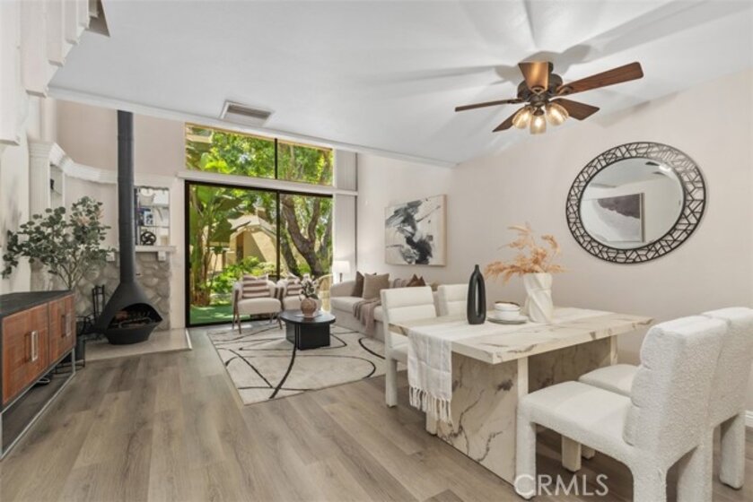 This turnkey loft-style home is a rare opportunity, featuring no neighbors above or below, a highly sought-after layout that offers exceptional privacy and comfort. Upon entering the front door, you’re welcomed into an open-concept living space filled with natural light, enhanced by soaring ceilings and large windows. The wood-burning fireplace in the living room creates a warm and inviting atmosphere. Upgrades include vinyl flooring and new carpet on the stairs and upstairs bedroom in 2023, adding a fresh and modern feel throughout. Additional features include recessed lighting, stone countertops, central A/C and heat, and an included washer and dryer conveniently located in a closet just off the patio. Upstairs, the spacious loft-style bedroom offers a generous walk-in closet, vanity area, and a shower-tub combination. Step outside to your private patio, where you can relax and enjoy peaceful views of lush greenery and tranquil streams, bringing a natural backdrop to everyday living. Located within an award-winning school district and just minutes from shopping, dining, Tustin Marketplace, and Irvine Spectrum, this home offers both convenience and lifestyle.The community features resort-style amenities including pools, tennis courts, and scenic streams throughout, with HOA dues covering water and trash for added ease. A rare blend of privacy, comfort, and convenience, this home truly speaks for itself.