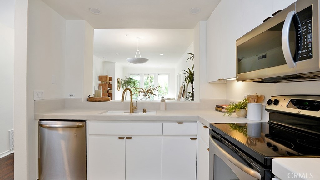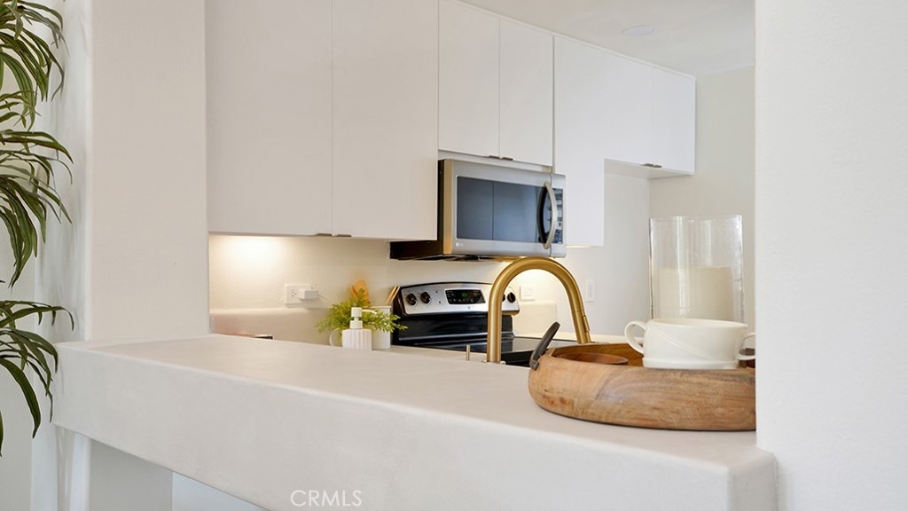 Welcome to your fully reimagined 2-bedroom, 1-bath sanctuary at 2233 Martin #216, nestled within the prestigious, guard-gated Metropolitan community in Irvine. This move-in-ready gem blends modern sophistication with thoughtful design, offering a seamless flow from the moment you step onto the solid hardwood flooring illuminated by new LED recessed lighting throughout. The open floor plan centers around a stunning kitchen, featuring sleek plaster countertops, a designer sink fixture, and fresh cabinet doors with premium hardware. Equipped with a full suite of appliances—including a range, dishwasher, over-the-range microwave, and convenient in-unit laundry—this space is as functional as it is beautiful. Natural light pours in through dual-pane windows and a sliding glass door that opens to your private back patio, perfect for morning coffee or evening relaxation. The versatile second bedroom has been thoughtfully converted into a flexible space—ideal as a home office, guest room, or creative studio. Primary suite includes private patio door access, designer light fixtures and updated closet doors, poles, and brackets for effortless organization. Indulge in the spa-like master bathroom, complete with a plaster countertop vanity, designer light fixtures, and faucets. Unwind in the oversized soaking tub or enjoy the standalone shower enclosed by elegant privacy glass. Every detail has been refined: new modern matte black door hardware and a smart thermostat for ultimate comfort and efficiency. Located on the second floor with direct elevator access, enjoy effortless entry—no stairs required. Plus, enjoy the convenience of two side-by-side parking spots in the secure lower garage. Ideally positioned just minutes from John Wayne Airport, this home is a commuter’s and frequent flyer’s dream—effortless access to freeways, business hubs, and global travel. Live the resort-inspired lifestyle at The Metropolitan with 24/7 guard-gated security, a sparkling pool and spa, state-of-the-art fitness center, lush courtyards, and scenic walking paths—all enveloped in Irvine’s top-tier safety and award-winning schools. Don’t miss this rare opportunity to own a turnkey retreat in one of Irvine’s most coveted enclaves—schedule your private tour today!