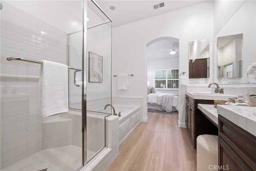 Welcome to 23 Herringbone, an incredibly rare single-level residence in the prestigious La Casella enclave of Woodbury, where elegance meets convenience and privacy meets community. This beautifully designed home features soaring ceilings, an open-concept layout, and a bright, free-flowing floor plan perfect for both entertaining and everyday living. The chef-inspired kitchen seamlessly connects to the dining and living areas, while each of the two main bedrooms has its own ensuite bathroom for added comfort and privacy. The primary suite impresses with high ceilings, a spacious walk-in closet, and a spa-style bathroom. Step outside to the inviting courtyard with a cozy fireplace, ideal for morning coffee or evening relaxation. A detached third-bedroom suite with its own mini-split system and private bathroom offers endless possibilities as a guest suite, office, gym, or rental unit. With brand-new luxury vinyl plank flooring, fresh paint, and a move-in-ready condition, this home blends timeless appeal with modern updates. Set in a quiet community just steps from Woodbury Town Center—home to Trader Joe’s, Starbucks, Ralph’s, LA Fitness, and more—and within walking distance to Woodbury’s resort-style amenities, including pools, parks, and sports courts, this is a rare opportunity to own a true single-story gem in one of Irvine’s most sought-after neighborhoods.