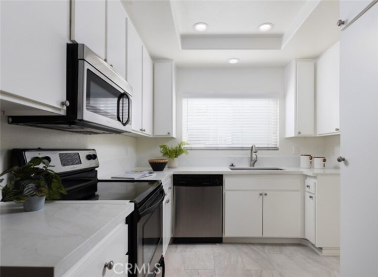 Beautifully updated single-story residence located in the desirable Northwood Horizon community of Irvine. This two-bedroom, two-bath floor plan features a spacious front patio entry and a well-designed split-bedroom layout. The home has been thoughtfully upgraded with newer laminate flooring, updated vinyl windows, fresh interior paint, modern light fixtures, refreshed bathrooms, and an updated kitchen complete with crisp white cabinetry, an oversized stainless-steel sink, and stunning stone countertops, making this home truly move-in ready. The generous great room with a separate dining area creates an ideal space for both relaxing and entertaining. Situated in an interior end-unit location, the home offers direct access to the outdoor patio from the primary bedroom. Additional conveniences include a dedicated parking space in the shared detached garage. Just steps from beautiful Orchard Park and close to award-winning schools, including Northwood High School. With easy access to the 5 freeway, toll roads, shopping, dining, and entertainment, along with the benefit of low HOA dues and no Mello Roos, this is a fantastic opportunity to own in one of Irvine’s most sought-after neighborhoods.