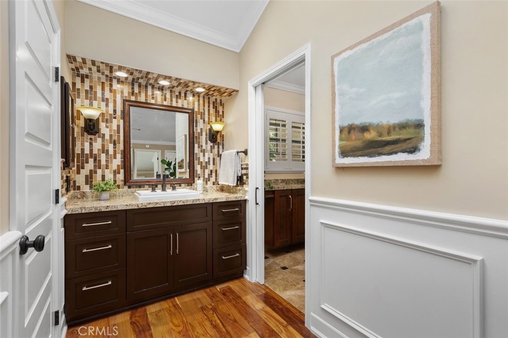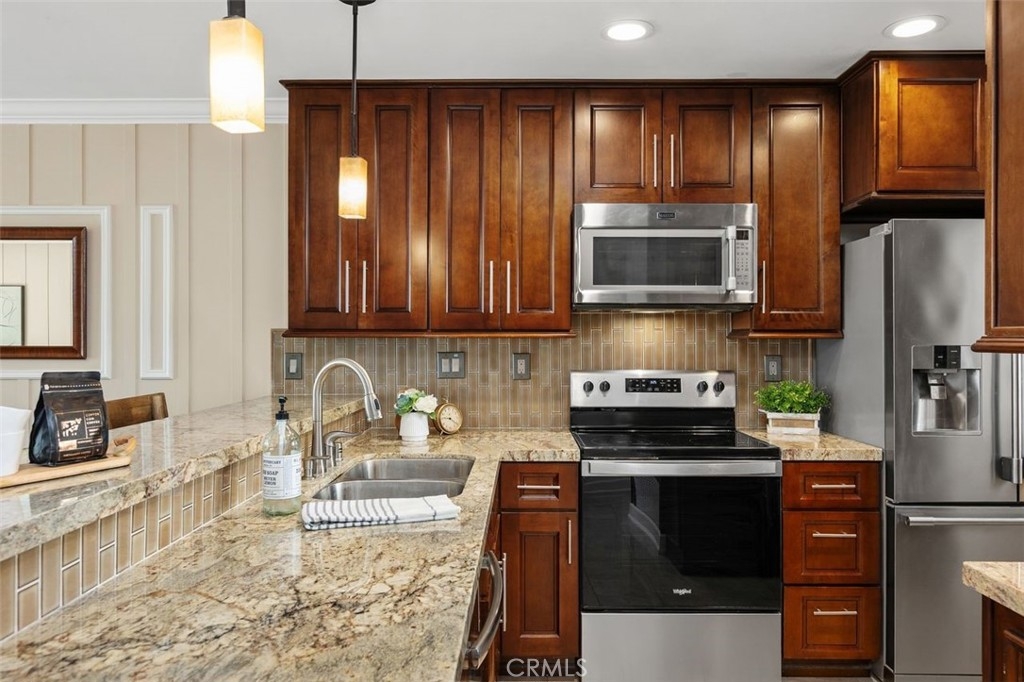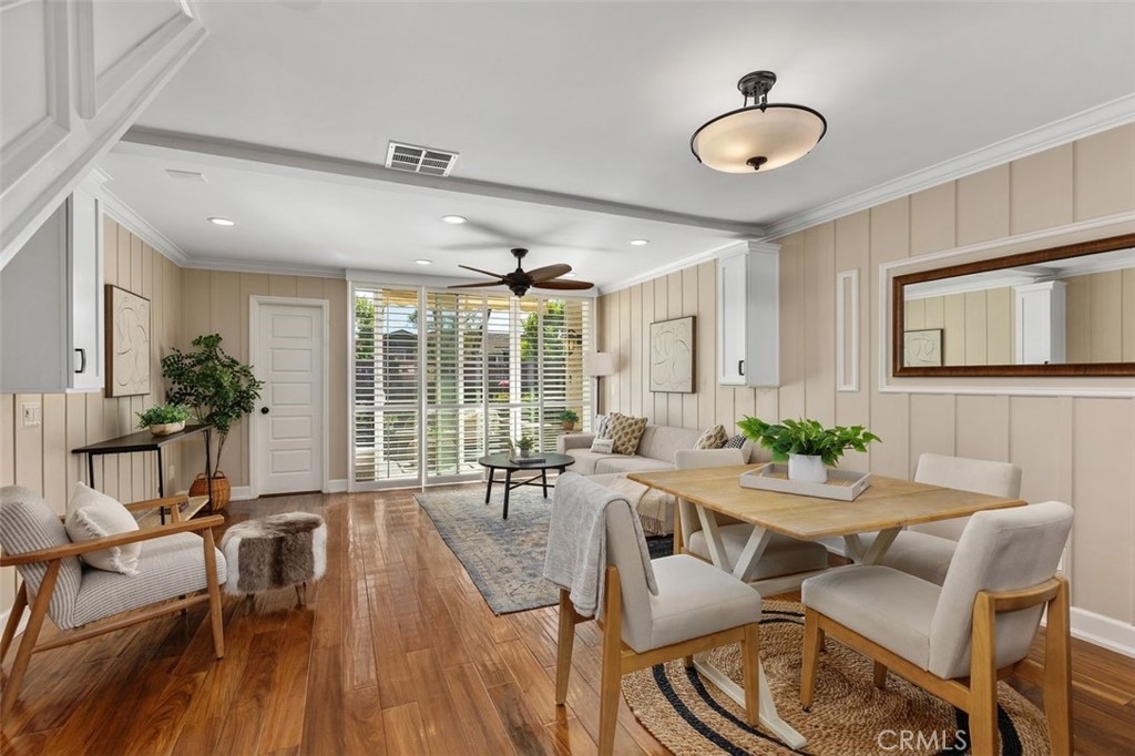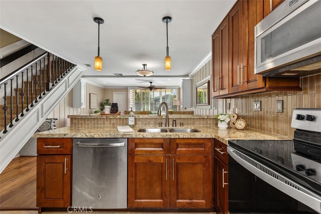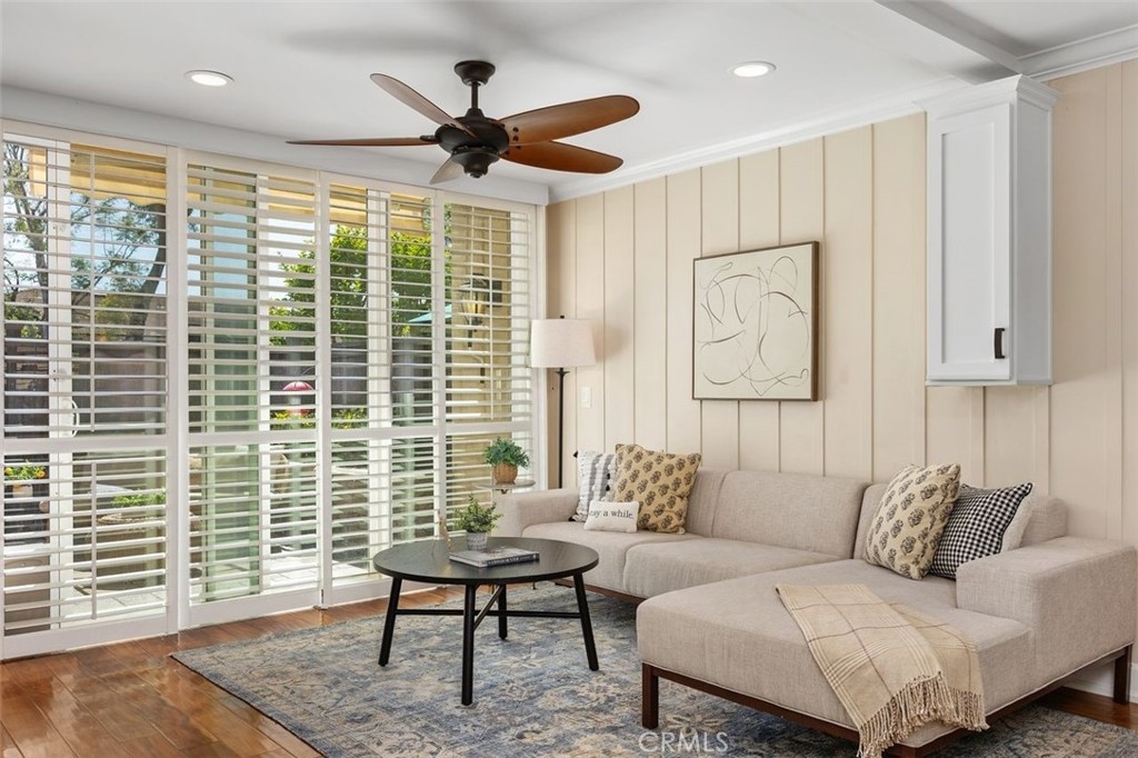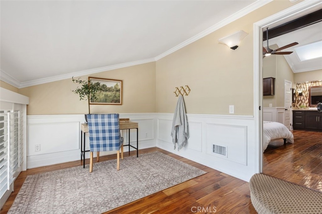 Nicely upgraded 1 bedroom plus office townhome in The Lakes community of Irvine. This 1 bedroom, 1.5 bath home offers a rare upstairs office, private fenced patio, and more than $75,000 in improvements. The remodeled kitchen features granite countertops, stainless steel appliances, updated wood cabinetry, extra storage, floor-to-ceiling pantry space, breakfast bar, pendant lighting, and full porcelain tile backsplash. The main living areas offer hardwood floors, recessed lighting, smooth ceilings, plantation shutters, custom wainscoting, crown molding, paneled doors, and a boxed staircase with wrought iron railing. Ceiling fans upstairs and downstairs add comfort. Upstairs, the vaulted primary suite includes a skylight, walk-in closet with organizer, built-in wall cabinetry, and a remodeled bathroom with granite counters, updated vanity with a modern vessel sink, stacked-stone backsplash, framed mirror, and custom walk-in shower. The separate office adds valuable flex space for work, guests, hobbies, or storage. The private fenced patio, one of only 30 in the community, offers paver hardscape, raised stone planter, mature landscaping, retractable awning, built-in BBQ counter, and permanent gas hookup. Additional features include updated HVAC, partial dual-pane windows, GE stackable laundry, smart thermostat, and designer two-tone paint. The Lakes is known for its streams, mature trees, and scenic surroundings, with community amenities that include pools, spas, tennis courts, and HOA dues that include water and trash service. Conveniently located near shopping, dining, trails, and freeway access. No Mello-Roos and low tax rate.