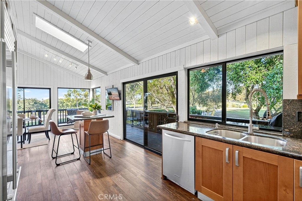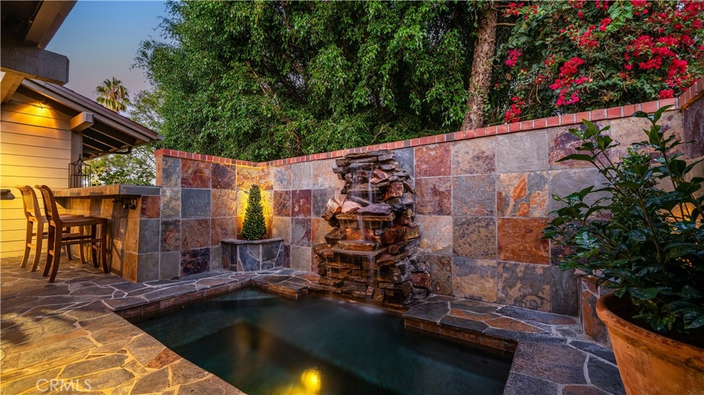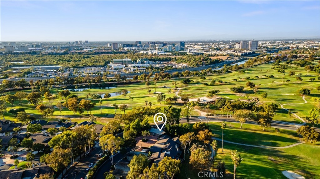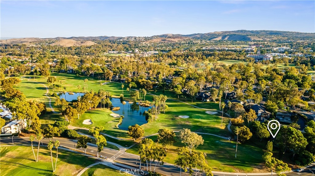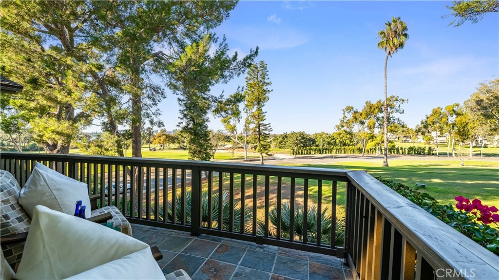 On a premium corner lot at the end of a quiet cul-de-sac, this beautifully remodeled home offers panoramic views of the golf course, ponds, city skyline, and sunsets, including a direct overlook of the 13th-hole tee-box. Step through the front gate into a tranquil, private courtyard with warm lighting, featuring a custom heated spa, a rock waterfall, and a bar-height counter overlooking lush greenery—ideal for entertaining or unwinding. Inside, the open floor plan boasts cathedral ceilings, dual-pane windows, and abundant natural light. The living room opens to the dining area, while the remodeled gourmet kitchen—with top-of-the-line stainless steel appliances, granite counters, custom cabinetry and recessed lighting—flows seamlessly into the dining area. Sliding glass doors in both the dining room and kitchen lead to a wrap-around deck extending around the back and side of the home, perfect for indoor-outdoor living. The primary bedroom features a sliding glass door to the back patio with golf course views. It includes a spacious ensuite bathroom with a vanity area, a separate shower room, and a privacy door to the toilet, along with a cozy sitting area and mirrored closets. All bedrooms and bathrooms have recessed lighting, and each bathroom has been beautifully remodeled. Additional highlights include custom cabinetry around the stairs, a remodeled fireplace, and finished storage areas. Recent upgrades feature a new roof and tenting completed in Summer 2023, with the HOA special assessment fully paid. Conveniences include a direct-access two-car garage and an indoor laundry area. Residents enjoy access to two community pools and spas, with association dues covering water, trash, and exterior maintenance. Ideally located in the esteemed Irvine School District, including University High, and just minutes from UCI, William Mason Park, John Wayne Airport, Newport Beach, and Fashion Island. This home offers refined, move-in-ready living with spectacular golf course views and timeless appeal.