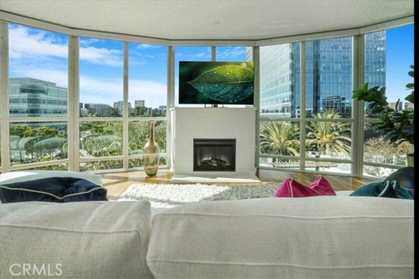 Modern Elegance - Discover the epitome of luxury living in this alluring floor to ceiling residence nestled in one of Orange County's most prestigious high-rises, Marquee Park Place. Located on the 5th floor, this unit has undergone beautiful upgrades including a sleek modern flushed quartz countertop & backsplash effortlessly blending an open-concept layout with modern sophistication inviting comfort. Panoramic views throughout massive curved windows and a floating white quartz fireplace view of abundant city lights, sunsets and manicured gardens below lend a beautiful backdrop to this serene one story residence when entertaining guests or enjoying the evening view. Featuring a versatile and innovative custom-designed Murphy bed that seamlessly transforms into a functional desk. This dual-purpose furniture piece is ideal for maximizing utility without sacrificing style. Embellish luxury high-rise living in a rare highly desirable end unit offering a circular floor-plan boasting two bedrooms, two baths, balcony, open gourmet kitchen with European styled cabinetry, reimagined quartz breakfast bar, elegant wine cooler, stainless steel appliances, brand-new refrigerator, solid hardwood floors and in-unit washer/dryer. 24-hour guard-gated community with concierge service, residents have access to top-notch amenities, including a pool, spa, gym, billiards room, and lounge. Perfectly positioned, just minutes from Fashion Island, South Coast Plaza, and a host of fine dining options at Park Place. In- addition this location offers unbeatable freeway access. The HOA covers water, trash, gas, and internet, with no Mello Roos fees. This is luxury redefined—schedule your tour today!