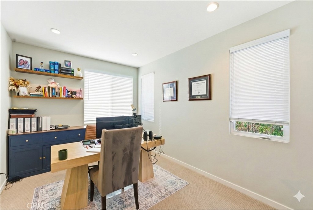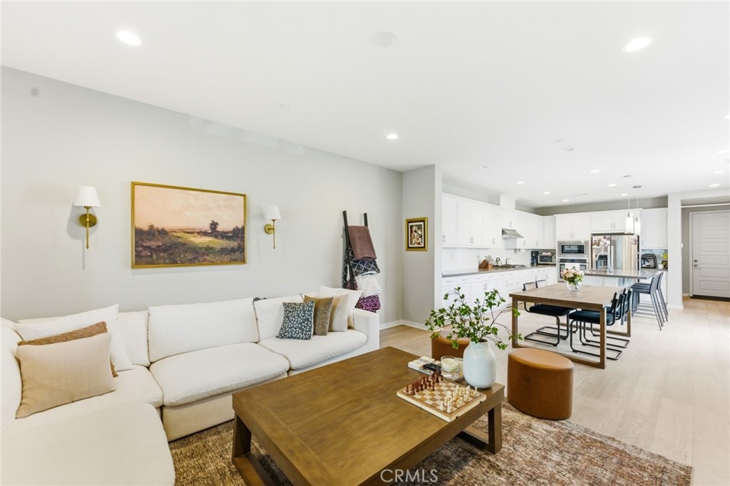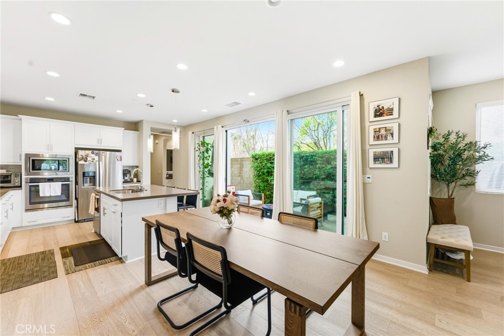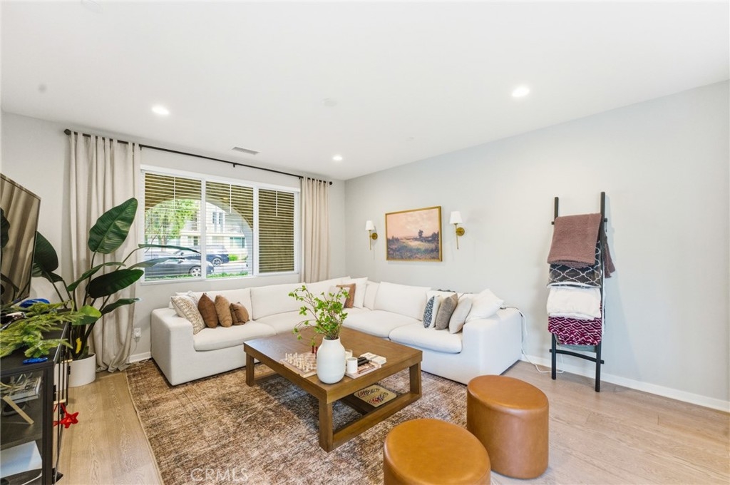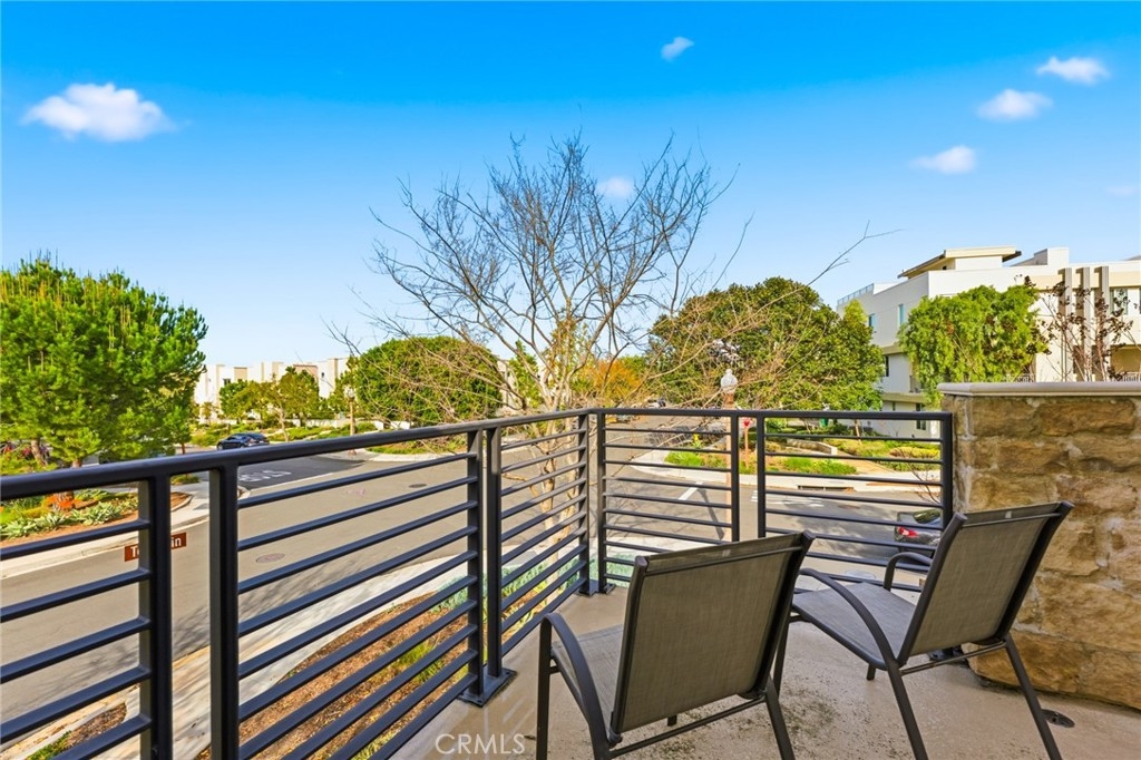 A rare-unit opportunity with true indoor–outdoor living in the heart of Parasol Park. Set on a quiet, tree-lined street, this well-kept home offers privacy, natural light, and a layout that truly works. With only one shared wall situated on a desirable corner lot, the home feels open without sacrificing comfort. The main level features an open floor plan with hardwood floors, recessed lighting throughout, and multiple upgrades. The kitchen is clean and modern with white cabinetry, quartz countertops, stainless steel appliances, and a large island ideal for everyday living or entertaining. A wide dual-panel sliding glass door system, where both doors slide open in an accordion style, creates an expansive opening to the patio and delivers a true indoor–outdoor living experience. Upstairs, the primary suite is bright, spacious, and comfortable, with a well-appointed bath, dual vanities, and a wrap-around balcony with open views, perfect for morning coffee or winding down in the evening. Down the hall you will find two secondary bedrooms that are nicely sized and flexible for guests, an office, or additional living space. Laundry is conveniently located upstairs, along with ample storage. The corner setting adds curb appeal and a sense of privacy, with landscaped walkways and a front porch that acts as a welcoming entry. The home has been thoughtfully maintained and is move-in ready. Enjoy walking or biking access to pools, parks, playgrounds, sports courts, clubhouse amenities, and highly regarded Irvine schools, all within the Great Park community. Welcome home!