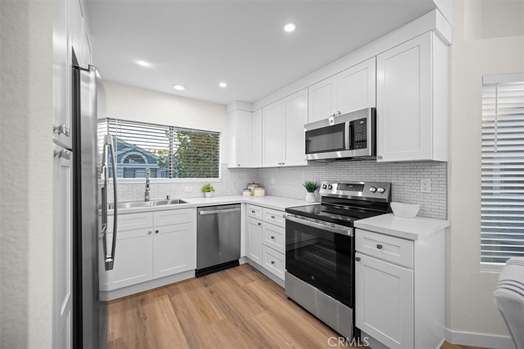Beautifully Renovated End Unit in Prime Location! This light-filled, end-unit home has been completely and thoughtfully remodeled within the last 30 days. The stunning new kitchen boasts classic white quartz countertops, a stylish tile backsplash, white shaker soft-close cabinets and drawers, and a full suite of brand-new stainless steel appliances. The bathrooms have been fully updated with new vanities, modern showers, elegant mirrors, and upgraded hardware. Luxury vinyl plank flooring and new baseboards flow throughout the home, complemented by all-new lighting fixtures and door hardware that add to the bright, airy atmosphere. The spacious primary bedroom features a walk-in closet with built-in organizers and direct access to a private deck through a large glass slider. Additional highlights include a one-car detached garage and ample guest parking. NO MELLO ROOS. Perfectly located in the desirable Northwood Horizons community, you can enjoy access to two heated pools and spas, as well as a barbecue and picnic area with open green grass areas for play and picnics. Ideally situated near Orchard Park, Heritage Park, top-rated Irvine schools, and premier shopping dining and entertainment at popular Irvine Spectrum, The Marketplace, and The District. Super easy access to the 5 freeway and toll roads, this home truly offers the best of Irvine living!