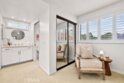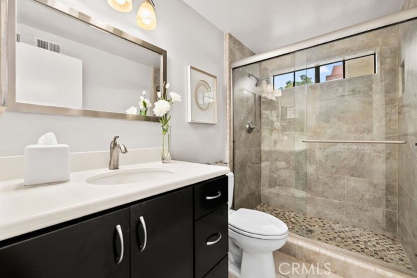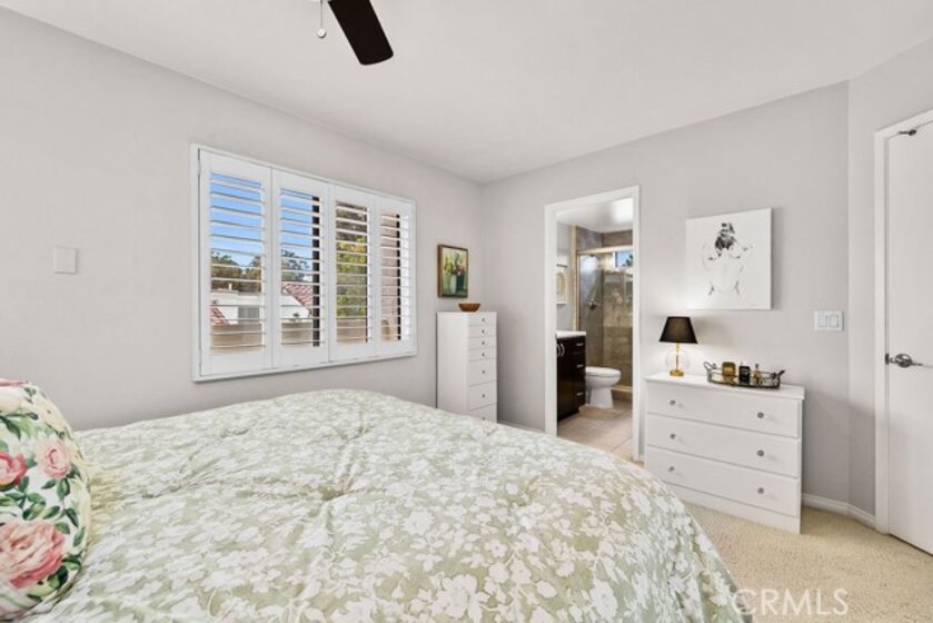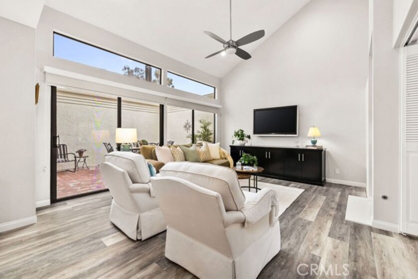 Welcome to a beautifully reimagined townhome tucked within the highly sought-after Rancho San Joaquin Villas community in Irvine. Available for the first time in 40 years, this meticulously maintained home features thoughtful updates and finishes blending timeless comfort with modern refinement. Guests will enjoy the meandering path surrounded by lush landscaping that guides them to the charming front patio garden, accented with impatiens, a bird bath, and a beautiful Redbud tree. Views of the nearby beautiful trees can be experienced from all windows adding to the serenity that can be enjoyed living here. The layout offers two expansive upstairs bedroom suites, each with its own private bath. A flexible main-level bedroom or executive office opens through sliding glass doors to a serene front patio garden—perfect for a quiet workspace or guest retreat. The main living areas are light-filled and emphasize quality, blending comfort with refined aesthetics to create a serene, intentional environment. The fully remodeled kitchen features crisp white shaker cabinetry, quartz countertops with Carrara marble subway tile backsplash and stainless steel appliances. The kitchen flows effortlessly to the interior courtyard, enhancing the home’s signature California indoor-outdoor lifestyle. A separate dining room connects to the spacious living room, where sliding glass doors open to the courtyard, complemented by clerestory windows and a soaring ceiling that bathe the space in natural light throughout the day. The primary suite offers a true private retreat, introduced by double-door entry and featuring dual closets, and a bathroom including a raised vanity with quartz countertop, Toto toilet and a tub/shower combination. The second en-suite is generous in size and boasts a remodeled bathroom with a luxurious shower, raised vanity and Toto toilet. Additional features include a living room fireplace with quartz surrounds, direct-access garage entry, a main-level laundry room and a powder room. Newly installed deluxe Shaw luxury vinyl plank flooring enhances the main living spaces, while Sunburst Plywood shutters accent each bedroom. Additional improvements include LED recessed lighting, an updated HVAC system, ceiling fans and upgraded baseboards. Ideally located near shopping centers, the 405 freeway,Racquet Club of Irvine, golf courses, scenic parks, and Irvine’s top-rated schools, this home offers a rare combination of elevated design and premier location.