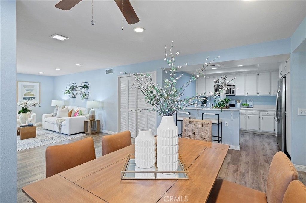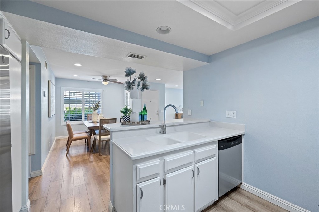 Welcome to 4 Woodleaf, a beautiful ground-level end unit in the heart of Irvine’s famous Woodbridge community. This charming Bristol model offers a bright and open layout with no stairs to climb, making it easy and comfortable to move through every room. This home is move-in ready and filled with upgrades that make life easier. You will love the fresh feel of the updated kitchen, which comes with smooth Corian countertops and a breakfast bar that is perfect for quick meals. Every room in the home features energy-saving recessed LED lighting, keeping the entire space bright and efficient. The interior looks clean and fresh thanks to Luxury Vinyl Plank (LVP) flooring in all living areas and bedrooms, with attractive tile floors in both bathrooms. Elegant plantation shutters are installed throughout every room for privacy and light control. The walls have also been refreshed with a clean coat of paint, and the ceilings have been finished for a smooth, clean look. Both bedrooms serve as private retreats with their own updated bathrooms, and the primary bathroom offers a convenient stand-up shower. You can rest easy knowing the most important parts of the home are taken care of. For added convenience, the home includes a large laundry room with space for a side-by-side washer and dryer along with extra storage space. You can also enjoy the fresh air on your private patio at the entry that features its own outdoor storage closet. Parking is a breeze with an oversized assigned carport that is large enough to fit a vehicle and a motorcycle or bike. Living here means joining one of the best neighborhoods in Southern California. As a resident, you get full access to the incredible amenities Woodbridge Community offers, including two large lakes with sandy beach lagoons and 22 community swimming pools. If you enjoy staying active, you will love the numerous tennis courts, pickleball courts, and miles of green walking paths right outside your door. The location is also perfect for families and commuters alike. This home sits within the award-winning Irvine Unified School District and is just a short walk or drive to the Woodbridge Village Center for easy shopping, dining, and movies. Opportunities like this in Woodbridge do not last long. Act quickly to see this beautiful home for yourself and take the first step toward making it your dream home!