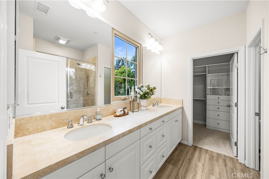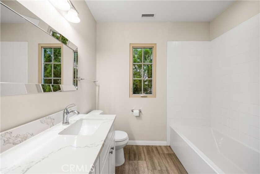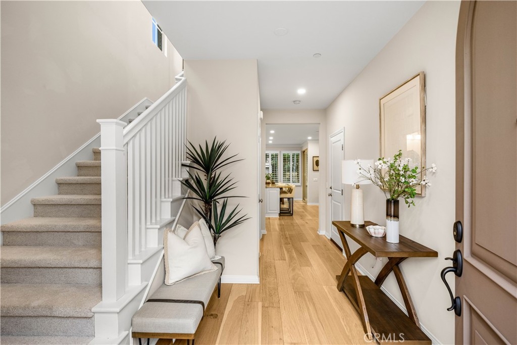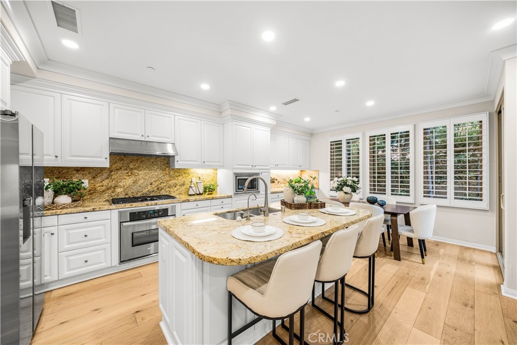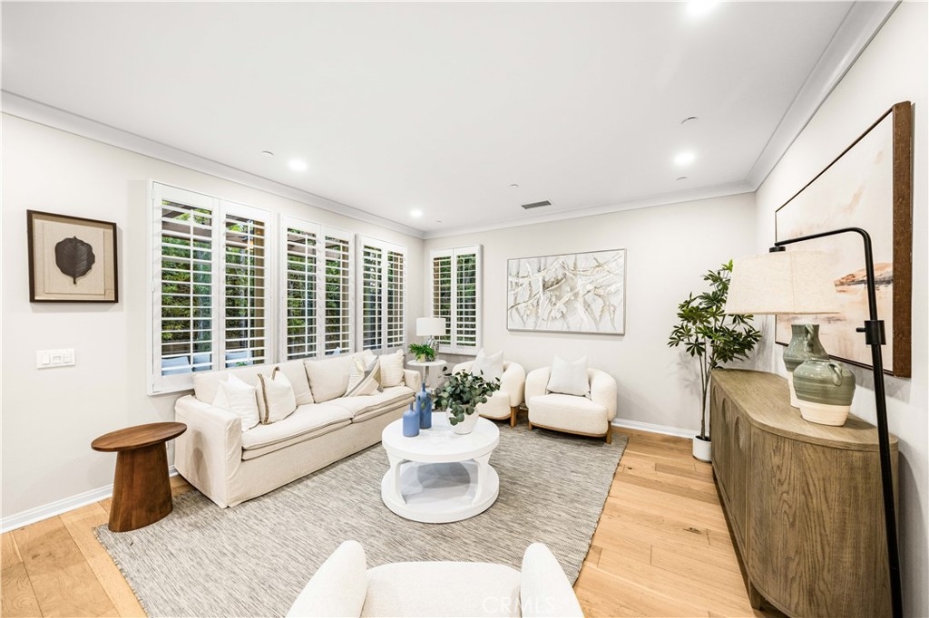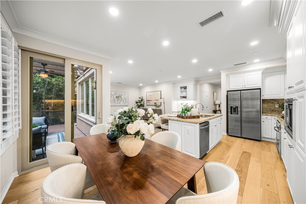 OPPORTUNITY KNOCKS! Welcome to the guard gated Village of Laguna Altura. This 3-bedroom, 2.5-bathroom home offers approximately 1,713 square feet of functional living space with a practical open-concept layout. Interior features include wood flooring on the main level, crown molding, recessed lighting, plantation shutters, custom interior paint, and fresh new carpet on the stairs and upper level. The main level features an open kitchen and dining area with granite countertops, a full backsplash, white cabinetry, stainless steel appliances, and a center island with bar seating. The private rear patio includes finished hardscape and mature landscaping, offering a low-maintenance outdoor space for everyday use or casual entertaining. Upstairs, the primary suite includes an en-suite bathroom with dual sinks, stone countertops, a separate shower, and a walk-in closet. Two additional bedrooms and a secondary bathroom complete the upper level. Residents of Laguna Altura enjoy community amenities including pools, spas, parks, basketball courts, playgrounds, and gathering areas, with convenient access to Irvine Spectrum Center, Quail Hill Shopping Center, major freeways, Laguna Beach, and the highly regarded Irvine Unified School District.