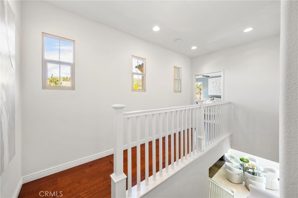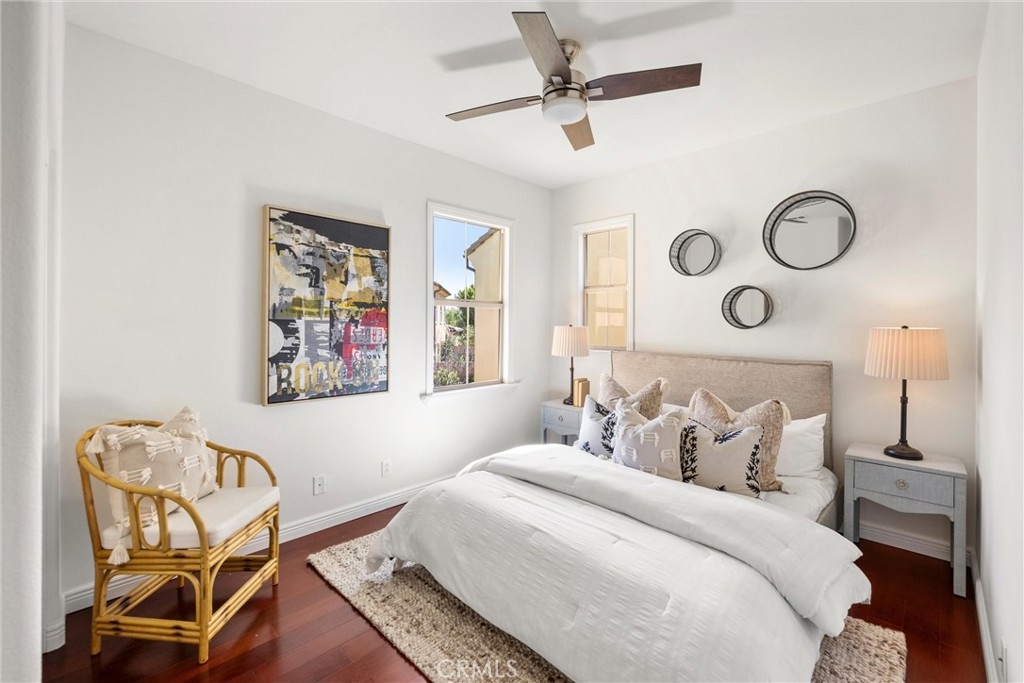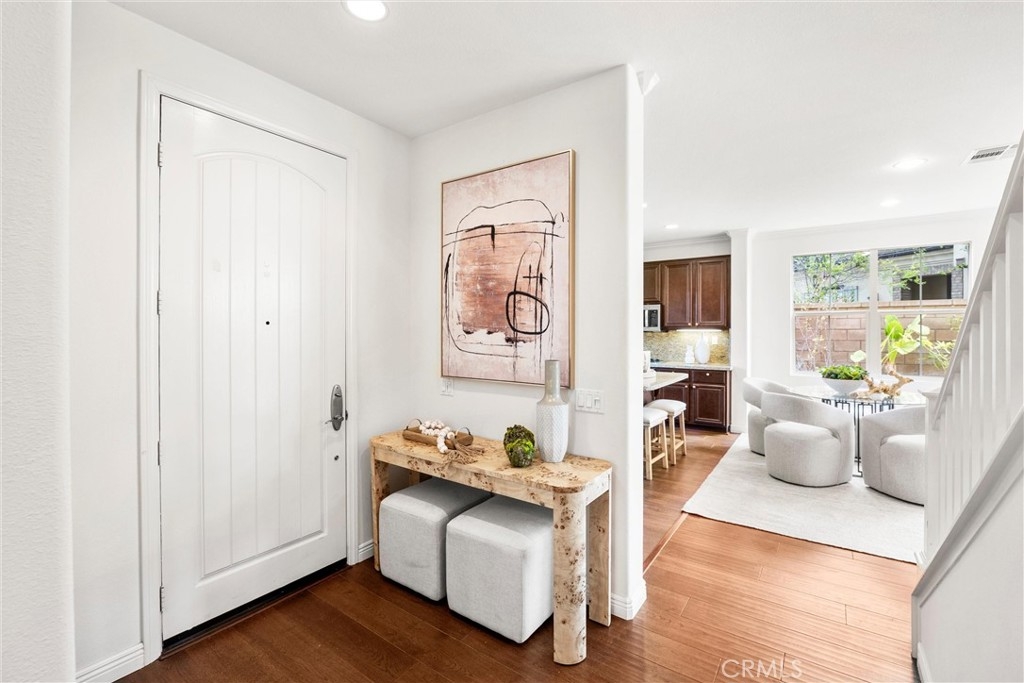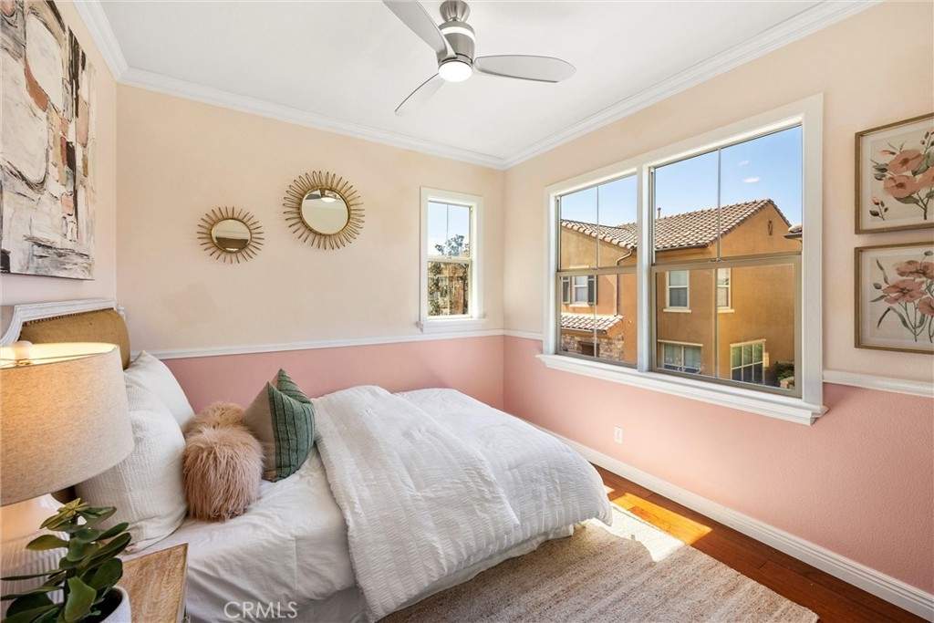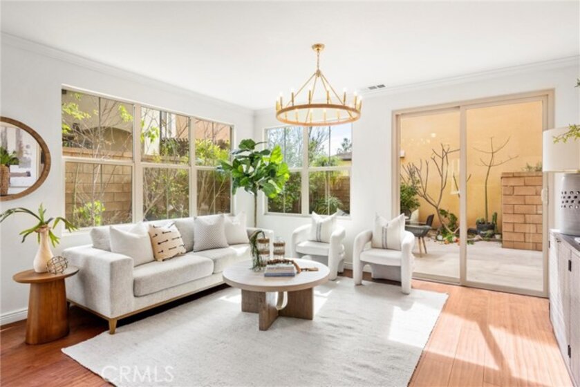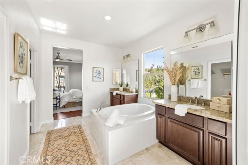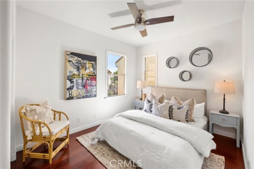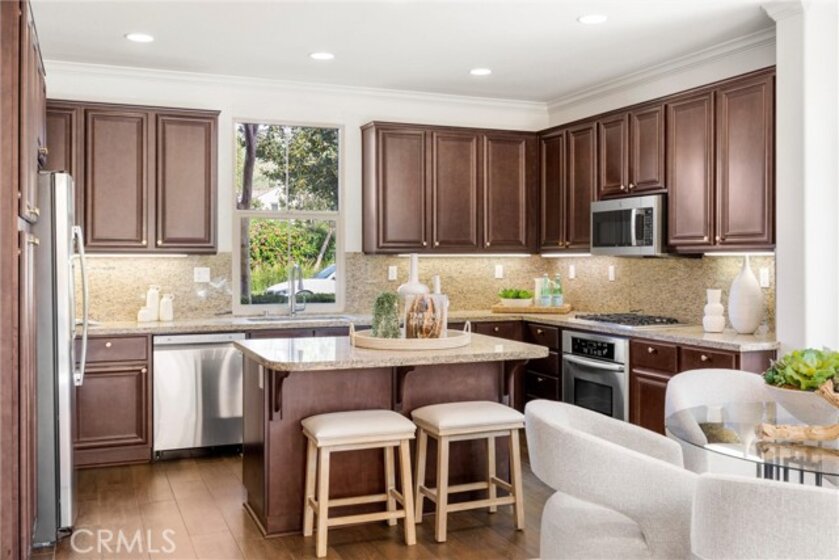 A One-of-a-Kind home, featuring a First-Level ensuite bedroom with a walk-in shower. Discover this charming cottage-style 4 Bed 3 Bath unique detached home in the prestigious Las Colinas community of Portola Springs, Irvine. Natural light flows through countless windows, creating a bright, airy atmosphere that carries throughout the open-concept living space, while botanical landscaping outside brings a peaceful, garden-like view from nearly every room. Wood flooring runs throughout the home, adding warmth and contrast to the light-filled interior. The kitchen opens seamlessly to the living and dining areas, designed for everyday comfort, featuring generous maple wood cabinetry, and timeless crown molding. Upstairs, the primary suite offers a spacious retreat, and a spa-inspired bath finished with marble flooring, dual vanities, a soaking tub set at the center, glass walk-in shower, and a spacious walk-in closet. A convenient second-floor laundry room sits nearby, thoughtfully placed for everyday ease. Additional highlights include a tankless water heater and Energy-Star efficient water softener. Scenic parks, hiking trails, olympic pools, and sports courts conveniently surround the property. Located nearby top-rated Irvine schools—including Portola Springs Elementary and Portola High—and just a short drive to Woodbury Town Center and Irvine Spectrum.