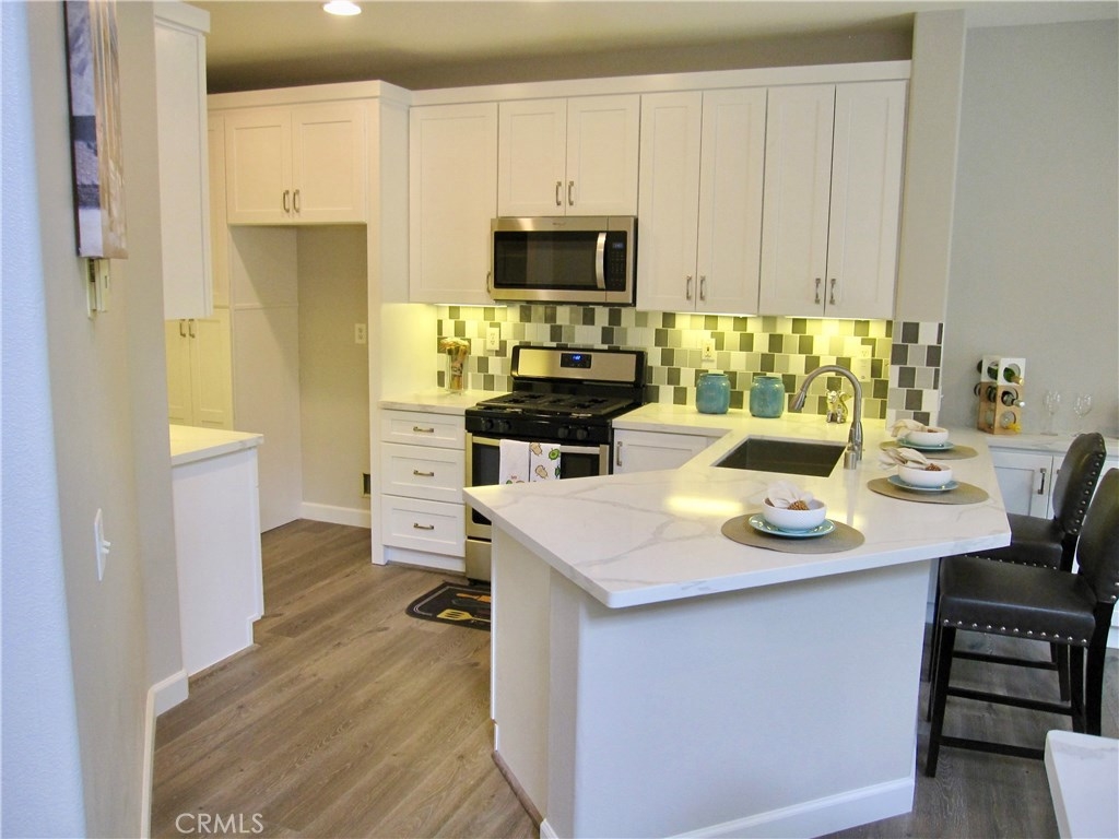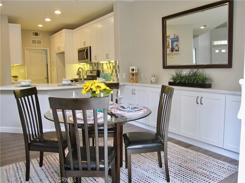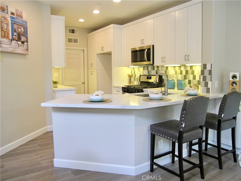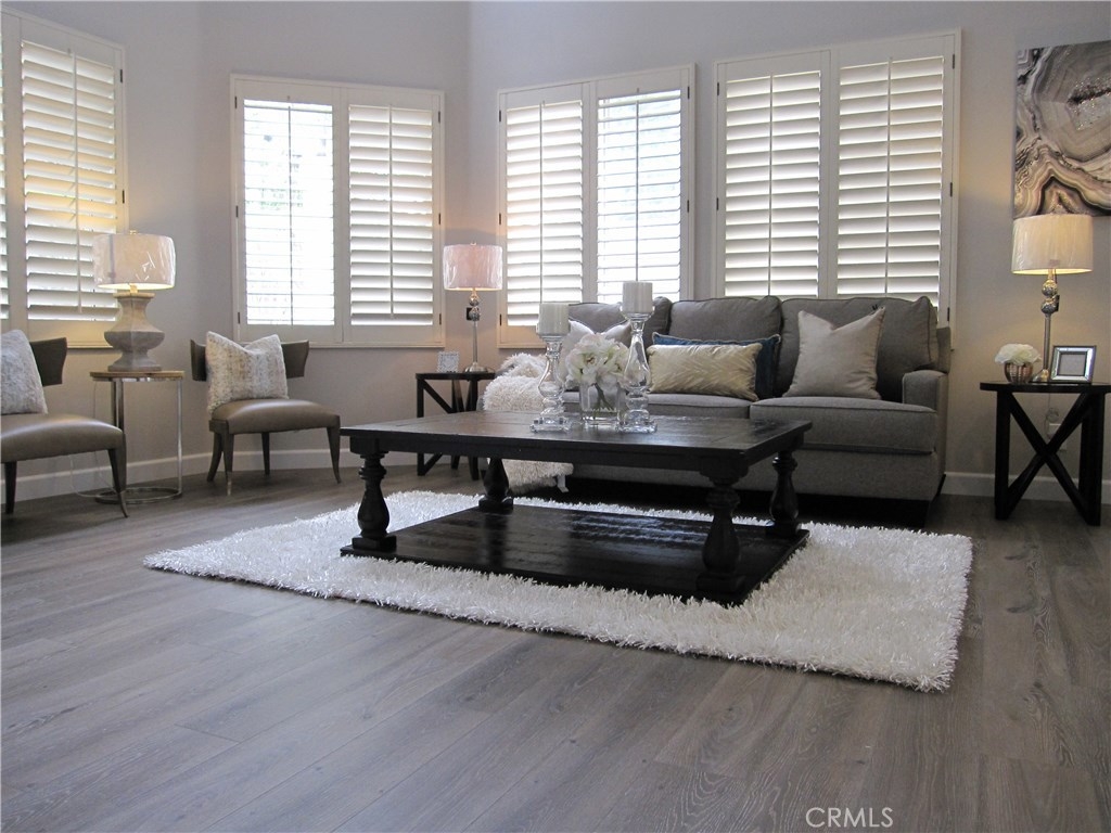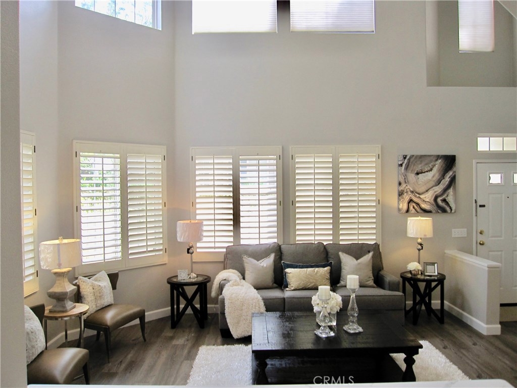 Welcome home to wow! Immaculate 3 Bedroom, 3 bath home located in prestigious gated Northwood Pointe community. Great open floor plan. Expansive living room has new waterproof laminate wood floors, soaring 18' ceilings, lots of windows bring warm natural light, fireplace, tv ready setup mount, shutters and media/storage cabinet with new quartz counter. Gather family and friends in this beautifully remodeled kitchen with new white shaker style cabinets with under lighting, glass front doors, quartz counters, tiled backsplash, new stainless appliances, deep single basin sink, fixtures and recessed lights. Dining room has a newly added row of extra cabinets. Main floor bedroom with mirrored closet doors could option as an office. Fresh interior paint & baseboards. Downstairs has all new waterproof laminate wood flooring. New carpet upstairs. Large master suite with new dual sinks shaker cabinets vanity & walk in closet. Third bedroom is updated en-suite. Indoor laundry room leads to 2 car garage. Peaceful backyard has several types of fruit trees, arbored pergola and low maintenance landscape. Situated in a prime quiet location with no unit behind. Outstanding HOA pool, spa, bbq, basketball court & tot lot. Minutes to Award winning schools including Canyon View Elementary, Sierra Vista Middle & Northwood HS. Close to shops, eateries, parks, walking/hiking/biking trails, Tustin Marketplace, Irvine Spectrum, toll roads & FWYS. Low HOA dues and mello roos.